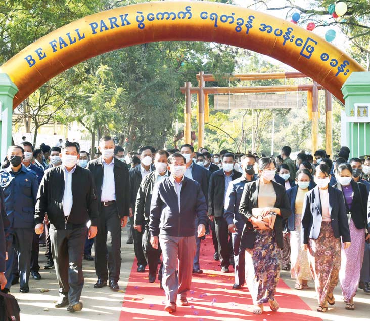 နိုင်ငံတော်စီမံအုပ်ချုပ်ရေးကောင်စီဥက္ကဋ္ဌ နိုင်ငံတော်ဝန်ကြီးချုပ် ဗိုလ်ချုပ်မှူးကြီး မင်းအောင်လှိုင် ပြင်ဦးလွင်မြို့ ပွဲကောက်ရေတံခွန်အပန်းဖြေစခန်း (B.E FALLS) အဆင့််မြှင့်တင်ဖွင့်လှစ်ခြင်း အခမ်းအနားသို့ တက်ရောက်ချီးမြှင့်
