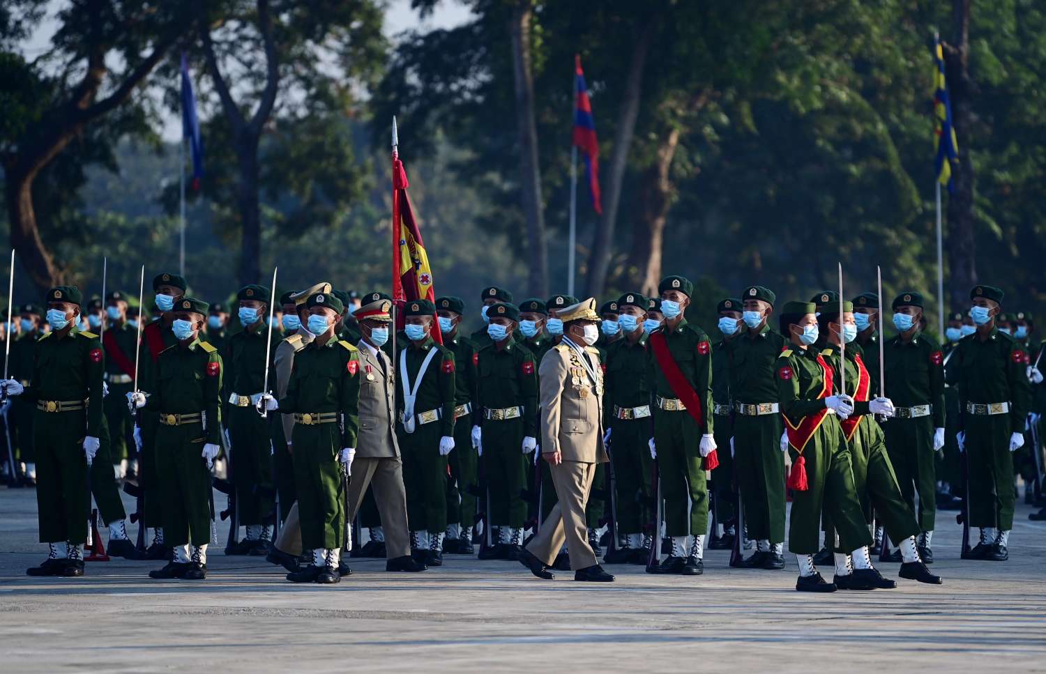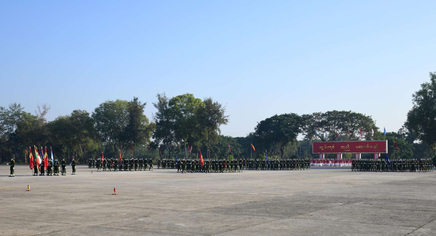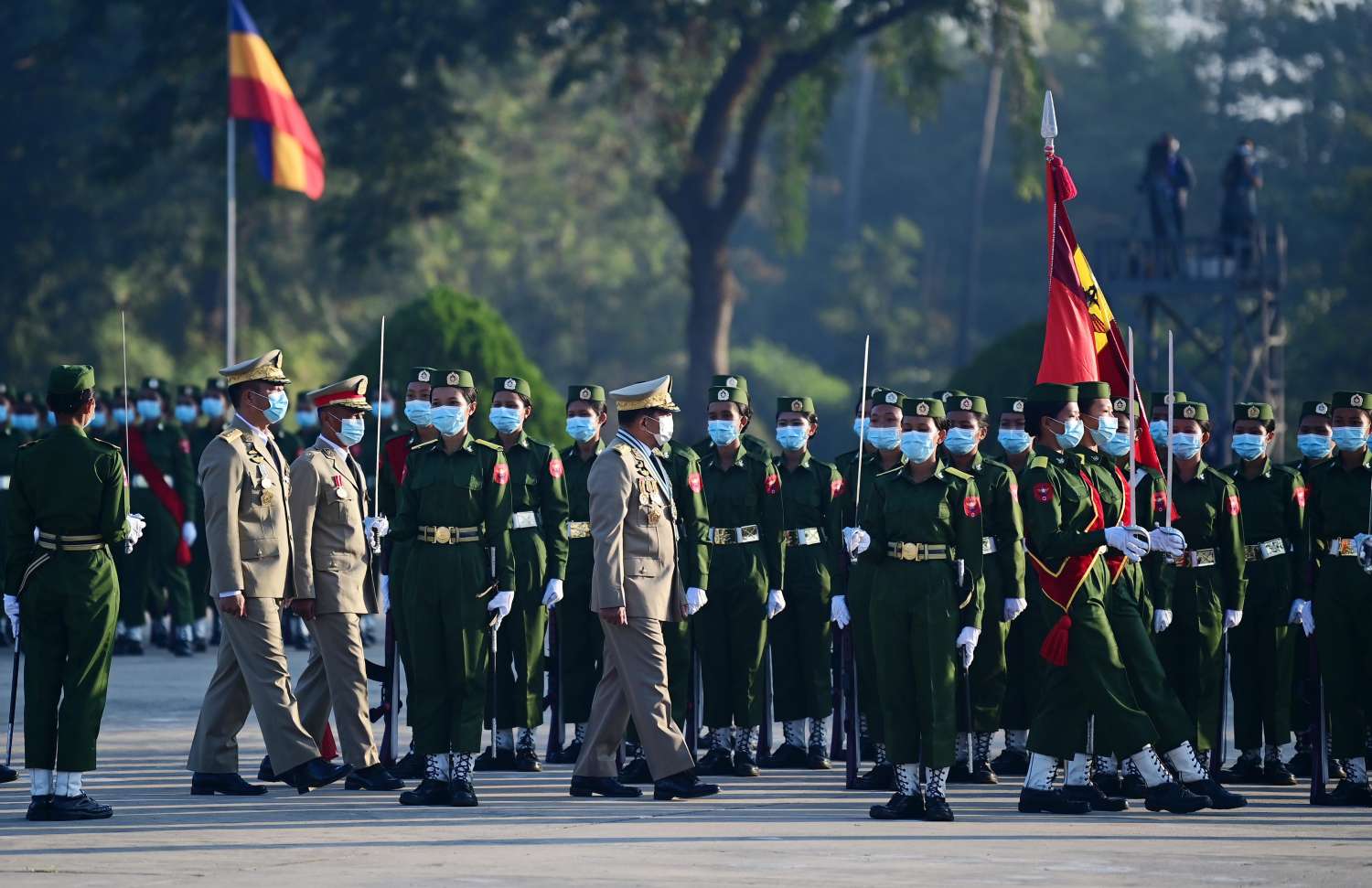 ယင်းနောက် နိုင်ငံတော်စီမံအုပ်ချုပ်ရေးကောင်စီဥက္ကဋ္ဌ၊ တပ်မတော်ကာကွယ်ရေး ဦးစီးချုပ် ဗိုလ်ချုပ်မှူးကြီး မဟာသရေစည်သူ မင်းအောင်လှိုင်သည် သင်တန်းတပ်ခွဲများ၏ အလေးပြု ခြင်းကို ခံယူပြီးနောက် စစ်ရေးပြအခမ်းအနားမှ ပြန်လည်ထွက်ခွာသည်။