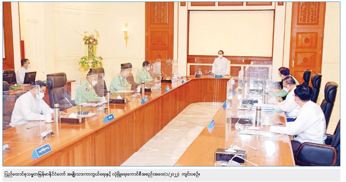 ယင်းနောက် တပ်မတော်ကာကွယ်ရေးဦးစီးချုပ်က ဖြည့်စွက်ဆွေးနွေးရာတွင် “ကျွန်တော်တို့ ပြီးခဲ့တဲ့ ကာလအတွင်းမှာ ပဋိပက္ခတွေဖြစ်ပွားတဲ့ အခါမှာ တတ်နိုင်သလောက် သွေးထွက် သံယိုမှုအနည်းဆုံး၊ အာဃာတတရားအနည်းဆုံးဖြစ်အောင် ရည်ရွယ်ပြီးတော့မှ ထိန်းသိမ်း ဆောင်ရွက်ခဲ့တာရှိပါတယ်၊ အထူးသဖြင့် ပြည်သူများကို ကာကွယ်တဲ့နေရာမှာ ပြည်သူများ အားလုံးကို ကျွန်တော်တို့ ကာကွယ်မှုမပေး နိုင်တာတော့ ရိုးသားစွာဝန်ခံပါတယ်၊ ဒါကတော့ မြန်မာနိုင်ငံရဲတပ်ဖွဲ့နဲ့ တပ်မတော်သားတွေကိုလည်း လိုအပ်တဲ့နေရာမှာ တစ်နိုင်ငံလုံး ဖြန့်ကျက်ပြီး ဆောင်ရွက်ရတဲ့အတွက်ကြောင့် ကျွန်တော်တို့ဒီမှာ ပြည်သူအားလုံးကိုလည်း အလုံးစုံကာကွယ်မှုတော့ မပေးနိုင်ခဲ့ပါဘူး၊ တချို့ပြည်နယ်နှင့် တိုင်းများဖြစ်တဲ့၊ အခုအခြေအနေ မှာ ကယားပြည်နယ်၊ ချင်းပြည်နယ်နဲ့ စစ်ကိုင်းတိုင်းအချို့မြို့နယ်တွေမှာ အကြမ်းဖက်မှု ဖြစ်စဉ်များ ရှိနေဆဲဖြစ်ပါတယ်၊ ဒါကိုလည်း အတတ်နိုင်ဆုံး ဆောင်ရွက်လျက်ရှိပါတယ်၊ အဆိုးဆုံးကတော့ အုပ်ချုပ်ရေးအဖွဲ့မှာ တာဝန်ရှိတဲ့ပုဂ္ဂိုလ်များ လုပ်ကြံသတ်ဖြတ်ခံရခြင်း ဖြစ်ပါတယ်၊ ပြည်နယ်နဲ့တိုင်းအသီးသီးမှာရှိတဲ့ မြို့နယ် ၁၀၉ မြို့နယ်မှာ ဖြစ်စဉ်ပေါင်း ၂၇၂ ကြိမ်ရှိပြီးတော့မှ လုပ်ကြံသတ်ဖြတ်ခံရသူပေါင်း ၂၈၂ ယောက်ရှိခဲ့ပါတယ်၊ တစ်ခါ ဒီထက်ဆိုး တာကတော့ ပညာရေးဝန်ထမ်းများနှင့် ကျန်းမာရေးဝန်ထမ်းများကို သတ်ဖြတ်ခြင်းဖြစ်ပါတယ်၊ ကျောင်းဆရာ၊ ဆရာမ ၃၀ ဦးကို သတ်ခဲ့တာရှိပါတယ်၊ ကျောင်းတွေမီးရှို့ဖျက်ဆီးခဲ့တာ ၅၀၄ ကြိမ်ရှိပါတယ်၊ ကျန်းမာရေးဝန်ထမ်းများကို သတ်ဖြတ်ခဲ့တာရှိပါတယ်၊ တိုက်ခိုက်ခဲ့တာ ရှိပါတယ်၊ ဒါကြောင့်အများပြည်သူတွေရဲ့ လူမှုစီးပွားဘဝတိုးတက်ရေးအတွက် အဓိက လိုအပ်ချက်ဖြစ်တဲ့ ပညာသင်ကြားရေးနဲ့ ကျန်းမာရေးစောင့်ရှောက်မှု လုပ်ငန်းတွေဒီထက်ပိုပြီး ထိထိရောက်ရောက် ဆောင်ရွက်နိုင်ဖို့အတွက် အချိန်တစ်ခုပေးပြီးတော့ ဆောင်ရွက်ဖို့လိုအပ် ပါတယ်၊ ဒါလည်း ကောင်စီဝင်များအနေနဲ့ ထည့်သွင်းစဉ်းစားပြီးတော့မှထားဖို့ တင်ပြ လိုပါတယ်၊ ထောက်ခံတင်ပြပေးတဲ့အတွက်လည်း ကျွန်တော်ကျေးဇူးတင်ပါတယ်၊ ဒါပေမယ့် လုပ်ဆောင်ရတဲ့ လုပ်ငန်းပမာဏကလည်း တော်တော်လေး ကြီးမားပါတယ်၊ အခုဆိုရင်လည်း ကိုဗစ်နဲ့ပတ်သက်ပြီးတော့ ကျွန်တော်တို့ ထိန်းချုပ်နိုင်ပြီဆိုသော်လည်းပဲ အိုမီခရွမ်တွေ့ရှိမှု ကလည်းရှိနေပါတယ်၊ တွေ့ရှိမှုရှိတဲ့အတွက်ကြောင့် ဒါကိုလည်းသတိကြီးစွာထားပြီး ဆောင်ရွက် ရမှာ ဖြစ်ပါတယ်၊ ဒါကိုထိန်းချုပ်နိုင်ဖို့အတွက် တစ်ဖက်က နေထိုင်မှုစည်းကမ်းတွေကို ထိန်းချုပ် သလိုပဲ တစ်ဖက်ကကာကွယ်ခြင်း ကုသခြင်းအပိုင်းတွေ၊ လိုအပ်တဲ့ပစ္စည်းတွေ၊ ဆေးဝ