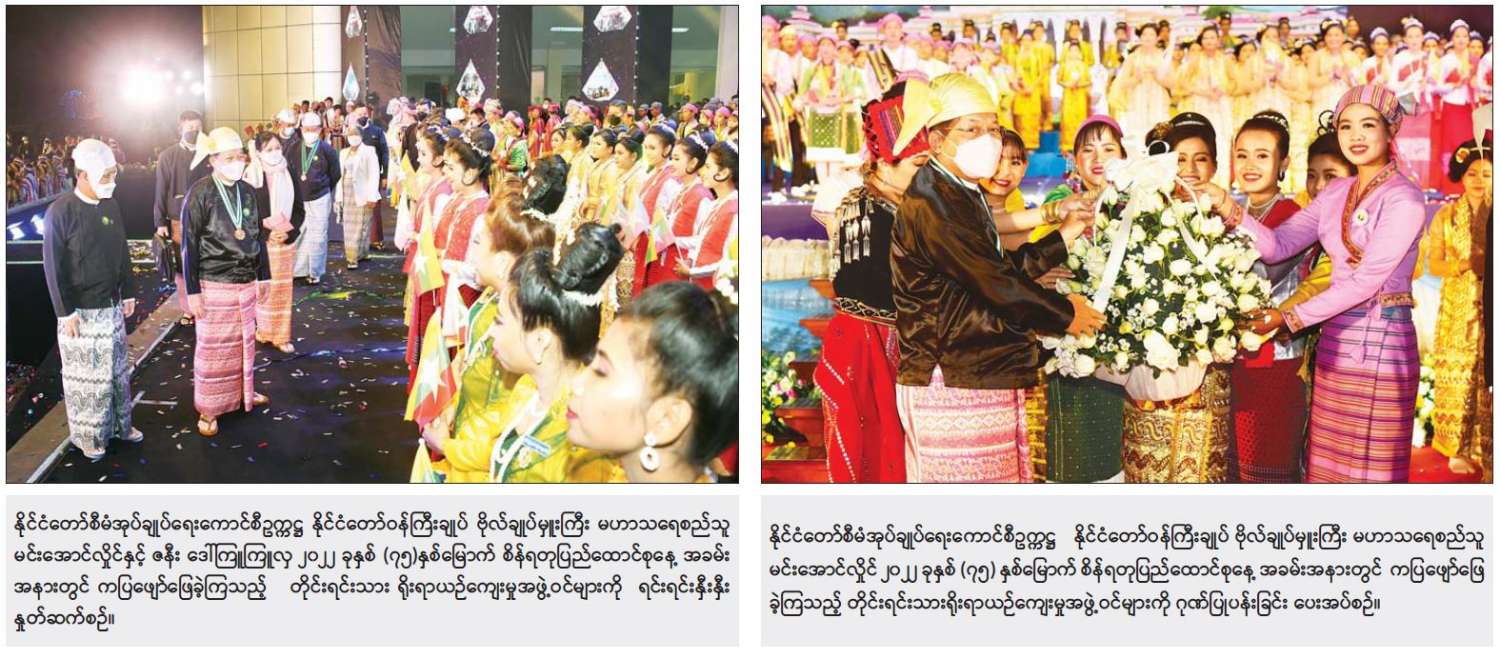 ဖျော်ဖြေတင်ဆက်မှုများအပြီးတွင် နိုင်ငံတော်စီမံအုပ်ချုပ်ရေးကောင်စီဥက္ကဋ္ဌ နိုင်ငံတော် ဝန်ကြီးချုပ် ဗိုလ်ချုပ်မှူးကြီး မဟာသရေစည်သူ မင်းအောင်လှိုင်နှင့်ဇနီး ဒေါ်ကြူကြူလှတို့သည် ၂၀၂၂ ခုနှစ် (၇၅) နှစ်မြောက် စိန်ရတုပြည်ထောင်စုနေ့ အခမ်းအနားတွင် ကပြဖျော် ဖြေခဲ့ကြသည့် တိုင်းရင်းသားရိုးရာယဉ်ကျေးမှုအဖွဲ့ဝင်များကို ရင်းရင်းနှီးနှီး နှုတ်ဆက်ကြသည်။