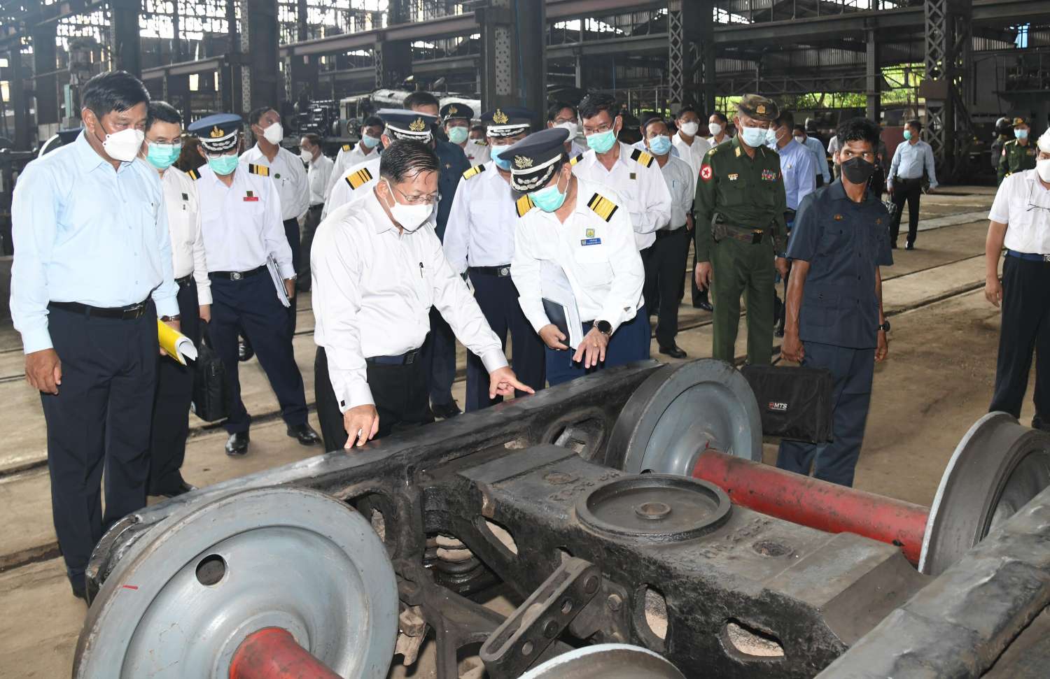 ယင်းနောက် နိုင်ငံတော်စီမံအုပ်ချုပ်ရေးကောင်စီဥက္ကဋ္ဌ နိုင်ငံတော်ဝန်ကြီးချုပ်နှင့်အဖွဲ့ဝင်များသည် မီးရထားစက်ခေါင်းစက်ရုံအတွင်း မီးရထားစက်ခေါင်းများထုတ်လုပ် တပ်ဆင်နေမှု၊ ပြုပြင်ထိန်းသိမ်းနေမှု၊ စက်ခေါင်းစွမ်းအားမြှင့်တင်နေမှု၊ ရေနွေးငွေ့စက်ခေါင်းအား ကျောက်မီးသွေးသုံးစက်ခေါင်းအဖြစ်ပြုပြင်နေမှု၊ မီးရထားစက်ခေါင်းအရံပစ္စည်းများ ထုတ်လုပ် ထားရှိမှုအခြေအနေများကို လှည့်လည်ကြည့်ရှုစစ်ဆေးရာ တာဝန်ရှိသူများက လိုက်လံရှင်းလင်းတင်ပြကြသည်။