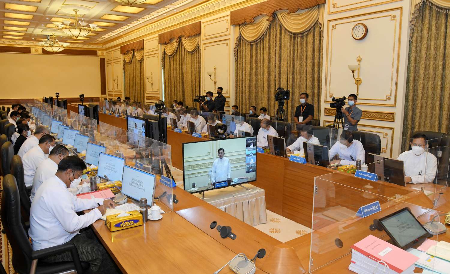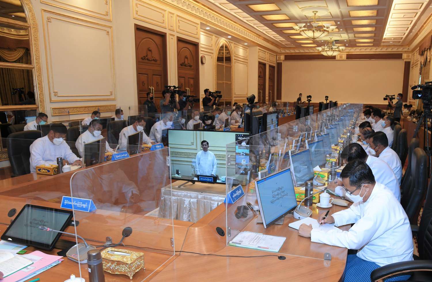 အစည်းအဝေးသို့ နိုင်ငံတော်စီမံအုပ်ချုပ်ရေးကောင်စီ ဒုတိယဥက္ကဋ္ဌ ဒုတိယဝန်ကြီးချုပ် ဒုတိယဗိုလ်ချုပ်မှူးကြီး စိုးဝင်းနှင့် ပြည်ထောင်စုဝန်ကြီးများ တက်ရောက်ကြပြီး နေပြည်တော်ကောင်စီဥက္ကဋ္ဌ၊ တိုင်းဒေသကြီးနှင့် ပြည်နယ်ဝန်ကြီးချုပ်များက Video Conferencing စနစ်ဖြင့် တက်ရောက်ကြသည်။