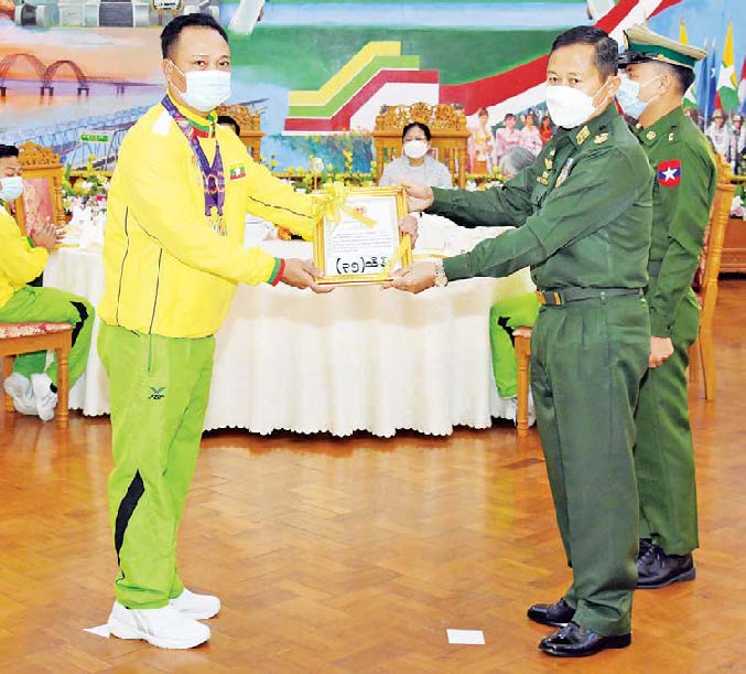 နိုင်ငံတော်နှင့်တပ်မတော်အတွက် စွမ်းစွမ်းတမံ ရေကုန်ရေခန်း ယှဉ်ပြိုင်ခဲ့ကြသည့် တပ်မတော်သားအားကစားသမားများကို ထိုက်သင့်သည့် ချီးမြှောက်မှုများ ပြုလုပ်ပေးလျက်ရှိ