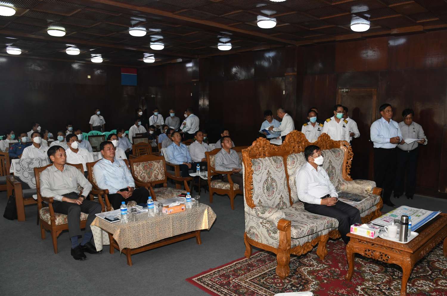 ဦးစွာ အစည်းအဝေးခန်းမတွင် ပို့ဆောင်ရေးနှင့်ဆက်သွယ်ရေးဝန်ကြီးဌာန ပြည်ထောင်စုဝန်ကြီး ဗိုလ်ချုပ်ကြီး တင်အောင်စန်း၊ လျှပ်စစ်စွမ်းအားဝန်ကြီးဌာနနှင့် စွမ်းအင်ဝန်ကြီးဌာန ပြည်ထောင်စုဝန်ကြီး ဦးသောင်းဟန်နှင့် တာဝန်ရှိသူတို့က ပင်မသိုလှောင် ဖြန့်ဖြူးရေးဌာနကြီး၊ ရန်ကုန်(ဓနိတော)၏ သမိုင်းအကျဉ်း၊ သိုလှောင်နိုင်မှုအခြေအနေများ၊ ရာသီဥတုကြောင့် ဓနိတောဆိပ်ခံတံတား ပျက်စီးခဲ့ရမှုနှင့် ပြန်လည်ပြင်ဆင် ဆောင်ရွက်နေမှုအခြေအနေများ၊ ပို့ဆောင်ရေးနှင့်ဆက်သွယ်ရေးဝန်ကြီးဌာန၊ မြန်မာ့မီးရထားမှ သိုလှောင်ကန်များနှင့် ဆိပ်ခံဘောတံတား ငှားရမ်းသုံးစွဲခဲ့မှုအခြေအနေများ၊ မြန်မာ့မီးရထားမှ ဒီဇယ်ဆီဝယ်ယူရရှိမှု အခြေအနေများ၊ မြန်မာ့ဆိပ်ကမ်း အာဏာပိုင်ဝန်ထမ်းအိမ်ရာများ ဆောက်လုပ်ထားရှိမှု အခြေအနေများကို ရှင်းလင်းတင်ပြရာ နိုင်ငံတော်စီမံအုပ်ချုပ်ရေးကောင်စီဥက္ကဋ္ဌ နိုင်ငံတော်ဝန်ကြီးချုပ်က ဆိပ်ကမ်းနယ်မြေဖြစ်၍ စနစ်တကျရှိစေရေးနှင့် လိုအပ်သည်များကို မှာကြားသည်။