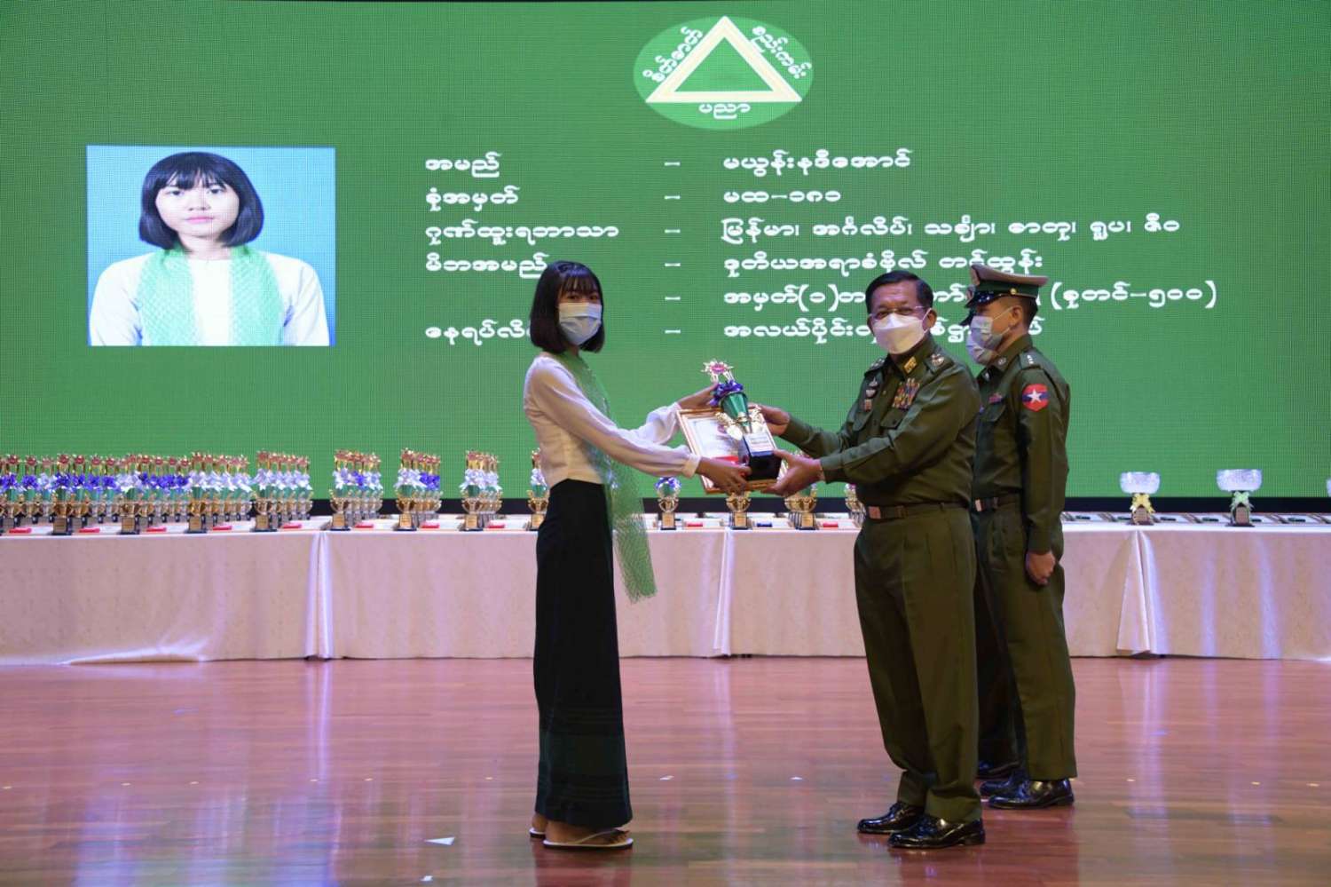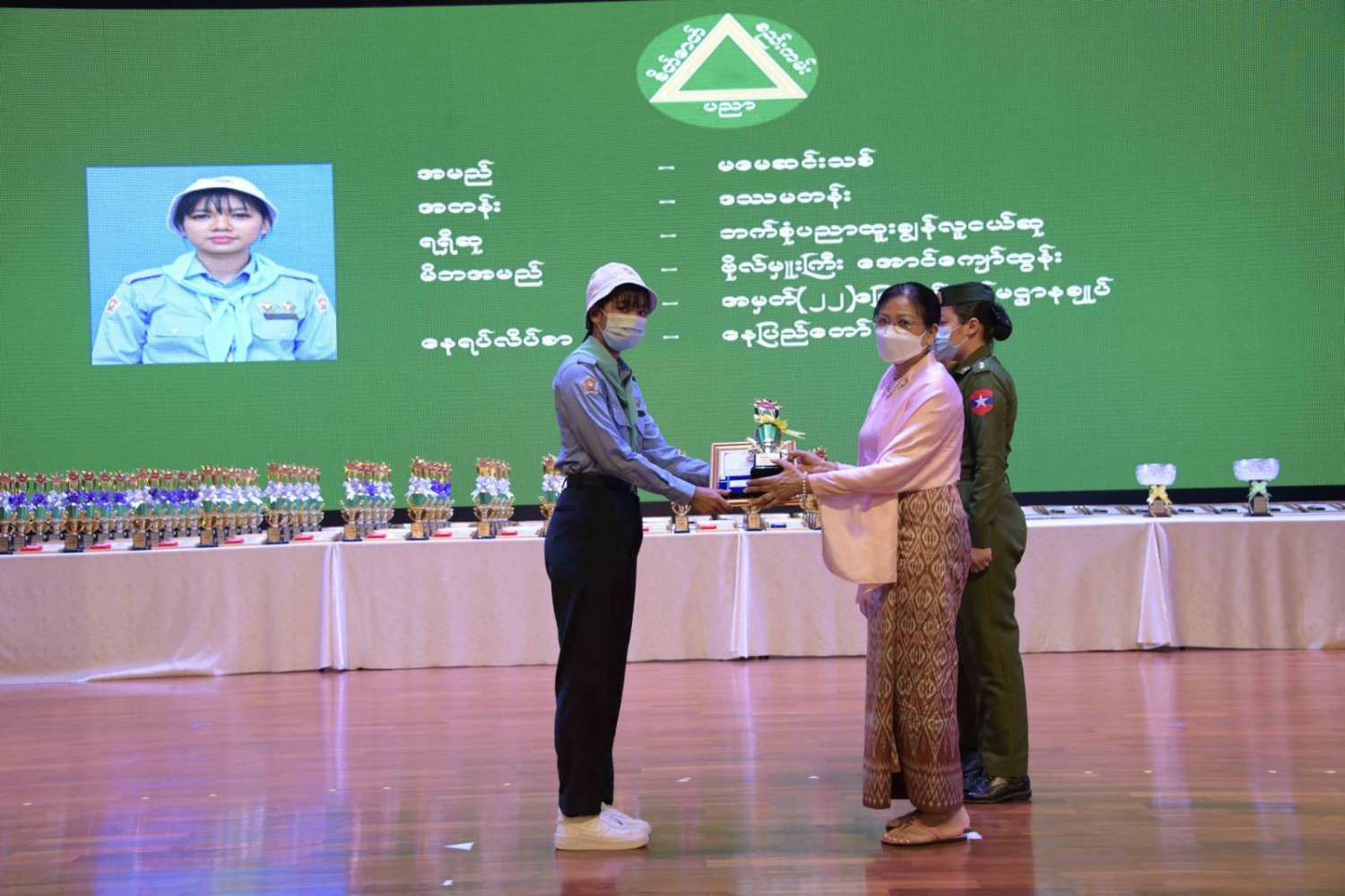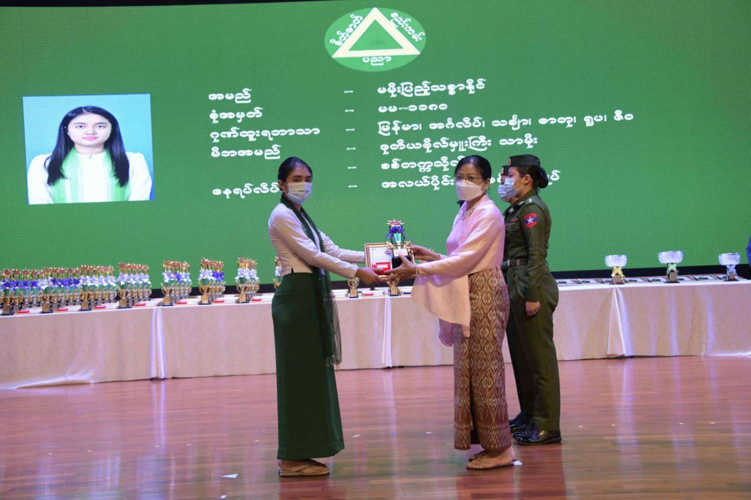 နိုင်ငံတော်စီမံအုပ်ချုပ်ရေးကောင်စီဒုတိယဥက္ကဋ္ဌ၊ ဒုတိယတပ်မတော်ကာကွယ်ရေး ဦးစီးချုပ်ကာကွယ်ရေးဦးစီးချုပ် (ကြည်း)၏ ဇနီး ဒေါ်သန်းသန်းနွယ် က ဘက်စုံပညာ ထူးချွန်ဆုရရှိသူ ဗိုလ်မှူးကြီး နေဝင်းအောင်၏ သမီး မမေပီတိအောင်၊ အရာခံဗိုလ် အောင်ကြည်၏သား မောင်ရန်လင်းအောင်၊ ဗိုလ်ကြီး မင်းဝေ(အငြိမ်းစား)၏ သမီး မဖူးပြည့်ကိုကို၊ ဒုတိယအရာခံဗိုလ်/စာရေး ဆန်းမင်းဦး ၏ သမီး မခိုင်ခိုင်မင်းဦး၊ တပ်ကြပ်ကြီး/သားဖွား ဒေါ်မိုးစန္ဒာ၏ သမီး မခင်သံသာ၊ ၂၀၂၁-၂၀၂၂ ပညာသင်နှစ် တွင် (၆)ဘာသာဂုဏ်ထူးဖြင့် ထူးချွန်စွာအောင်မြင်ခဲ့သည့် ဗိုလ်မှူးကြီး ဇော်လွင်၏ သမီး မသင်းမြတ်ရတီ၊ ဒုတိယဗိုလ်မှူးကြီး သိန်းစိုးထွန်း၏ သမီး မမြင့်မြတ်သူ၊ အရာခံဗိုလ် ကြည်စိုး၏ သမီး မသန့်ရတီအောင်၊ ဒုတိယအရာခံဗိုလ်/စာရေး မင်းကြည်လေး၏ သမီး မသူသူနှင်း၊ ဗိုလ်ကြီး အောင်ရဲထွန်း(အငြိမ်းစား)၏ သမီး မမြသက်ချယ်တို့အား ဂုဏ်ပြုတံဆိပ်၊ ဂုဏ်ပြုဆုနှင့် ဂုဏ်ပြုမှတ်တမ်းလွှာများ ပေးအပ်သည်။