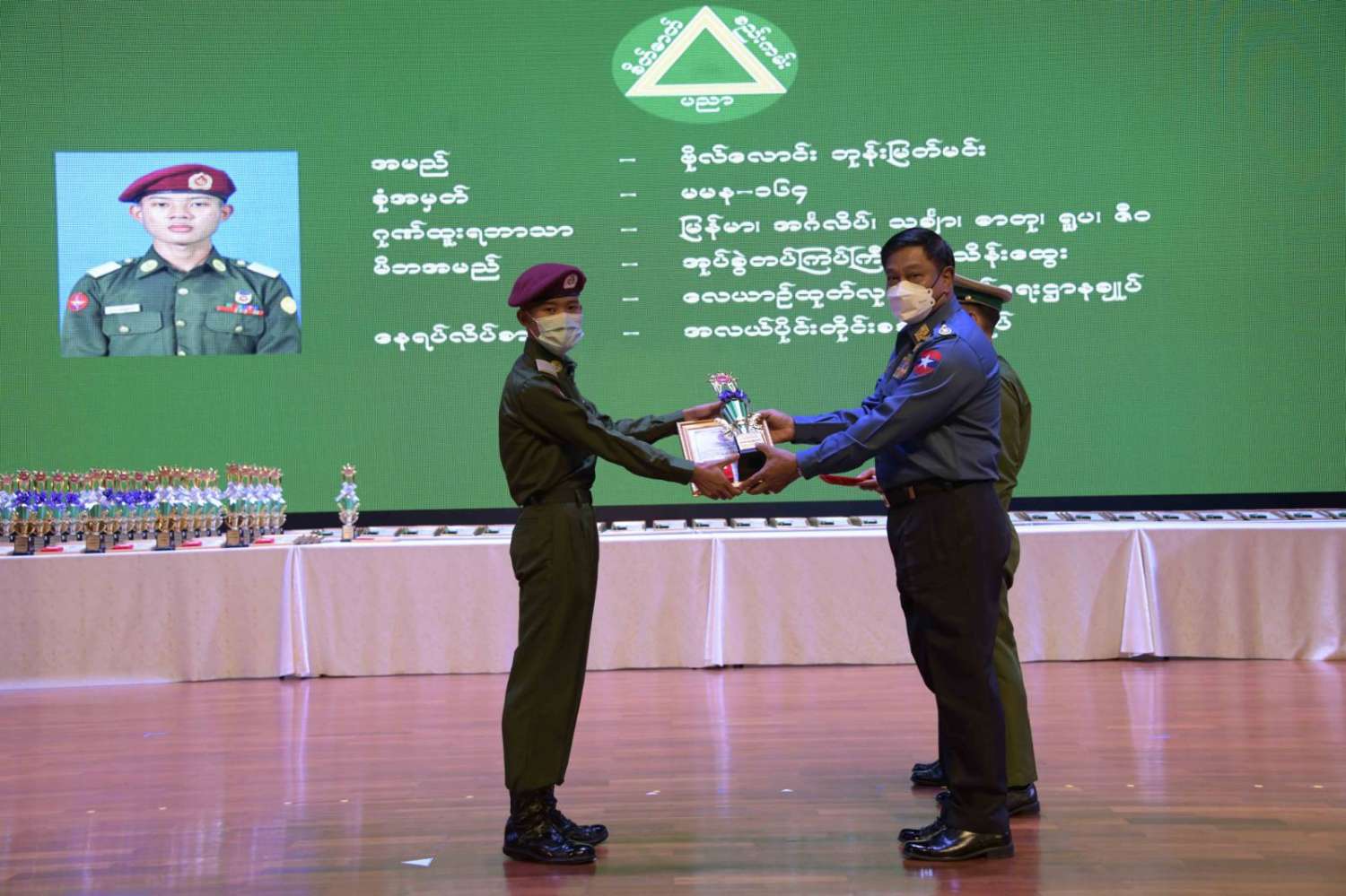 ထို့နောက် နိုင်ငံတော်စီမံအုပ်ချုပ်ရေးကောင်စီဥက္ကဋ္ဌ တပ်မတော်ကာကွယ်ရေးဦးစီးချုပ်၏ ဇနီး ဒေါ်ကြူကြူလှက ဘက်စုံပညာထူးချွန်လူငယ်ဆုရရှိသည့် တပ်ကြပ်ကြီး/စာရေး တင်နိုင်၏ သမီး မရွှန်းလဲ့မောင်၊ ဗိုလ်မှူးကြီး အောင်ကျော်ထွန်း၏ သမီး မမေဆင်းသစ်၊ ဒုတိယအရာခံဗိုလ်သန်းဇော်၏ သမီး မရွှေပြည့်လျှံဦး၊ ဒုတိယဗိုလ်မှူးကြီး တင်ဇော်လတ်၏ သားမောင်မြတ်မင်းသန့်၊ စစ်သည်အစားခန့် အရပ်သားဝန်ထမ်း ဒေါ်ဆွေဆွေဝင်း၏ သမီးမမြတ်မိုးသူ၊ ၂၀၂၁-၂၀၂၂ ပညာသင်နှစ် တွင်(၆)ဘာသာဂုဏ်ထူးဖြင့် ထူးချွန်စွာအောင်မြင်ခဲ့သည့် ဒုတိယဗိုလ်မှူးကြီး သာမိုး၏ သမီး မမိုးပြည့်သစ္စာနိုင်၊ ဒုတိယဗိုလ်မှူးကြီး သာထူးဝင်း၏ သမီး မညိုလဲ့နဒီ၊ ဗိုလ်မှူးကြီး မင်းမင်းထွန်း၏ သား မောင်ဟိန်းထက်ဇော်၊ ဒုတိယဗိုလ်မှူးကြီး ကျော်ဇင်ဝင်း၏ သားမောင်ရန်နိုင်အောင်၊ စစ်သည်အစားခန့် အရပ်သားဝန်ထမ်း ဦးအောင်မြင့်၏ သမီး မယွင်ဝေသာလီတို့အား ဂုဏ်ပြုတံဆိပ်၊ ဂုဏ်ပြုဆုနှင့် ဂုဏ်ပြုမှတ်တမ်းလွှာများပေးအပ်သည်။