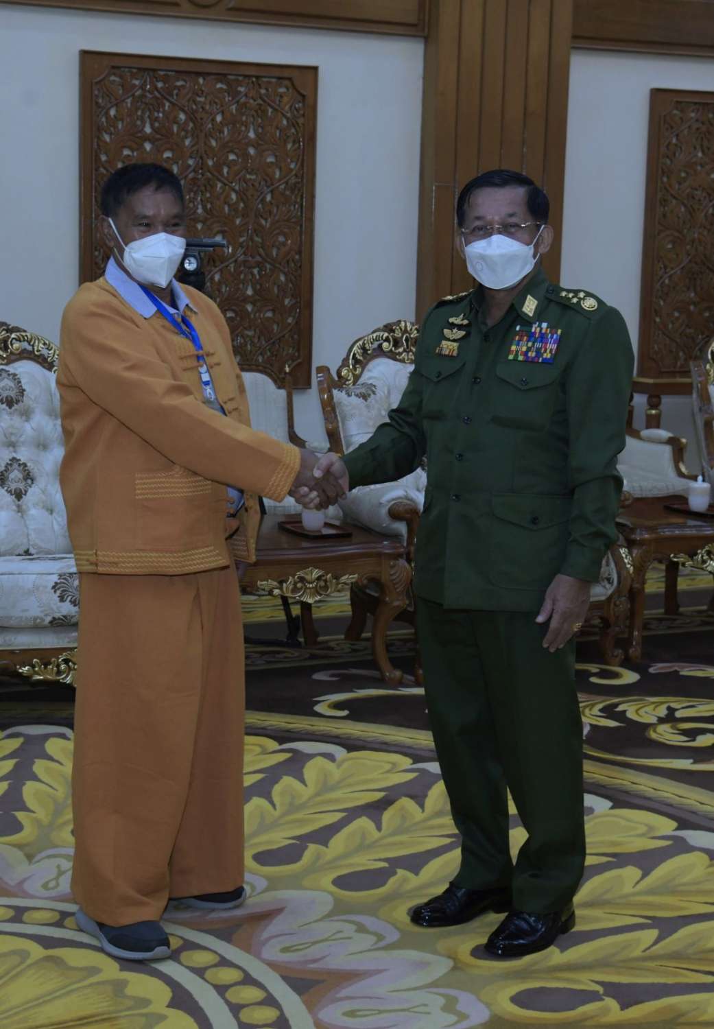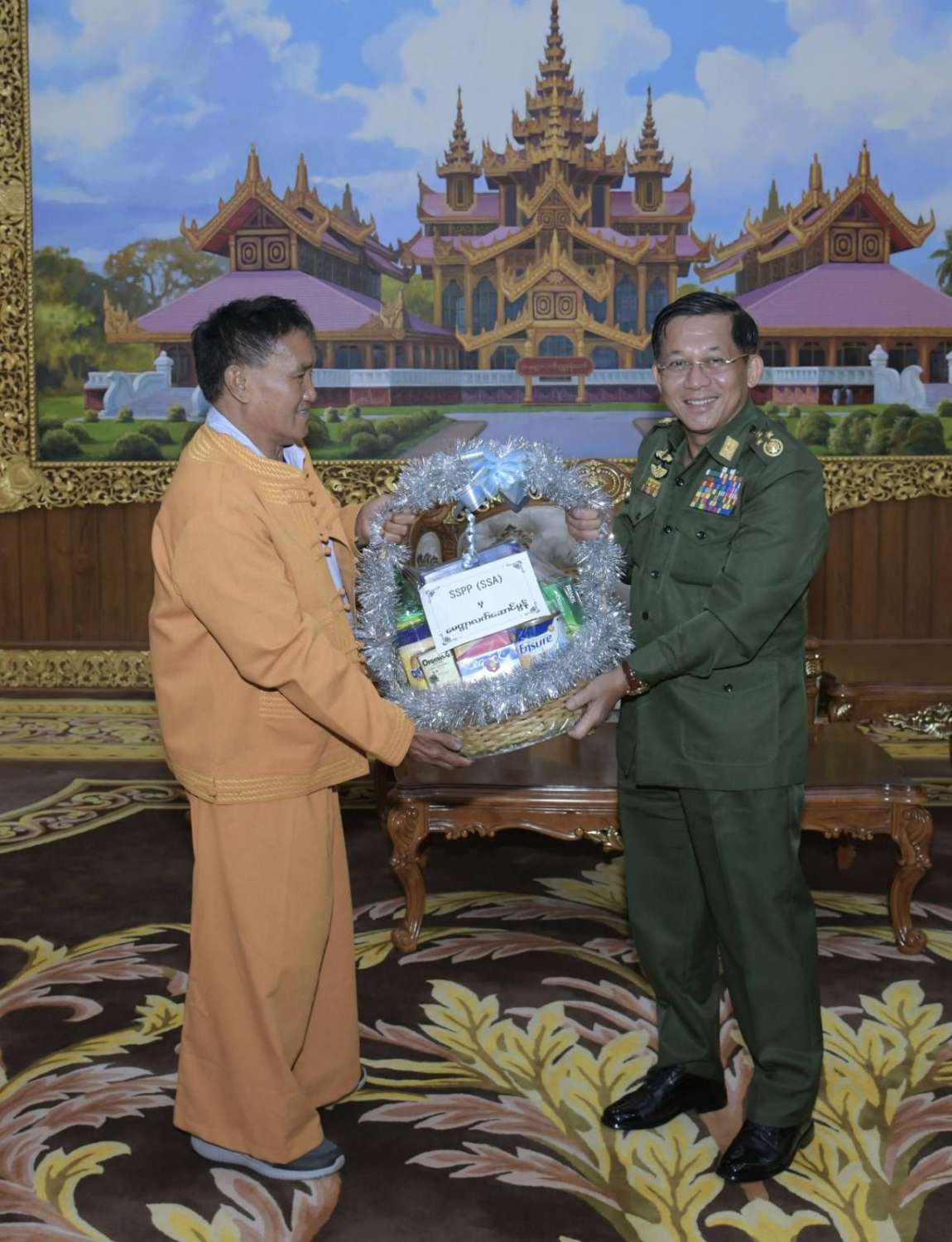 တွေ့ဆုံပွဲအပြီးတွင် နိုင်ငံတော်စီမံအုပ်ချုပ်ရေးကောင်စီဥက္ကဋ္ဌ တပ်မတော်ကာကွယ်ရေးဦးစီးချုပ်က ရှမ်းပြည်တိုးတက်ရေးပါတီ(SSPP)မှ ဒုတိယဥက္ကဋ္ဌ (၁)နှင့် အဖွဲ့ဝင်များအား အမှတ်တရလက်ဆောင်ပစ္စည်းများပေးအပ်ရာ ရှမ်းပြည်တိုးတက်ရေးပါတီ(SSPP)မှ ဒုတိယဥက္ကဋ္ဌ(၁)မှ ဒေသထွက်လက်ဆောင်ပစ္စည်းများကို ပြန်လည်ပေးအပ်ခဲ့ပြီး အမှတ်တရစုပေါင်းဓာတ်ပုံရိုက်ကြသည်။