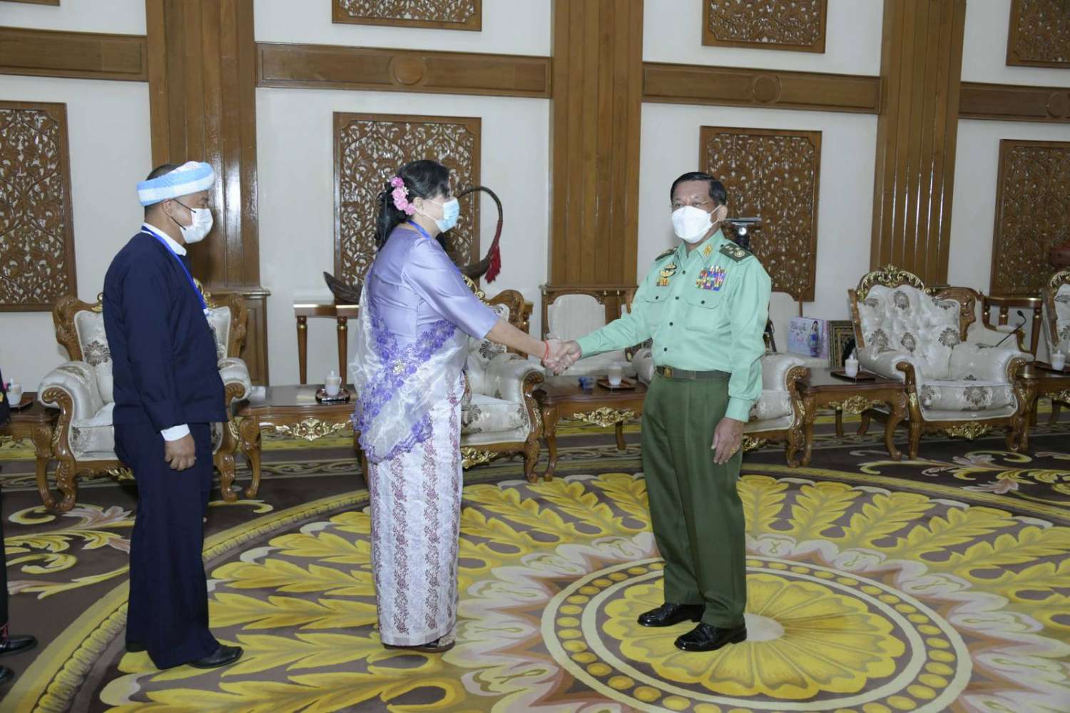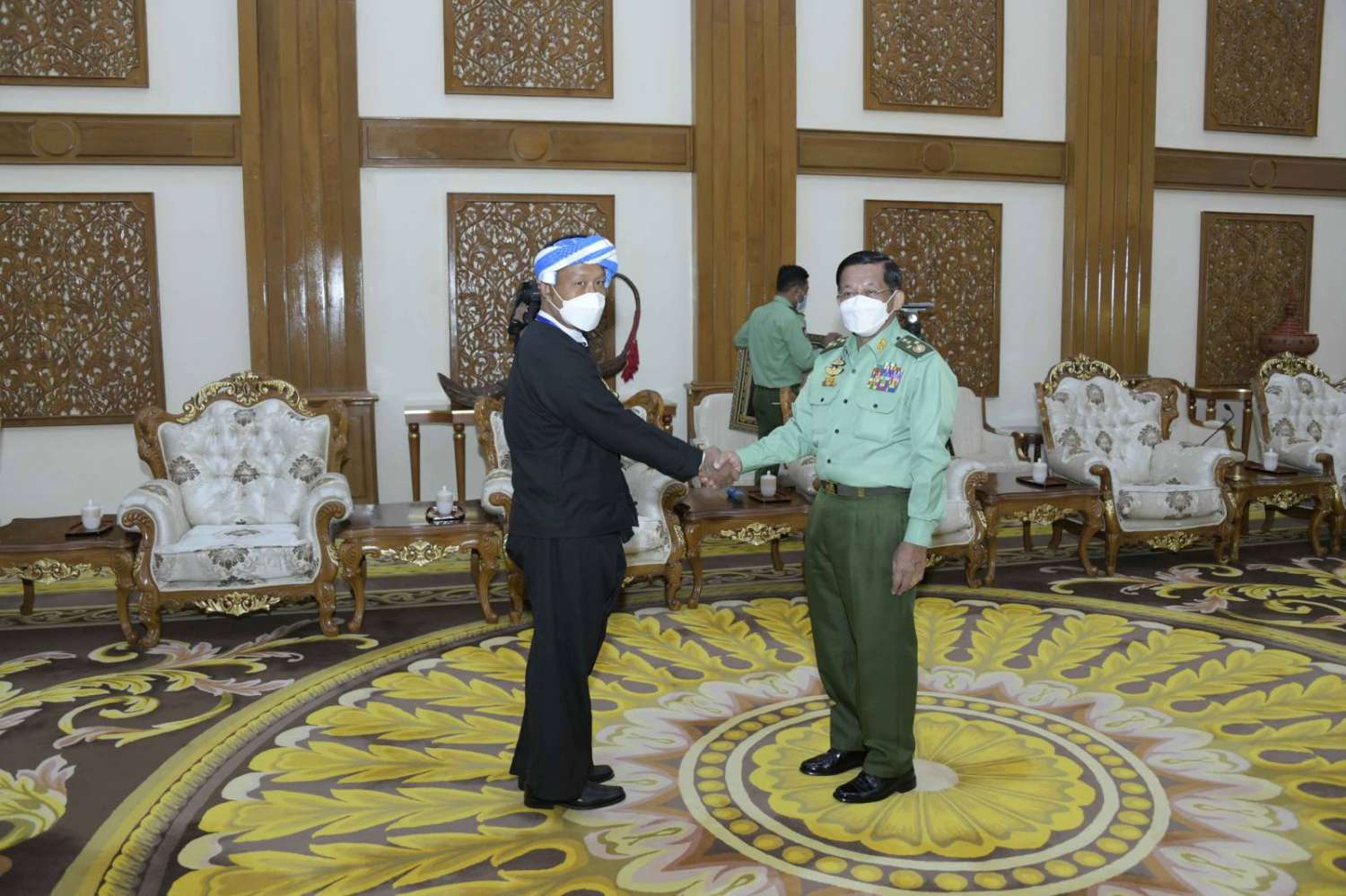 နိုင်ငံတော်စီမံအုပ်ချုပ်ရေးကောင်စီဥက္ကဋ္ဌ တပ်မတော်ကာကွယ်ရေးဦးစီးချုပ် ဗိုလ်ချုပ်မှူးကြီး မင်းအောင်လှိုင်သည် ပအိုဝ်းအမျိုးသားလွတ်မြောက်ရေးအဖွဲ့ချုပ် (PNLO)ဥက္ကဋ္ဌ ခွန်သူရိန်၊ လားဟူဒီမိုကရက်တစ်အစည်းအရုံး(LDU)ဥက္ကဋ္ဌ ကျောဆော်လမွန်နှင့် ရခိုင်ပြည် လွတ်မြောက်ရေးပါတီ (ALP) ဒုတိယဥက္ကဋ္ဌ စောမြရာဇာလင်းတို့ ဦးဆောင်သည့် ငြိမ်းချမ်းရေး ကိုယ်စားလှယ်အဖွဲ့အား ယနေ့နံနက်ပိုင်းတွင် နေပြည်တော်ရှိ ဘုရင့်နောင်ရိပ်သာ ဧည့်ခန်းမဆောင်၌ တွေ့ဆုံ၍ ငြိမ်းချမ်းရေးဆိုင်ရာ ကိစ္စရပ်များ ဆွေးနွေးသည်။