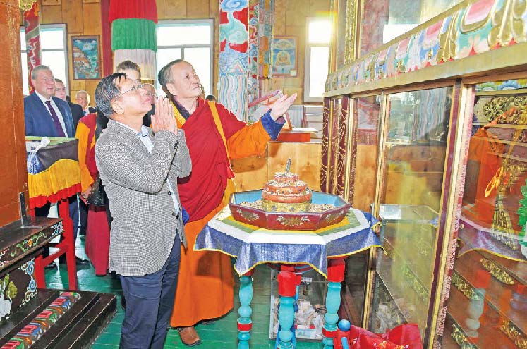ထို့နောက် နိုင်ငံတော်စီမံအုပ်ချုပ်ရေးကောင်စီဥက္ကဋ္ဌ နိုင်ငံတော်ဝန်ကြီးချုပ်နှင့် အဖွဲ့ဝင်များသည် Ivolginsky Dastan ဘုန်းတော်ကြီးကျောင်းသို့ရောက်ရှိကြရာ မဟာယနဗုဒ္ဓဘာသာခေါင်းဆောင် Damba Bandmaeich Ayusheev နှင့် သံဃာတော်များက ကြိုဆိုနှုတ်ဆက်ကြပြီး ကျောင်းတော်အတွင်း ဗုဒ္ဓသာသနာတော်ဆိုင်ရာ ဆောင်ရွက်နေမှုများကို လိုက်လံရှင်းလင်းပြသသည်။