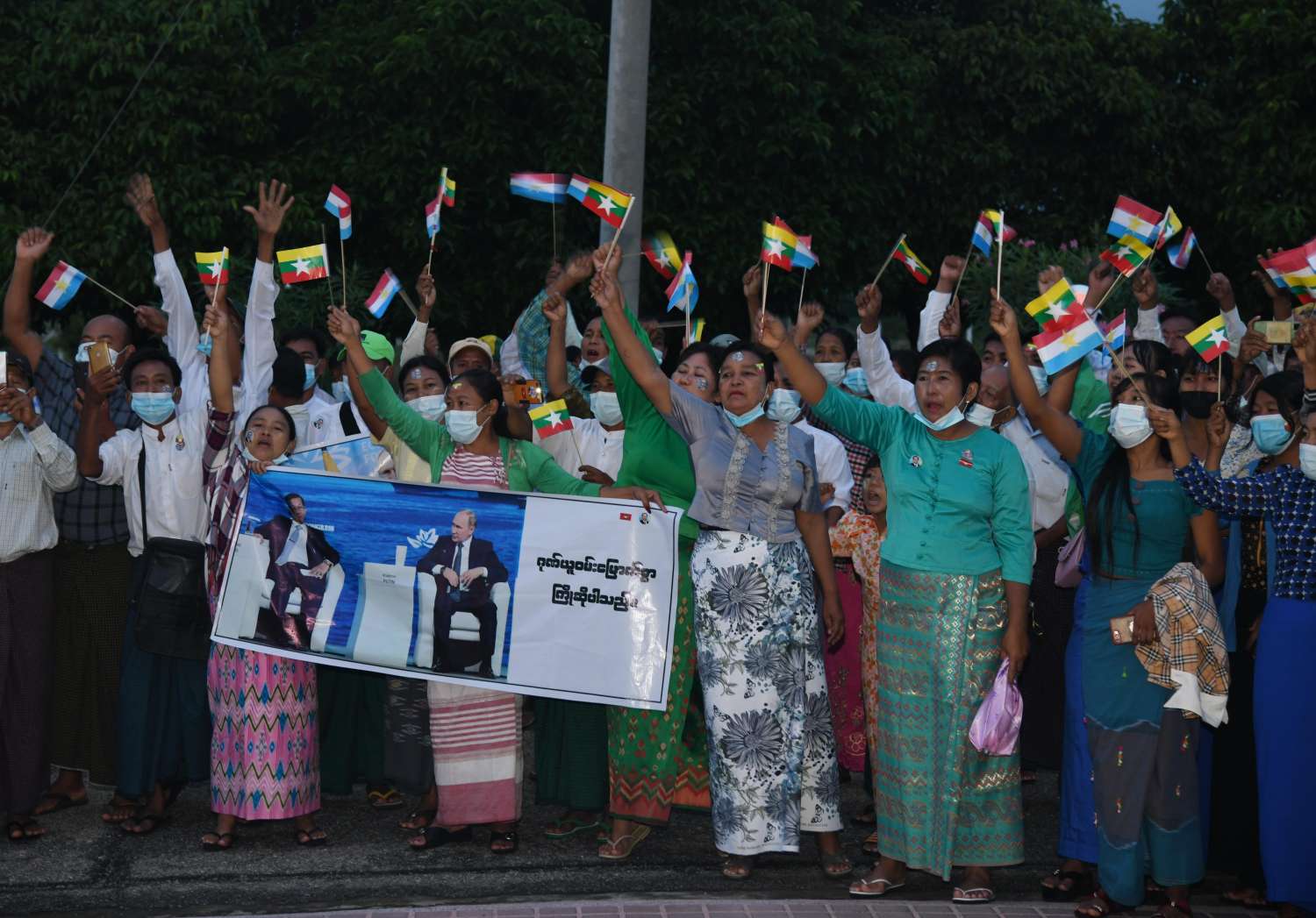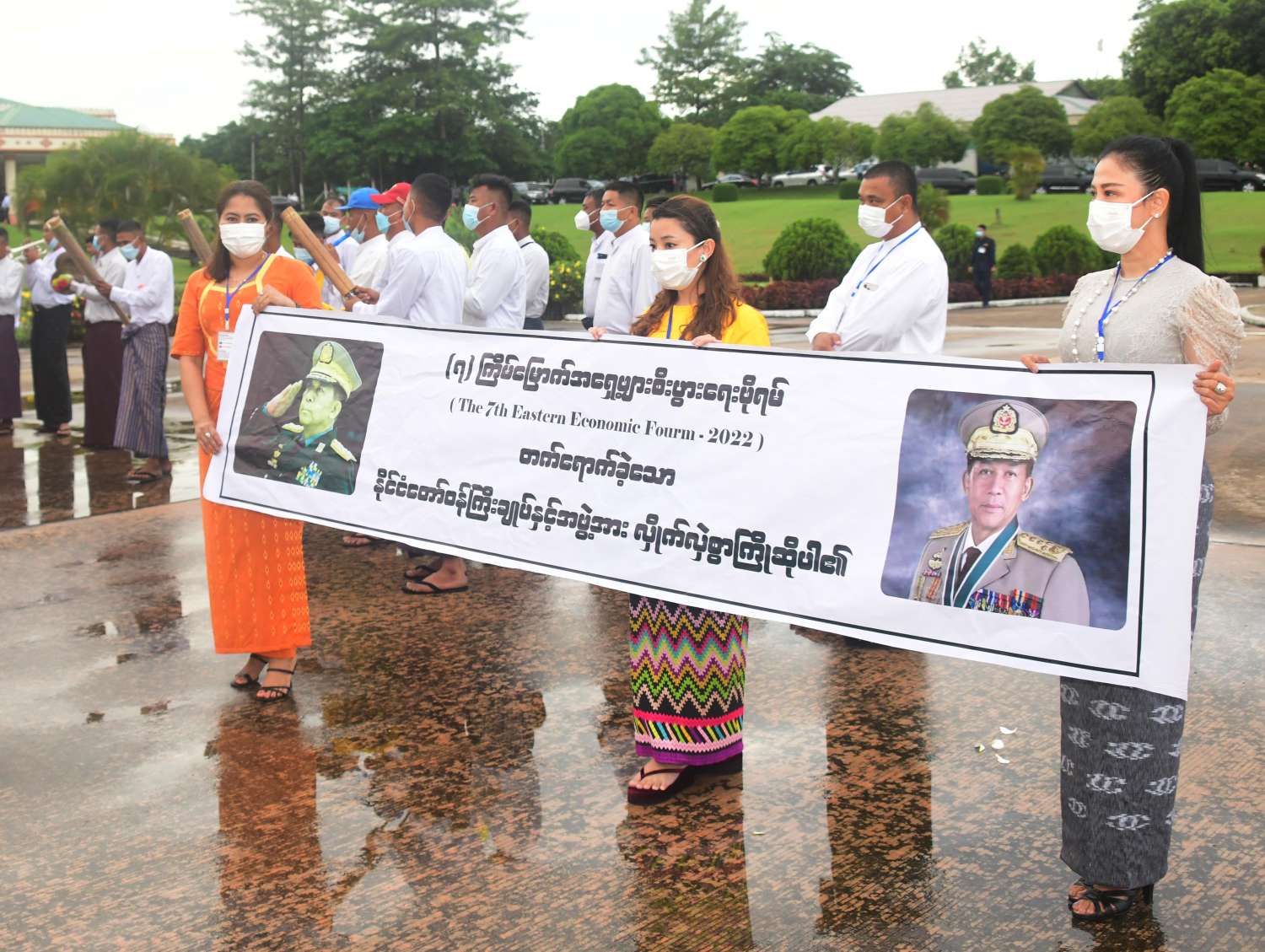 ထို့ပြင် နိုင်ငံတော်ဖွံ့ဖြိုးတိုးတက်ရေးကို တစိုက်မတ်မတ်ဦးတည်၍ ခရီးစဉ်အတွင်း နေ့မအားညမနားဖြင့် နှစ်နိုင်ငံအကြား ချစ်ကြည်ရင်းနှီးမှု၊ စီးပွားရေး၊ ကျန်းမာရေး၊ ပညာရေးဆိုင်ရာတို့တွင် ပြည်သူအချင်းချင်း၊ လုပ်ငန်းရှင်များအချင်းချင်း ပူးပေါင်းဆောင်ရွက်နိုင်မည့် အခွင့်အလမ်းများ ပေါ်ပေါက်လာစေရေးအတွက် ကြိုးပမ်းအားထုတ် ဆောင်ရွက်ခဲ့ကြသည့် နိုင်ငံတော်စီမံအုပ်ချုပ်ရေးကောင်စီဥက္ကဋ္ဌ နိုင်ငံတော်ဝန်ကြီးချုပ် ဦးဆောင်သည့် မြန်မာအဆင့်မြင့်ကိုယ်စားလှယ်အဖွဲ့အား ဂုဏ်ပြုကြိုဆိုသောအားဖြင့် တိုင်းရင်းသား၊ တိုင်းရင်းသူ သားငယ်၊ သမီးငယ်လေးများ၊ ရိုးရာအက အလှအဖွဲ့များ၊ ဒေသခံပြည်သူများက လေဆိပ်တွင် အသင့်စောင့်ကြို၍ လေဆိပ်လေယာဉ်အဆင်းမှ VIP ဆောင်ထိလည်းကောင်း၊ တပ်မတော်လေဆိပ်မှ အဝိုင်းနေရာထိလည်းကောင်း၊ တပ်မတော်လေဆိပ်အဝိုင်းနေရာမှ အပြည်ပြည်ဆိုင်ရာလေဆိပ် အဝိုင်းနေရာထိလည်းကောင်း "(၇)ကြိမ်မြောက် အရှေ့ဖျားစီးပွားရေးဖိုရမ် (The 7th Eastern Economic Forum-2022) တက်ရောက်ခဲ့သော နိုင်ငံတော်ဝန်ကြီးချုပ်နှင့်အဖွဲ့အား လှိုက်လှဲစွာကြိုဆိုပါ၏” “ကမ္ဘာ့အလယ် မြန်မာ့ဂုဏ်ဝင့်ထည်စေသော နိုင်ငံတော်ဝန်ကြီးချုပ် ဗိုလ်ချုပ်မှူးကြီး မင်းအောင်လှိုင်အား အထူးပင်ကျေးဇူးတင်ပါသည်” “အမိမြန်မာနိုင်ငံတော်အတွက် ဗိုလ်ချုပ်မှူးကြီး မင်းအောင်လှိုင်၏ ကြိုးစားမှုများအား လှိုက်လှဲစွာ ဂုဏ်ယူဝမ်းမြောက်ပါသည်” “နိုင်ငံတော်စီမံအုပ်ချုပ်ရေးကောင်စီအစိုးရ အောင်မြင်ပါစေ” “ဂုဏ်ယူဝမ်းမြောက်စွာဖြင့် ကြိုဆိုပါသည်။” “ရုရှား-မြန်မာချစ်ကြည်ရေး ထာဝရအဓွန့်ရှည်တည်မြဲပါစေ” ဟူသော စာတန်းများပါရှိသည့် ဗွီနိုင်းများ၊ နိုင်ငံတော်စီမံအုပ်ချုပ်ရေးကောင်စီဥက္ကဋ္ဌ နိုင်ငံတော်ဝန်ကြီးချုပ်၏ ရုရှားဖက်ဒရေးရှင်းနိုင်ငံခရီးစဉ် လှုပ်ရှားမှု ပုံရိပ်များပါရှိသည့် အလျား ၅ ပေ၊ အနံ ၂ ပေခန့်ရှိ ရုပ်ပုံကားချပ် ၃၀ ခန့်နှင့် ပြည်ထောင်စုသမ္မတ မြန်မာနိုင်ငံတော်အလံများကို အသီးသီးကိုင်ဆောင်၍ နိုင်ငံတော်အလံများ ဝှေ့ယမ်းကာ နိုင်ငံတော်စီမံအုပ်ချုပ်ရေးကောင်စီဥက္ကဋ္ဌ နိုင်ငံတော်ဝန်ကြီးချုပ် ဗိုလ်ချုပ်မှူးကြီး မင်းအောင်လှိုင် ကျန်းမာပါစေ၊ ချမ်းသာပါစေ ဟု ကြွေးကြော်လျက် သောင်းသောင်းဖြဖြ ကြိုဆိုဂုဏ်ပြု နှုတ်ဆက်ခဲ့ကြကြောင်း သတင်းရရှိသည်။