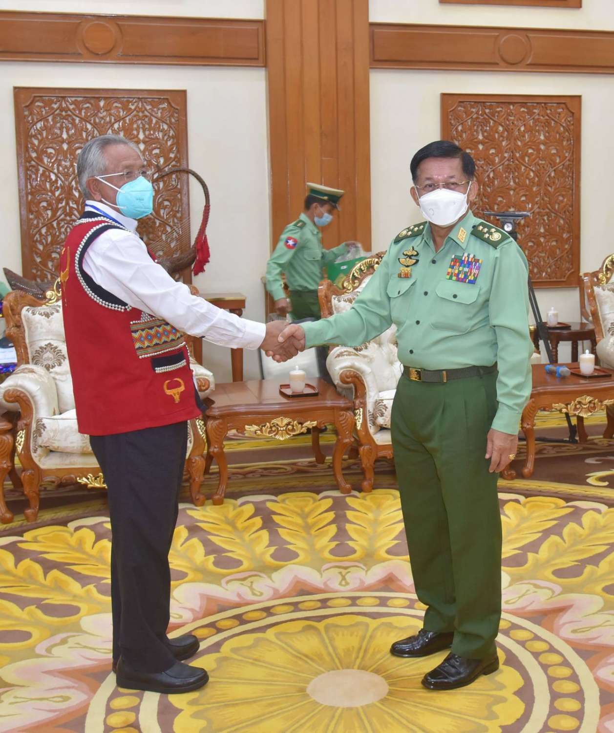 တွေ့ဆုံပွဲအပြီးတွင် နိုင်ငံတော်စီမံအုပ်ချုပ်ရေးကောင်စီဥက္ကဋ္ဌ တပ်မတော်ကာကွယ်ရေးဦးစီးချုပ် က အမှတ်တရလက်ဆောင်ပစ္စည်းများ ပေးအပ်ရာ တက်ရောက်လာကြသည့် ငြိမ်းချမ်းရေးကိုယ်စားလှယ်များ က လက်ခံရယူကြပြီး ဒေသထွက်လက်ဆောင်ပစ္စည်းများကို ပြန်လည်ပေးအပ်ခဲ့ကာ ရင်းရင်းနှီးနှီး ဆွေးနွေးပြောကြားခဲ့ပြီး အမှတ်တရစုပေါင်း ဓာတ်ပုံရိုက်ကြသည်။