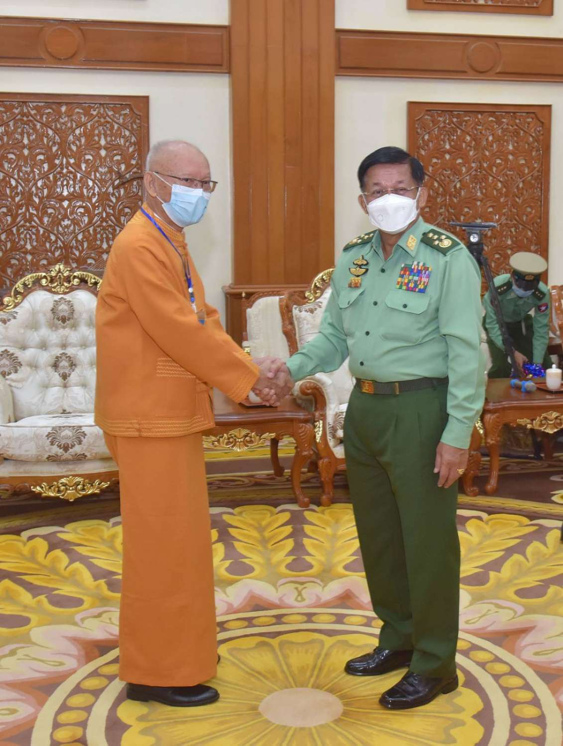 နိုင်ငံတော်စီမံအုပ်ချုပ်ရေးကောင်စီဥက္ကဋ္ဌ တပ်မတော်ကာကွယ်ရေးဦးစီးချုပ် ဗိုလ်ချုပ်မှူးကြီး မင်းအောင်လှိုင်သည်ပြည် သွေးစည်းညီညွတ်ရေးပါတီ (UWSP) ဒုတိယဥက္ကဋ္ဌ ဦးလော့ယာကု၊ အမျိုးသားဒီမိုကရက်တစ်မဟာမိတ်အဖွဲ့ (NDAA) ဒုတိယဥက္ကဋ္ဌ ဦးစန်ပေ့နှင့် ရှမ်းပြည်တိုးတက်ရေးပါတီ (SSPP) ဒုတိယဥက္ကဋ္ဌ() စဝ်ခွန်ဆိုင်တို့ ဦးဆောင်သည့် ငြိမ်းချမ်းရေးကိုယ်စားလှယ်အဖွဲ့အား ယနေ့နံနက်ပိုင်းတွင် နေပြည်တော်ရှိ ဘုရင့်နောင်ရိပ်သာ ဧည့်ခန်းမဆောင်၌ တွေ့ဆုံ၍ ငြိမ်းချမ်းရေးဆိုင်ရာကိစ္စရပ်များ ဆွေးနွေးသည်။