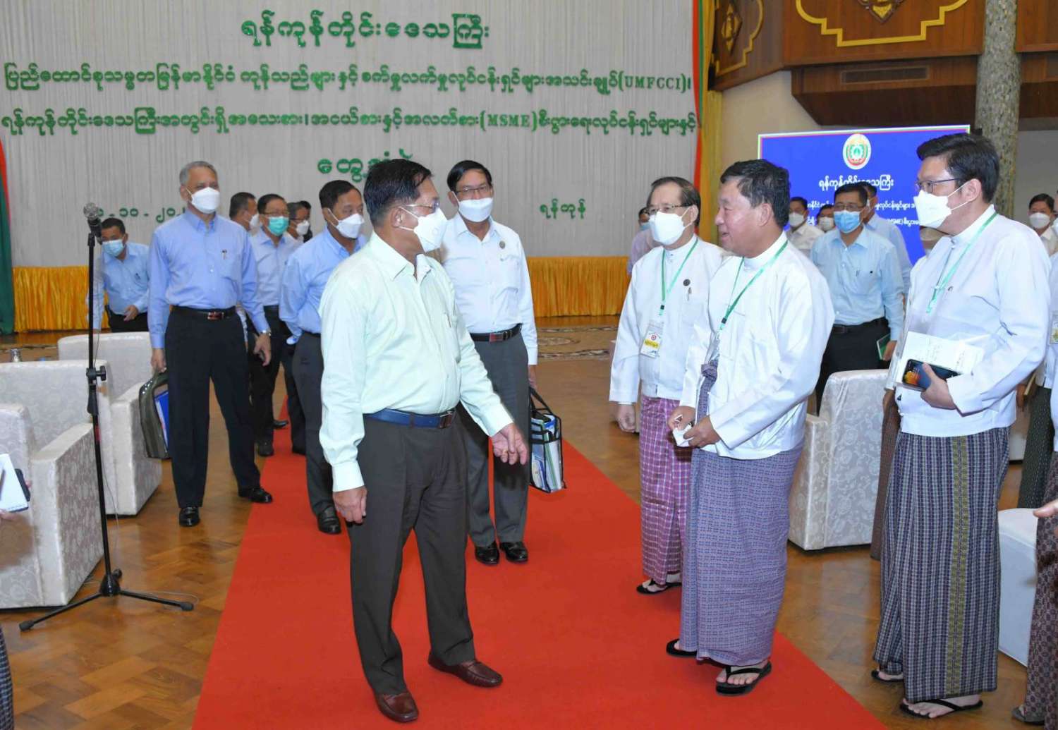 အဆိုပါ တွေ့ဆုံပွဲသို့ နိုင်ငံတော်စီမံအုပ်ချုပ်ရေးကောင်စီဥက္ကဋ္ဌ နိုင်ငံတော်ဝန်ကြီးချုပ်နှင့်အတူ ကောင်စီတွဲဖက်အတွင်းရေးမှူး ဒုတိယဗိုလ်ချုပ်ကြီး ရဲဝင်းဦး၊ ပြည်ထောင်စုဝန်ကြီးများ ဖြစ်ကြသည့် ဦးဝင်းရှိန်၊ ဦးအောင်နိုင်ဦး၊ ဦးတင်ထွဋ်ဦး၊ ဦးလှမိုး၊ ဒေါက်တာ ချာလီသန်း၊ ဒေါက်တာကံဇော်နှင့် ရန်ကုန်တိုင်းဒေသကြီးဝန်ကြီးချုပ် ဦးစိုးသိန်း၊ ညှိနှိုင်းကွပ်ကဲရေးမှူး (ကြည်း၊ ရေ၊ လေ) ဗိုလ်ချုပ်ကြီး မောင်မောင်အေး၊ ကာကွယ်ရေးဦးစီးချုပ်ရုံးမှ တပ်မတော်အရာရှိကြီးများ၊ ရန်ကုန်တိုင်းစစ်ဌာနချုပ် တိုင်းမှူးနှင့် တာဝန်ရှိသူများ၊ တိုင်းဒေသကြီးအစိုးရအဖွဲ့ဝင်များ၊ ပြည်ထောင်စုသမ္မတမြန်မာနိုင်ငံ ကုန်သည်များနှင့် စက်မှုလက်မှုလုပ်ငန်းရှင်များ အသင်းချုပ် (UMFCCI) နှင့် ညီနောင်အသင်းများ၊ ရန်ကုန်တိုင်းဒေသကြီးအတွင်းရှိ အသေးစား၊ အငယ်စားနှင့် အလတ်စား စီးပွားရေး (MSME) လုပ်ငန်းရှင်များ တက်ရောက်ကြသည်။