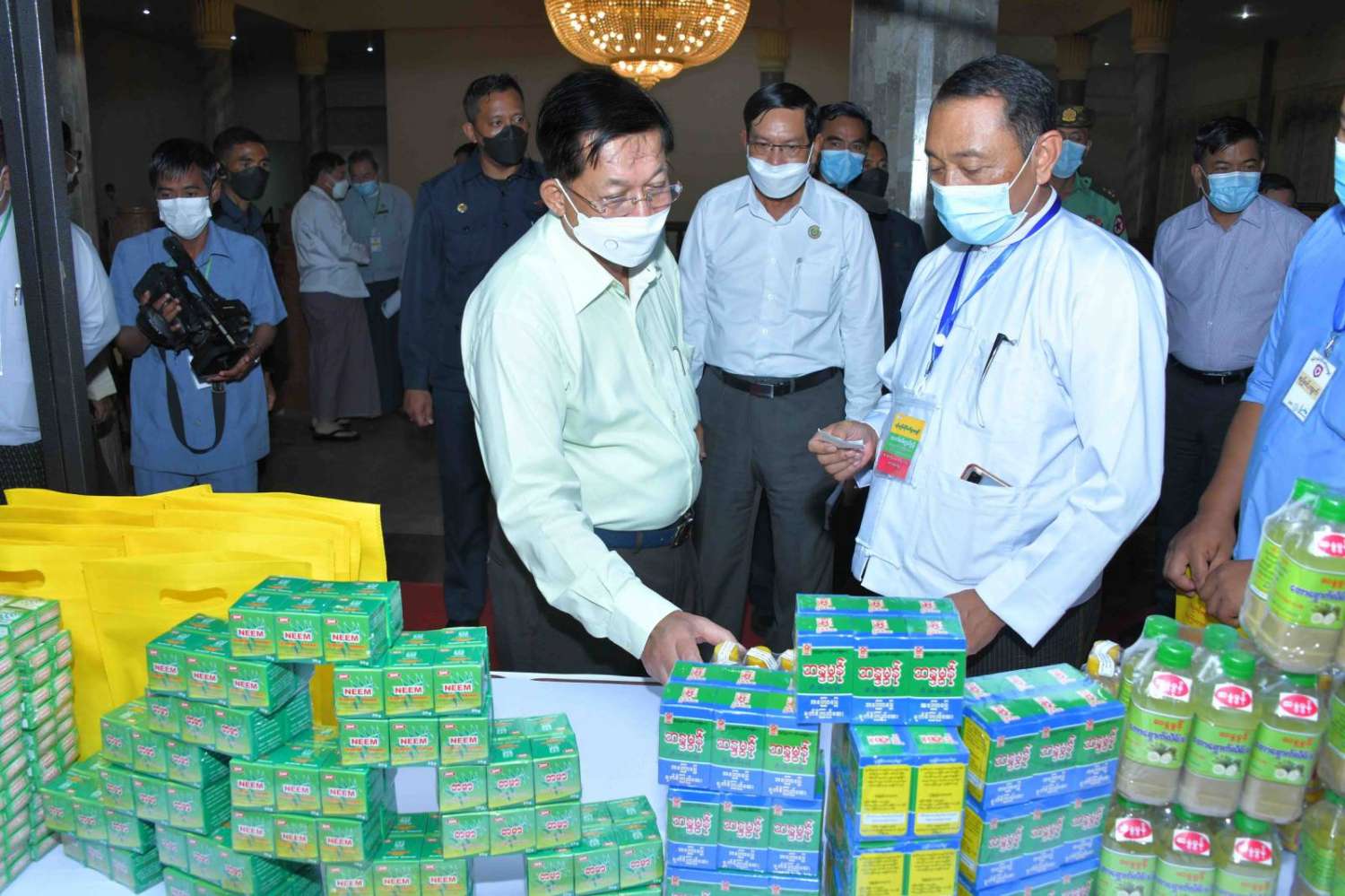 ထို့နောက် နိုင်ငံတော်စီမံအုပ်ချုပ်ရေးကောင်စီဥက္ကဋ္ဌ နိုင်ငံတော်ဝန်ကြီးချုပ်သည် ခင်းကျင်းပြသထားသည့် အသေးစား၊ အငယ်စားနှင့် အလတ်စား စီးပွားရေး (MSME) လုပ်ငန်းရှင်များ၏ လှုပ်ရှားမှုမှတ်တမ်းဓာတ်ပုံများ၊ စားသောက်ကုန်၊ လူသုံးကုန်၊ စက်မှုလက်မှုထုတ်ကုန်၊ မြန်မာ့ရိုးရာလက်မှုထုတ်ကုန်များ၊ ကျောက်မျက်ရတနာ ထုတ်ကုန်များ၊ အဝတ်အထည်များ၊ တိုင်းရင်းဆေးများ စသည့်ထုတ်ကုန်ပစ္စည်းများ ခင်းကျင်းပြသထားရှိမှုများကို ပြကွက်တစ်ခုချင်းစီအလိုက် စိတ်ဝင်တစားဖြင့် လေ့လာခဲ့ပြီး ဈေးကွက်ရရှိမှုအခြေအနေများကို မေးမြန်းဆွေးနွေးရာ လုပ်ငန်းအလိုက် တာဝန်ခံများက လိုက်လံ ရှင်းလင်းတင်ပြခဲ့ကြကြောင်း သတင်းရရှိသည်။