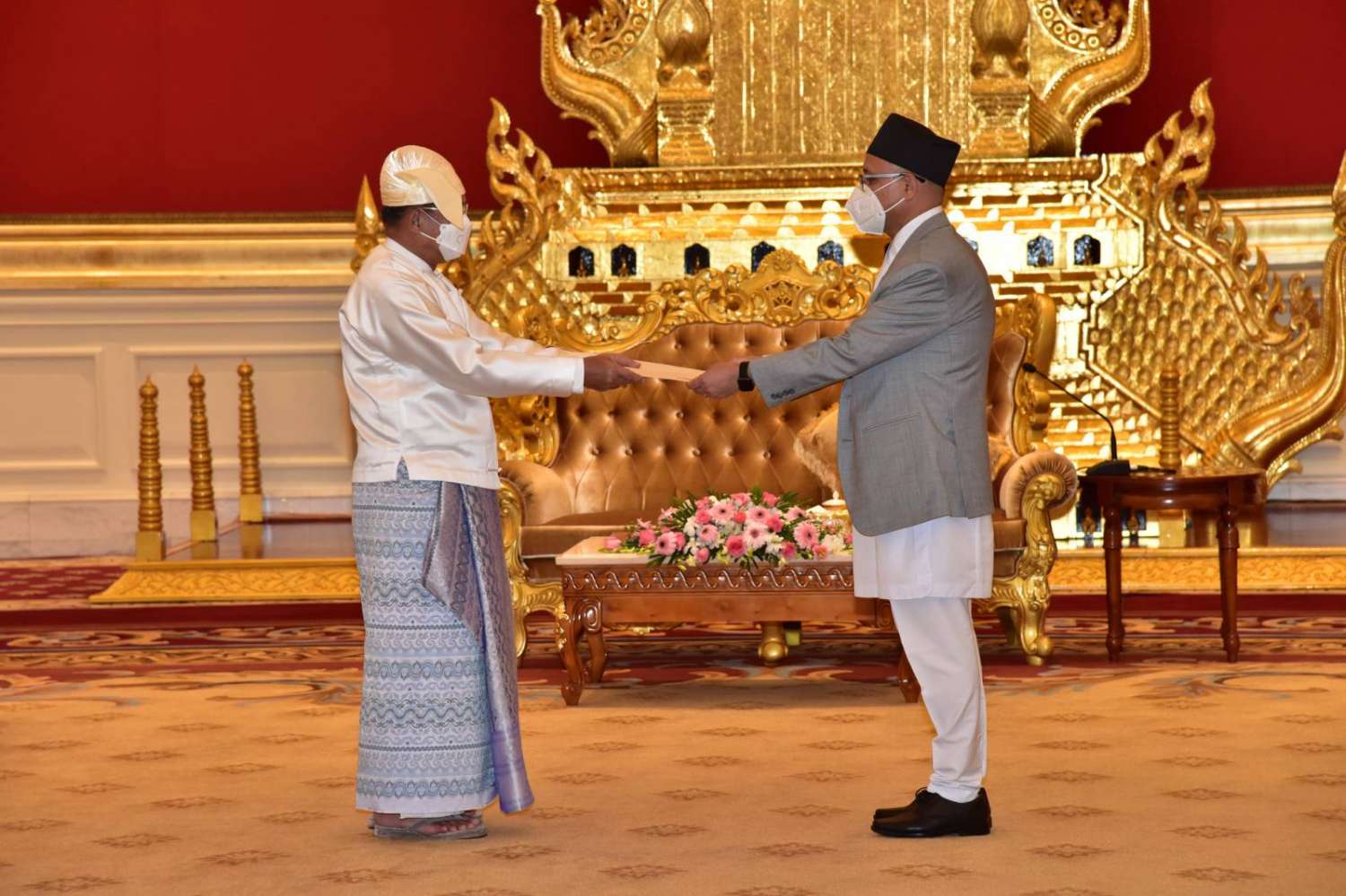 နိုင်ငံတော်စီမံအုပ်ချုပ်ရေးကောင်စီဥက္ကဋ္ဌ နိုင်ငံတော်ဝန်ကြီးချုပ် ဗိုလ်ချုပ်မှူးကြီး မင်းအောင်လှိုင်ထံ မြန်မာနိုင်ငံဆိုင်ရာ နီပေါနိုင်ငံသံအမတ်ကြီးအဖြစ် ခန့်အပ်ရန် သဘောတူညီပြီးဖြစ်သော သံအမတ်ကြီး H.E. Mr. Harishchandra Ghimire သည် ယနေ့ နံနက် ၁၀ နာရီ ၄၅ မိနစ်တွင် နေပြည်တော်ရှိ နိုင်ငံတော်စီမံအုပ်ချုပ်ရေးကောင်စီဥက္ကဋ္ဌရုံး၊ သံတမန်ဆောင် ဧည့်ခန်းမ၌ ၎င်း၏သံအမတ်ခန့်အပ်လွှာကို ပေးအပ်သည်။