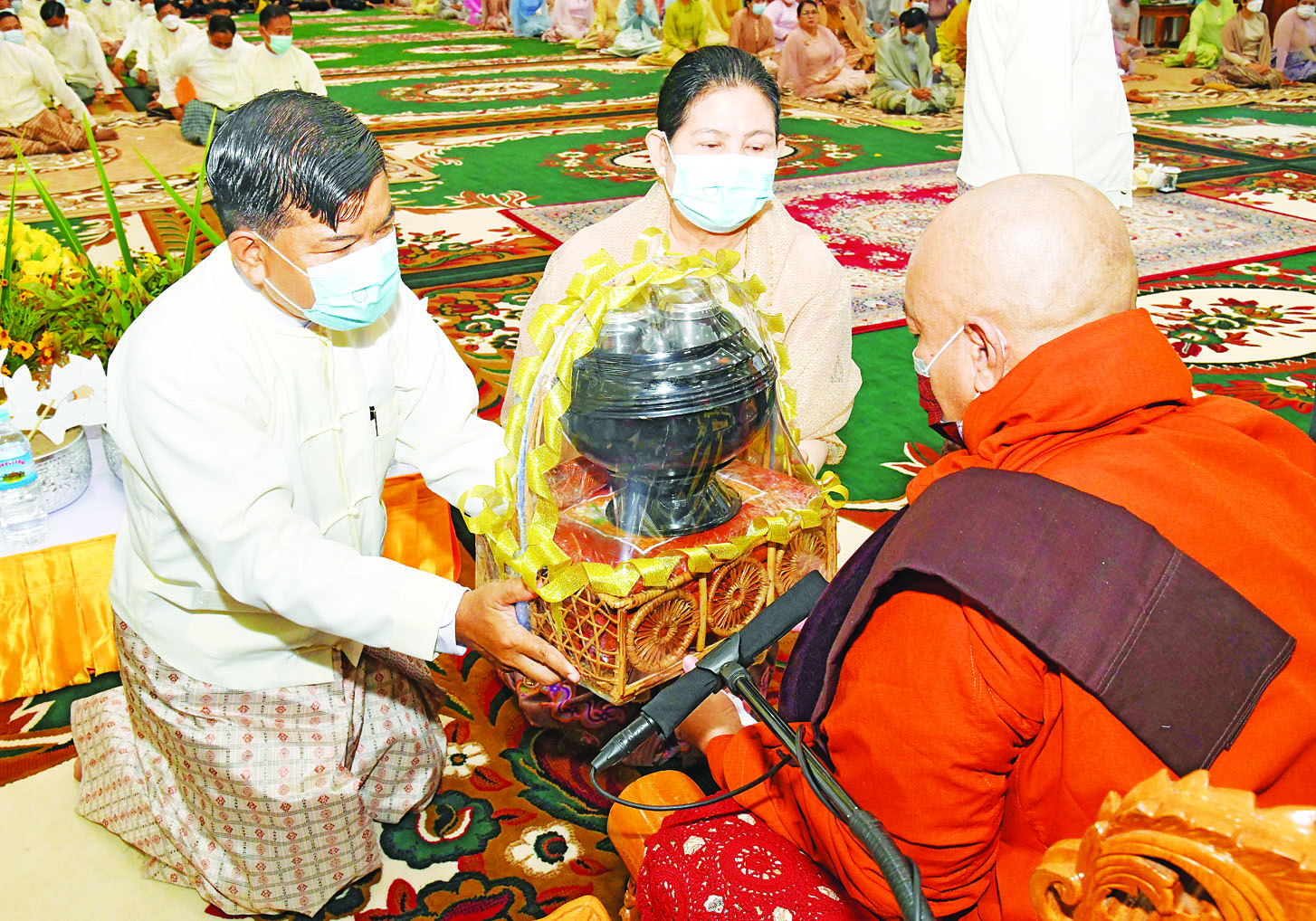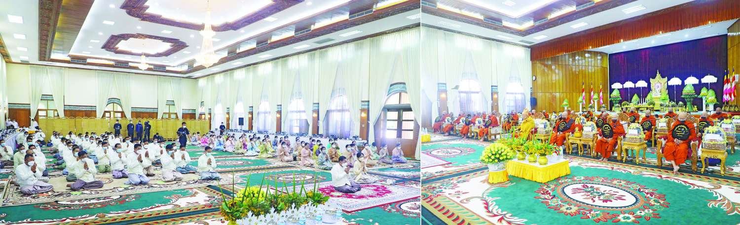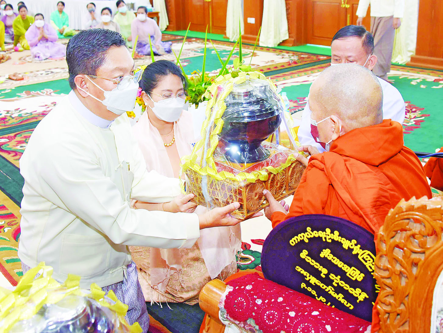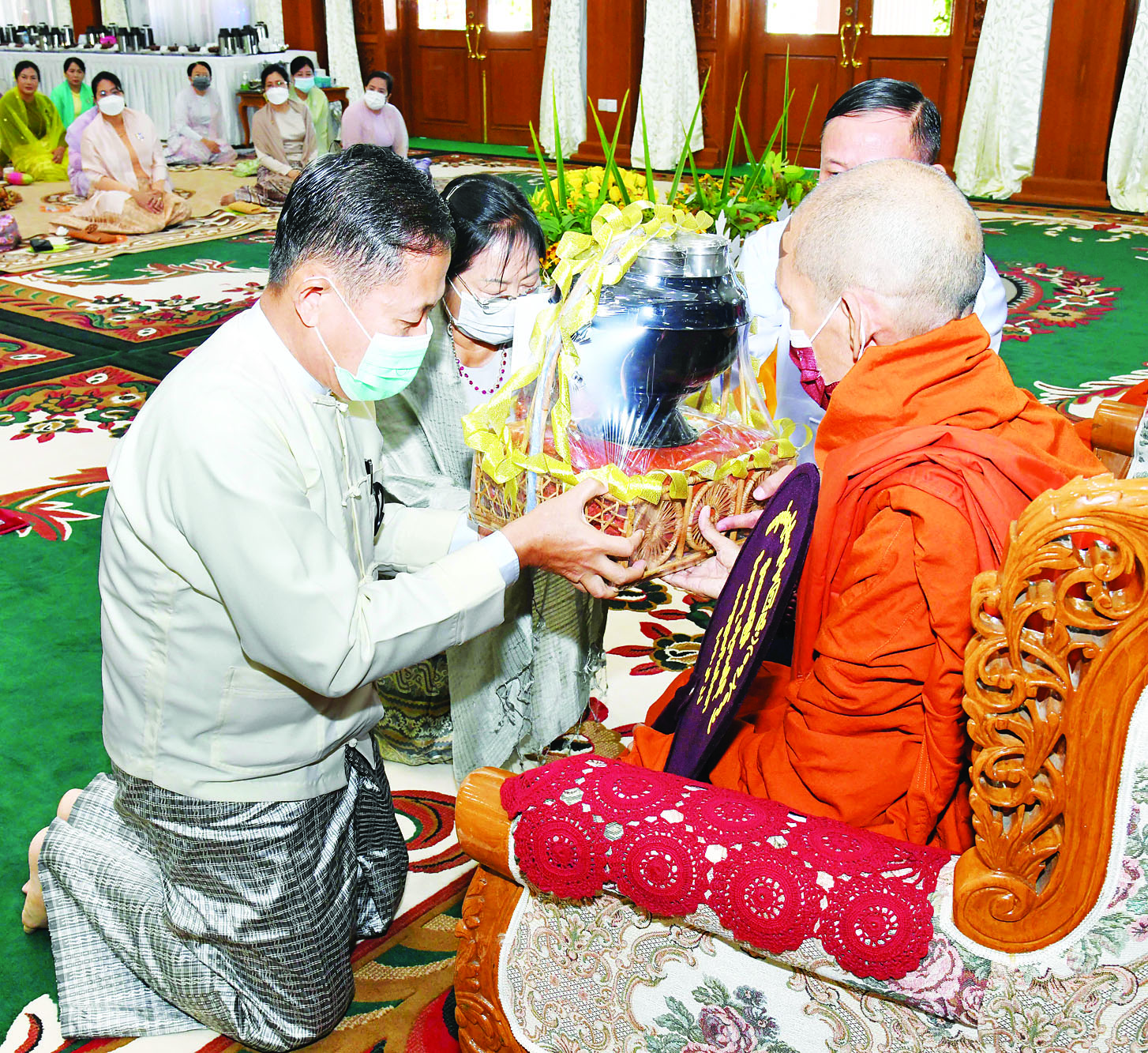 ဦးစွာ နိုင်ငံတော်စီမံအုပ်ချုပ်ရေးကောင်စီဥက္ကဋ္ဌ တပ်မတော်ကာကွယ်ရေးဦးစီးချုပ်၊ ဇနီးနှင့် ဧည့်ပရိသတ်များသည် ဘုန်းတော်ကြီးကျောင်းအသီးသီးသို့ လှူဒါန်းရန် ခင်းကျင်းပြင်ဆင်ထားသည့် ကထိန်လျာသင်္ကန်း၊ လှူဖွယ်ပစ္စည်းများနှင့် ပဒေသာပင်များအား လှည့်လည်ကြည့်ရှုကြသည်။ ထို့နောက် နိုင်ငံတော်စီမံအုပ်ချုပ်ရေးကောင်စီဥက္ကဋ္ဌ တပ်မတော်ကာကွယ်ရေးဦးစီးချုပ်နှင့် ဇနီးတို့သည် အနော်ရထာခန်းမအတွင်းရှိ ဗုဒ္ဓရုပ်ပွားတော်မြတ်အား ဖူးမြော်ကြည်ညို၍ မြသပိတ်ဆွမ်းတော်နှင့် ပန်း၊ သောက်တော်ရေချမ်း၊ ဆီမီး၊ သစ်သီးတို့ကို ဆက်ကပ်လှူဒါန်းသည်။