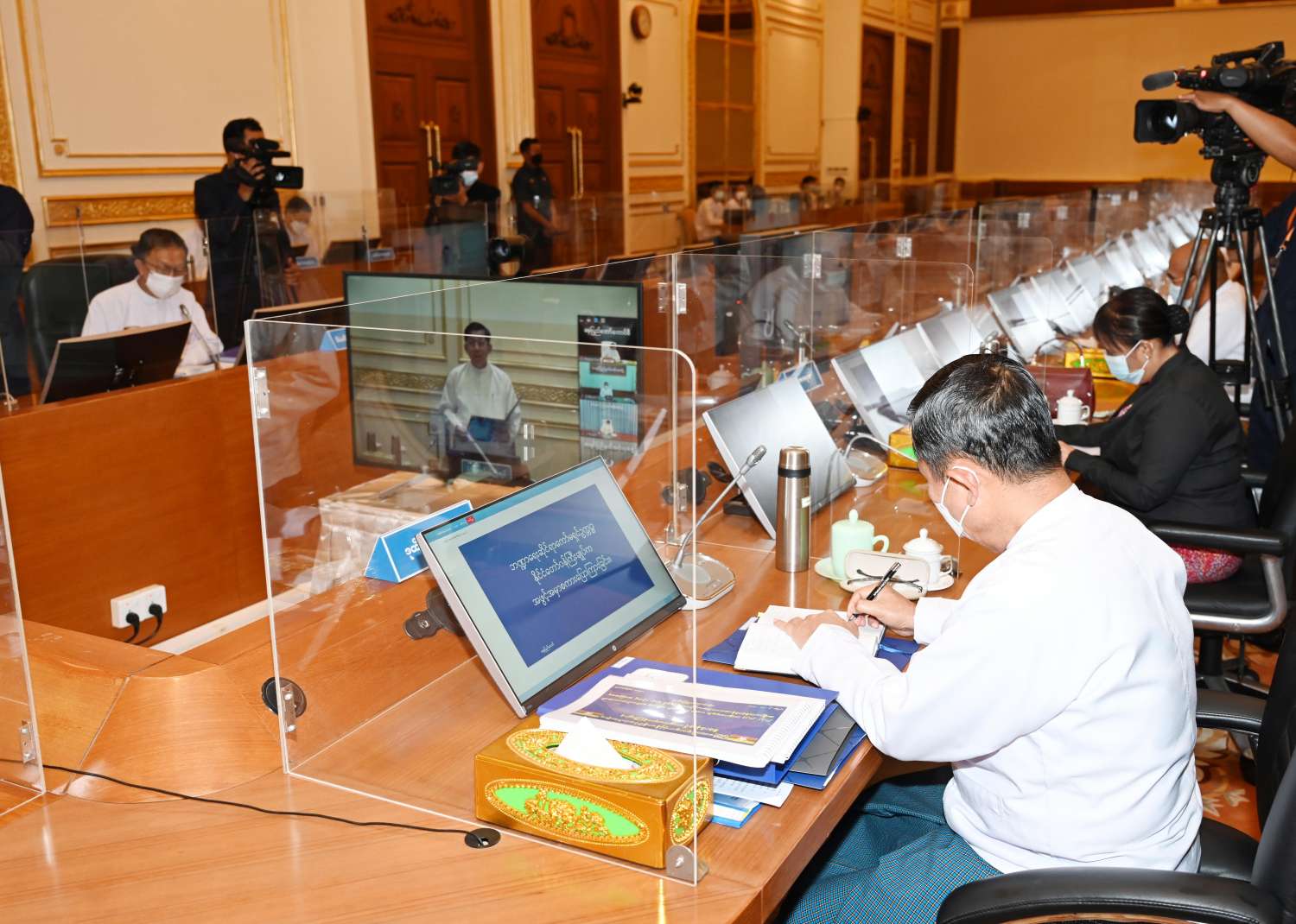 အစည်းအဝေးသို့ ဘဏ္ဍာရေးဆိုင်ရာကော်မရှင် ဒုတိယဥက္ကဋ္ဌ နိုင်ငံတော်စီမံအုပ်ချုပ်ရေးကောင်စီ ဒုတိယဥက္ကဋ္ဌ ဒုတိယဝန်ကြီးချုပ် ဒုတိယဗိုလ်ချုပ်မှူးကြီး စိုးဝင်း၊ ဘဏ္ဍာရေးဆိုင်ရာကော်မရှင် အတွင်းရေးမှူး၊ စီမံကိန်းနှင့်ဘဏ္ဍာရေးဝန်ကြီးဌာန ပြည်ထောင်စုဝန်ကြီး ဦးဝင်းရှိန်၊ ဥပဒေရေးရာဝန်ကြီးဌာန ပြည်ထောင်စုဝန်ကြီး ပြည်ထောင်စုရှေ့နေချုပ် ဒေါက်တာ ဒေါ်သီတာဦး၊ ပြည်ထောင်စုစာရင်းစစ်ချုပ် ဦးတင်ဦးနှင့် ဒုတိယဝန်ကြီး ဦးမောင်မောင်ဝင်း တို့တက်ရောက်ကြပြီး နေပြည်တော်ကောင်စီဥက္ကဋ္ဌ၊ တိုင်းဒေသကြီးနှင့် ပြည်နယ်အစိုးရအဖွဲ့ ဝန်ကြီးချုပ်များက Video Conferencing ဖြင့် တက်ရောက်ကြသည်။