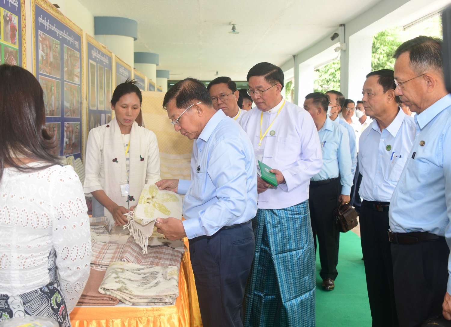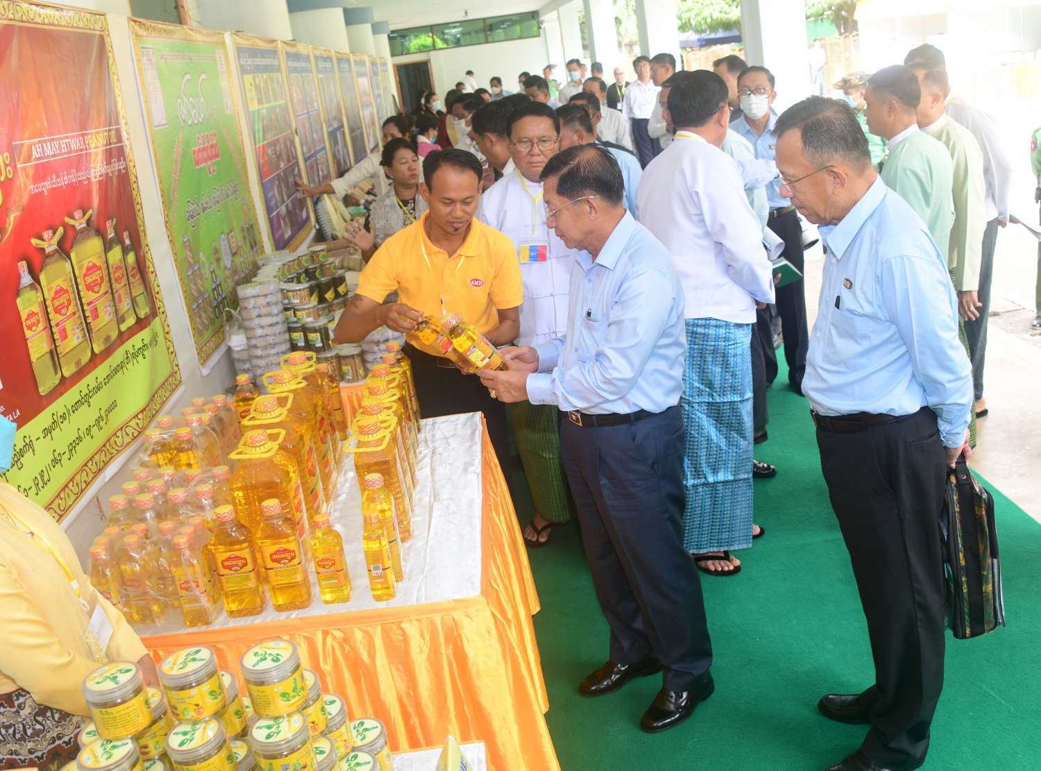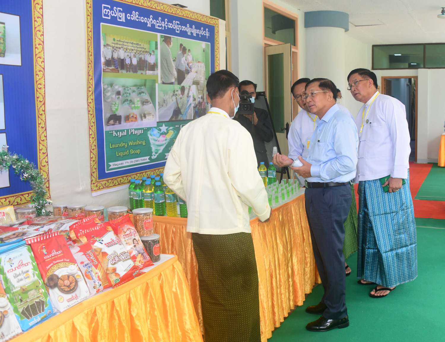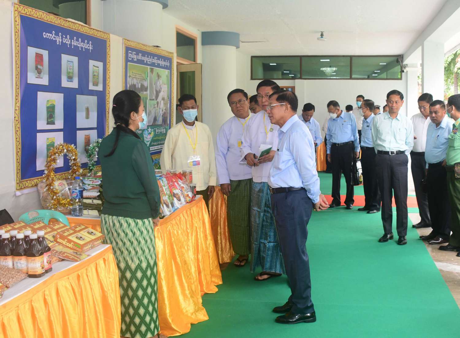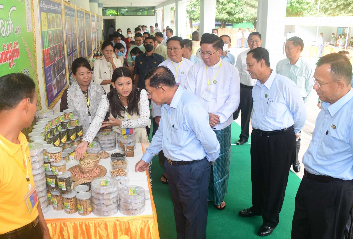 ထို့နောက် နိုင်ငံတော်စီမံအုပ်ချုပ်ရေးကောင်စီဥက္ကဋ္ဌ နိုင်ငံတော်ဝန်ကြီးချုပ်သည် ခင်းကျင်းပြသထားသည့် စားသောက်ကုန်၊ လူသုံးကုန်၊ စက်မှုလက်မှုထုတ်ကုန်၊ ရိုးရာလက်မှုထုတ်ကုန်များ၊ အဝတ်အထည်များ၊ တိုင်းရင်းဆေးများ စသည့်ထုတ်ကုန်ပစ္စည်းများ ခင်းကျင်းပြသထားရှိမှုများကို ပြကွက်တစ်ခုချင်းစီအလိုက် စိတ်ဝင်တစားဖြင့်လေ့လာခဲ့ပြီး ဈေးကွက်ရရှိမှုအခြေအနေများကို မေးမြန်းဆွေးနွေးရာ လုပ်ငန်းအလိုက် စီးပွားရေးလုပ်ငန်းရှင်များက လိုက်လံရှင်းလင်းတင်ပြခဲ့ကြောင်း သတင်းရရှိသည်။