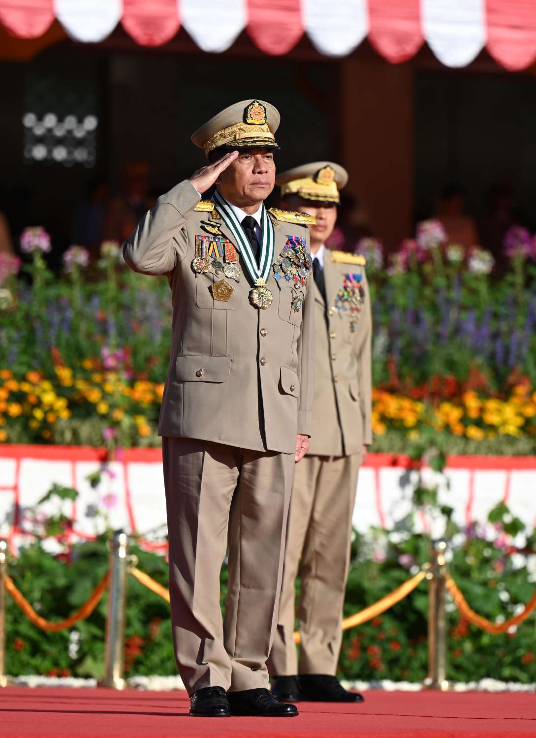 ယင်းနောက် နိုင်ငံတော်စီမံအုပ်ချုပ်ရေးကောင်စီဥက္ကဋ္ဌ တပ်မတော်ကာကွယ်ရေးဦးစီးချုပ် ဗိုလ်ချုပ်မှူးကြီး မဟာသရေစည်သူ မင်းအောင်လှိုင်သည် ဗိုလ်လောင်းတပ်ခွဲများ၏ အလေးပြု ခြင်းကိုခံယူပြီး စစ်ရေးပြအခမ်းအနားမှ ပြန်လည်ထွက်ခွာသည်။