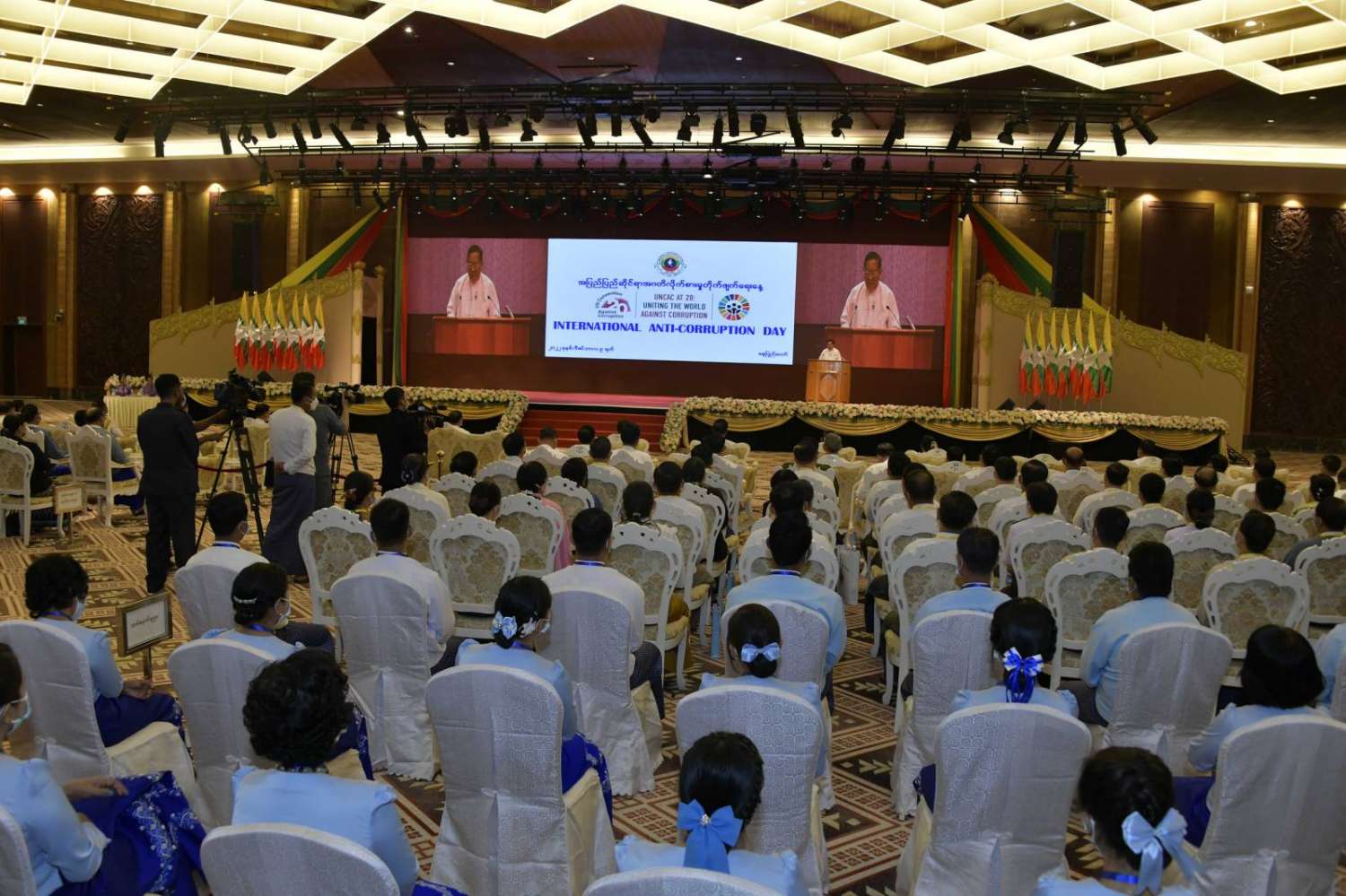 အခမ်းအနားသို့ နိုင်ငံတော်စီမံအုပ်ချုပ်ရေးကောင်စီ တွဲဖက်အတွင်းရေးမှူး ဒုတိယဗိုလ်ချုပ်ကြီး ရဲဝင်းဦး၊ ကောင်စီဝင်များဖြစ်ကြသည့် ဗိုလ်ချုပ်ကြီး မြထွန်းဦး၊ ဗိုလ်ချုပ်ကြီး တင်အောင်စန်း၊ ဒုတိယဗိုလ်ချုပ်ကြီး မိုးမြင့်ထွန်း၊ မန်းငြိမ်းမောင်၊ ဒေါ်အေးနုစိန်၊ Jeng Phang နော်တောင်၊ ဒုတိယဗိုလ်ချုပ်ကြီး စိုးထွဋ်နှင့် ဒုတိယဗိုလ်ချုပ်ကြီး ရာပြည့်၊ ပြည်ထောင်စုအဆင့်ပုဂ္ဂိုလ်များနှင့် ပြည်ထောင်စုဝန်ကြီးများ၊ နေပြည်တော်ကောင်စီဥက္ကဋ္ဌ၊ တပ်မတော်အရာရှိကြီးများ၊ နေပြည်တော်တိုင်းစစ်ဌာနချုပ်တိုင်းမှူး၊ ဒုတိယဝန်ကြီးများ၊ အဂတိလိုက်စားမှုတားဆီးကာကွယ်ရေးအဖွဲ့မှ တာဝန်ရှိသူများနှင့် ဖိတ်ကြားထားသူများ တက်ရောက်ရောက်ကြပြီး တိုင်းဒေသကြီးနှင့် ပြည်နယ်ဝန်ကြီးချုပ်များက Video Conferencing ဖြင့် တက်ရောက်ကြသည်။