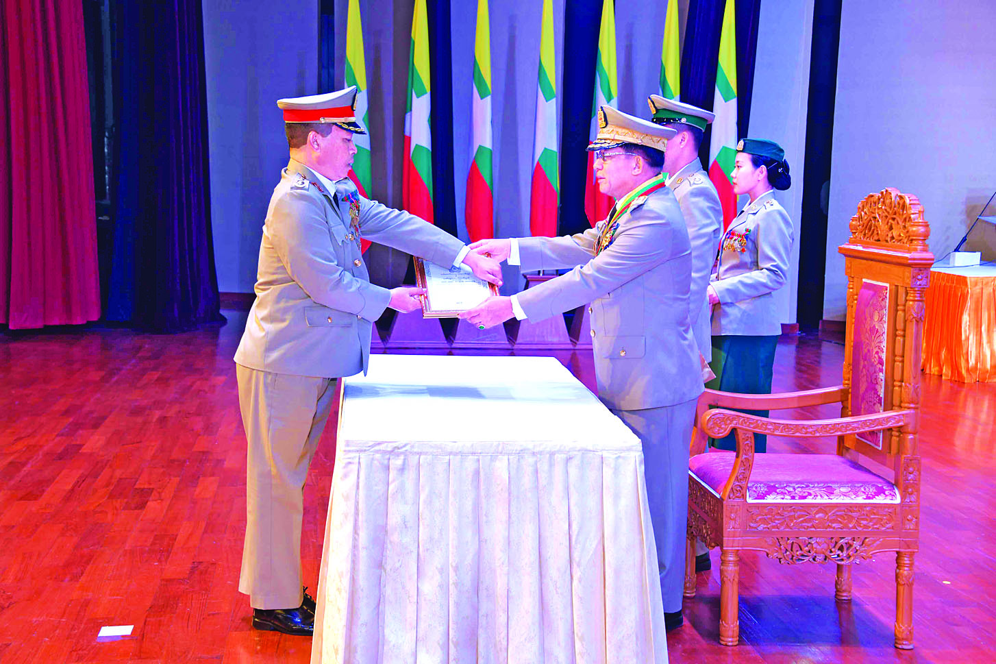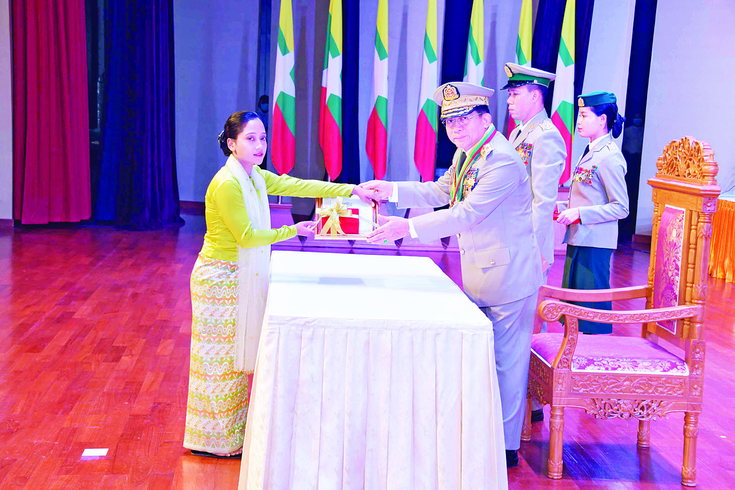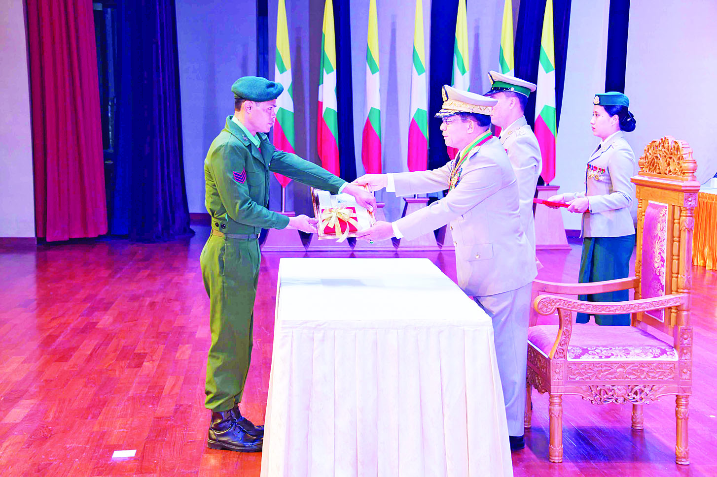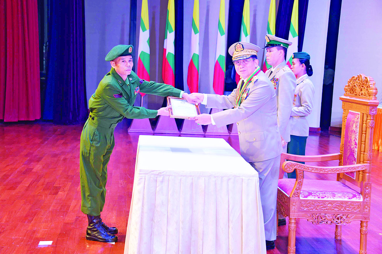 နိုင်ငံတော်စီမံအုပ်ချုပ်ရေးကောင်စီဥက္ကဋ္ဌ တပ်မတော်ကာကွယ်ရေးဦးစီးချုပ် ဗိုလ်ချုပ်မှူးကြီး သတိုးမဟာသရေစည်သူ၊ သတိုးသီရိသုဓမ္မ မင်းအောင်လှိုင် တပ်မတော်စွမ်းရည်သတ္တိဆိုင်ရာ ဂုဏ်ထူးဆောင်တံဆိပ်နှင့် လက်မှတ်များချီးမြှင့်အပ်နှင်းခြင်း အခမ်းအနားသို့ တက်ရောက်ဂုဏ်ပြု