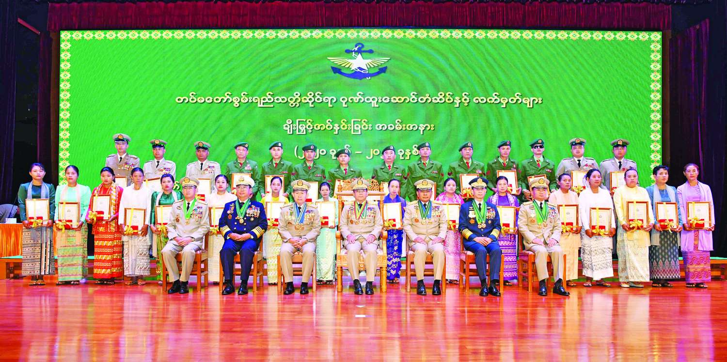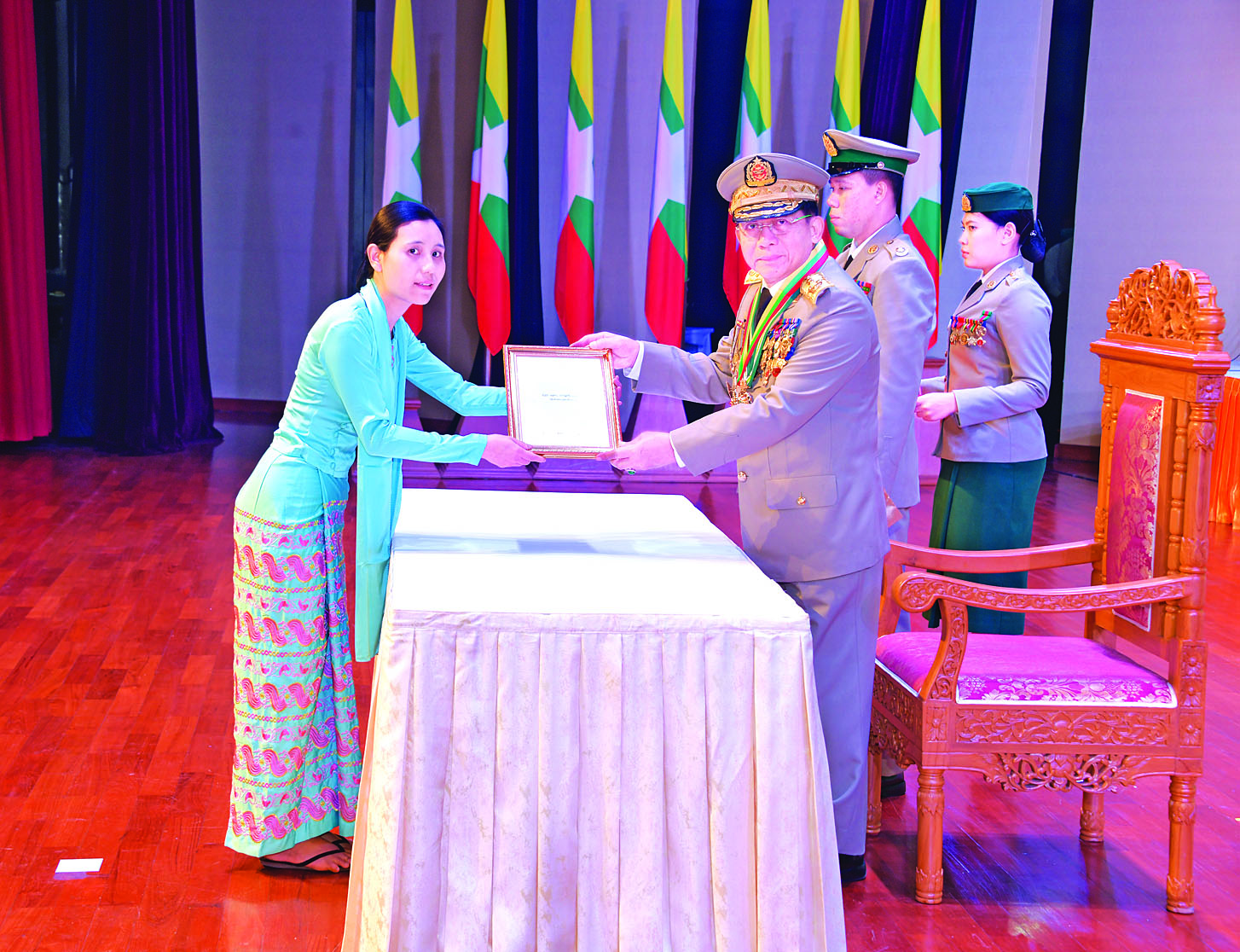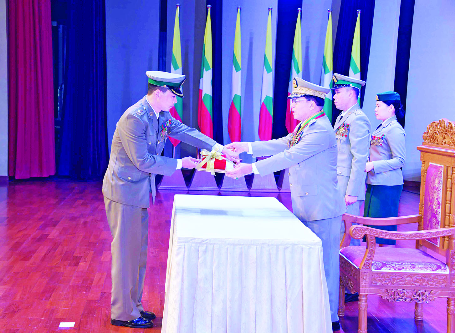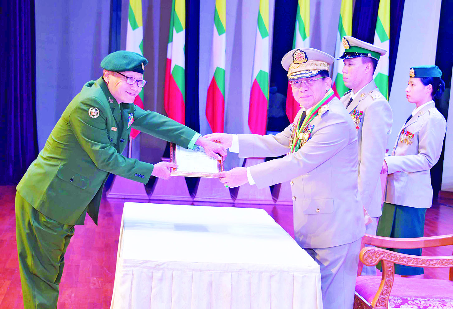 နိုင်ငံတော်စီမံအုပ်ချုပ်ရေးကောင်စီဥက္ကဋ္ဌ တပ်မတော်ကာကွယ်ရေးဦးစီးချုပ် ဗိုလ်ချုပ်မှူးကြီး သတိုးမဟာသရေစည်သူ၊ သတိုးသီရိသုဓမ္မ မင်းအောင်လှိုင် တပ်မတော်စွမ်းရည်သတ္တိဆိုင်ရာ ဂုဏ်ထူးဆောင်တံဆိပ်နှင့် လက်မှတ်များချီးမြှင့်အပ်နှင်းခြင်း အခမ်းအနားသို့ တက်ရောက်ဂုဏ်ပြု