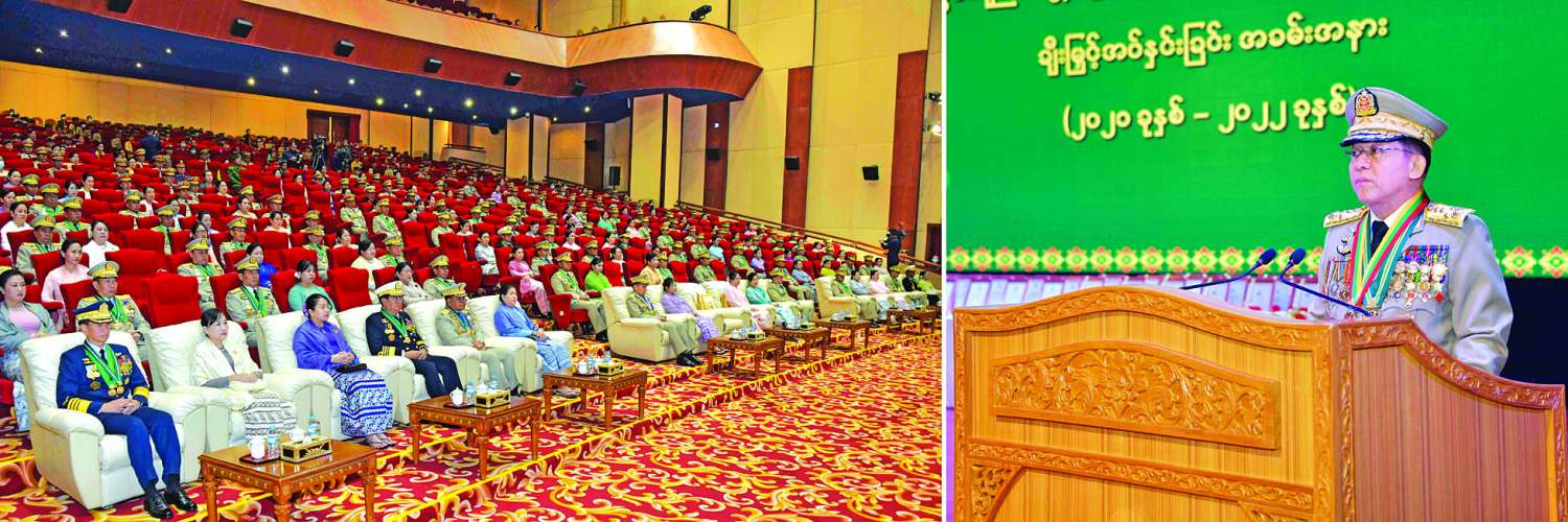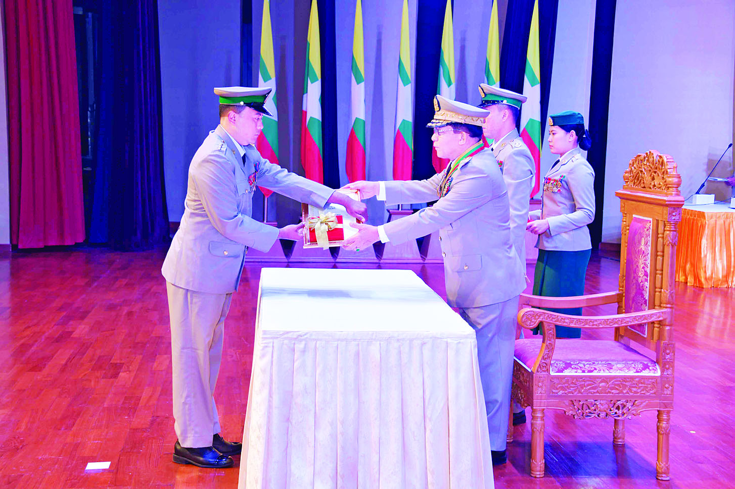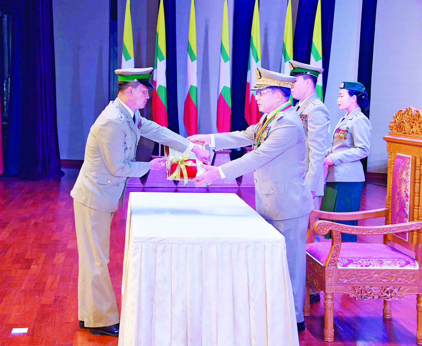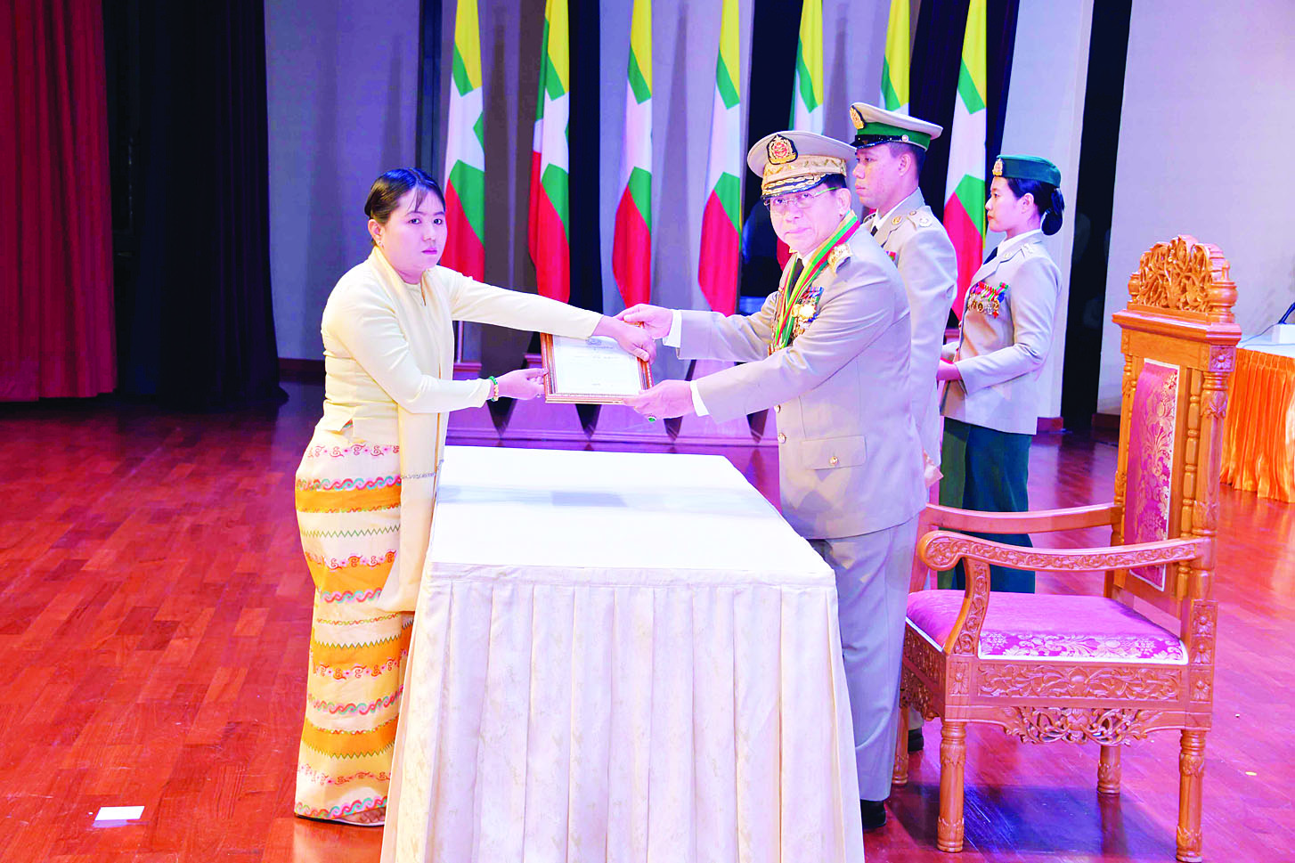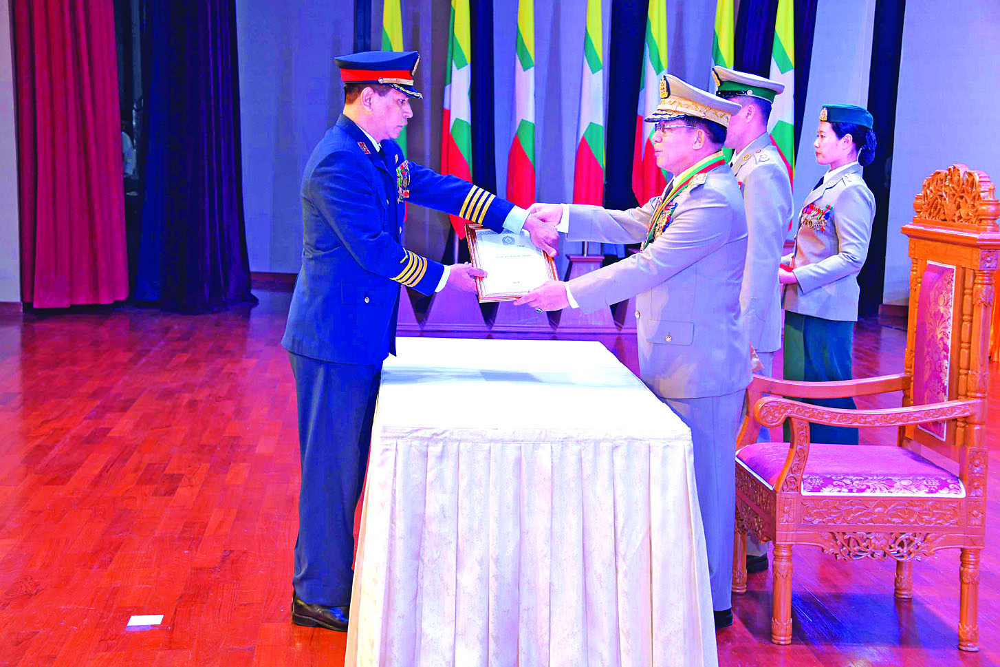နိုင်ငံတော်စီမံအုပ်ချုပ်ရေးကောင်စီဥက္ကဋ္ဌ တပ်မတော်ကာကွယ်ရေးဦးစီးချုပ် ဗိုလ်ချုပ်မှူးကြီး သတိုးမဟာသရေစည်သူ၊ သတိုးသီရိသုဓမ္မ မင်းအောင်လှိုင် တပ်မတော်စွမ်းရည်သတ္တိဆိုင်ရာ ဂုဏ်ထူးဆောင်တံဆိပ်နှင့် လက်မှတ်များချီးမြှင့်အပ်နှင်းခြင်း အခမ်းအနားသို့ တက်ရောက်ဂုဏ်ပြု