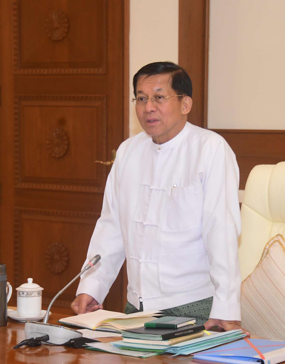 နိုင်ငံတော်စီမံအုပ်ချုပ်ရေးကောင်စီအစည်းအဝေး (၂/၂၀၂၃) ကို ယနေ့မွန်းလွဲပိုင်းတွင် နေပြည်တော်ရှိ နိုင်ငံတော်စီမံအုပ်ချုပ်ရေးကောင်စီဥက္ကဋ္ဌရုံး အစည်းအဝေးခန်းမ၌ကျင်းပပြုလုပ်ရာ နိုင်ငံတော်စီမံအုပ်ချုပ်ရေးကောင်စီဥက္ကဋ္ဌ နိုင်ငံတော်ဝန်ကြီးချုပ် ဗိုလ်ချုပ်မှူးကြီး မင်းအောင်လှိုင် တက်ရောက်အမှာစကားပြောကြားသည်။