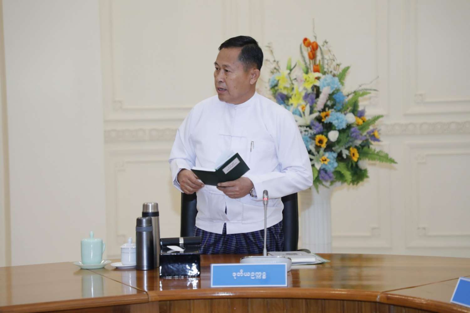 မိမိတို့အနေဖြင့် နိုင်ငံတော်စီမံအုပ်ချုပ်ရေးကောင်စီကို စတင်ဖွဲ့စည်းစဉ်ကတည်းကပင် နိုင်ငံစီးပွားရေးဖွံ့ဖြိုးတိုးတက်ရေးနှင့် ပြည်သူများ၏ လူမှုစီးပွားဘဝ ဖွံ့ဖြိုးတိုးတက်ရေးအတွက် ရှေ့လုပ်ငန်းစဉ်များ၊ ဦးတည်ချက်များချမှတ်၍ ၎င်းအပေါ်ဦးတည်ပြီး လုပ်ငန်းများကို စနစ်တကျအကောင်အထည်ဖော် ဆောင်ရွက်ခဲ့ခြင်းဖြစ်ကြောင်း၊ လက်ရှိအချိန်တွင်လည်း ရှေ့လုပ်ငန်းစဉ်များနှင့် ဦးတည်ချက်များကို အသစ်ထပ်မံချမှတ်ပြင်ဆင်၍ ဆောင်ရွက်လျက်ရှိပြီး ပထမအချက်အနေဖြင့် တည်ငြိမ်အေးချမ်းရေးအတွက် အချို့သောမြို့နယ်များတွင် စစ်အုပ်ချုပ်ရေးအမိန့်များကိုထုတ်ပြန်၍ တည်ငြိမ်အေးချမ်းရေးကို ဦးစားပေးဆောင်ရွက်လျက်ရှိကြောင်း၊ စစ်အုပ်ချုပ်ရေးအမိန့် ထုတ်ပြန်ခြင်းသည် ပြည်သူများကို ထိန်းချုပ်ကန့်သတ်ခြင်းမဟုတ်ဘဲ ဒေသခံပြည်သူလူထုတို့၏ အကျိုးစီးပွားကို ထိခိုက်ပျက်စီးအောင် ဆောင်ရွက်နေကြသည့် အကြမ်းဖက်သမားများ၏ လုပ်ဆောင်ချက်များကို ထိထိရောက်ရောက် ထိန်းချုပ်နိုင်ရေး ဆောင်ရွက်ခြင်းပင်ဖြစ်ကြောင်း၊ တည်ငြိမ်အေးချမ်းမှုကို အလေးထားဆောင်ရွက်ရန်လိုအပ်မည်ဖြစ်ပြီး လုံခြုံရေး၊ တည်ငြိမ်အေးချမ်းရေးနှင့် တရားဥပဒေစိုးမိုးရေးအတွက် တည်ငြိမ်မှုရှိရန် လိုအပ်သည့်ဒေသများတွင် ပိုမိုအလေးထား ဆောင်ရွက်သွားရန် မှာကြားလိုကြောင်း။