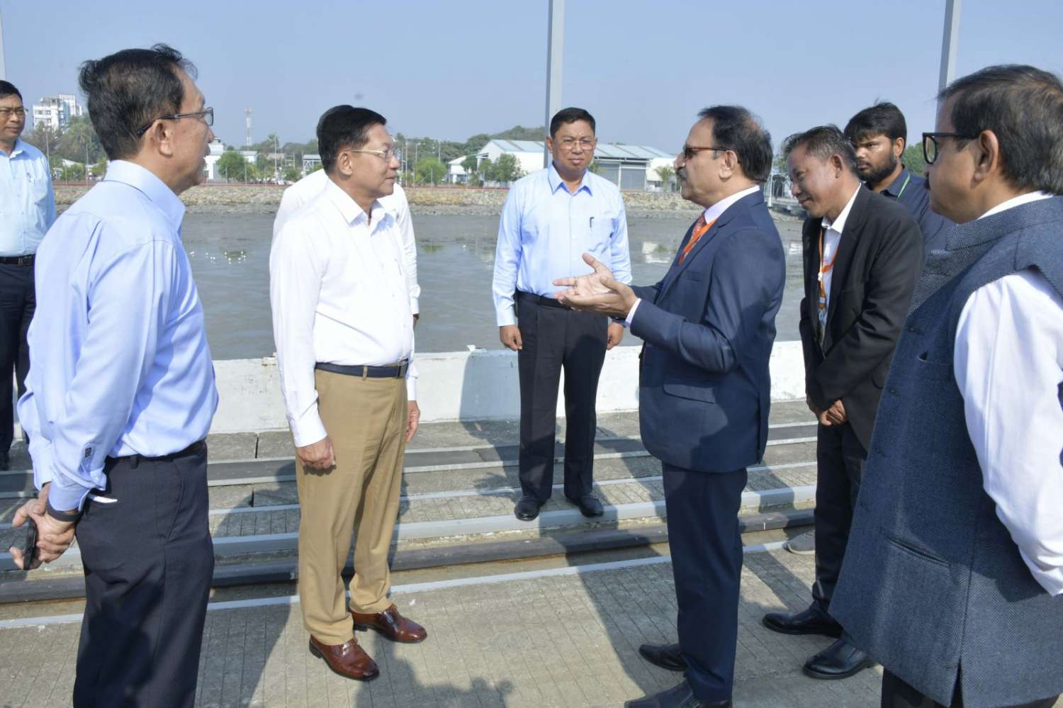 ထို့နောက် နိုင်ငံတော်စီမံအုပ်ချုပ်ရေးကောင်စီဥက္ကဋ္ဌ နိုင်ငံတော်ဝန်ကြီးချုပ်နှင့် အဖွဲ့ဝင်များသည် ကုလားတန်မြစ်ကြောင်း ဘက်စုံသုံးဖြတ်သန်းသယ်ယူပို့ဆောင်ရေးစီမံကိန်း လုပ်ငန်းခွင်အတွင်း လှည့်လည်ကြည့်ရှုရာ စစ်တွေမြို့ဆိုင်ရာ အိန္ဒိယနိုင်ငံ ကောင်စစ်ဝန်ချုပ် Mr. Bibekananda Bhattamishra နှင့် တာဝန်ရှိသူများက လုပ်ငန်းဆောင်ရွက်နေမှုအခြေအနေများကို ရှင်းလင်းတင်ပြသည်။ ရှင်းလင်းတင်ပြမှုများအပေါ် နိုင်ငံတော်စီမံအုပ်ချုပ်ရေးကောင်စီဥက္ကဋ္ဌ နိုင်ငံတော်ဝန်ကြီးချုပ်က လိုအပ်သည်များ ပြန်လည်ဆွေးနွေးမှာကြားသည်။