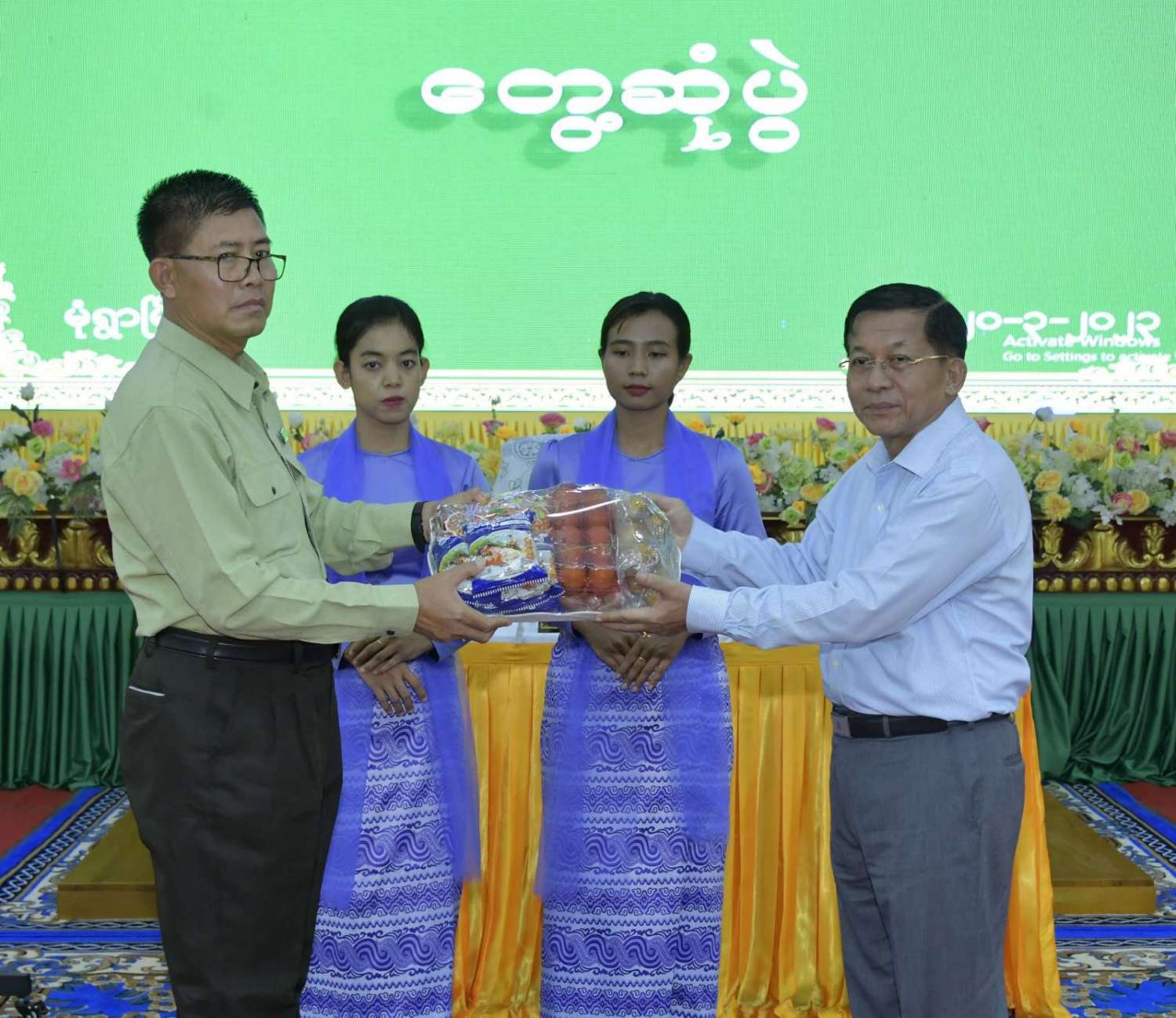 ထို့နောက် နိုင်ငံတော်စီမံအုပ်ချုပ်ရေးကောင်စီဥက္ကဋ္ဌ နိုင်ငံတော်ဝန်ကြီးချုပ်က တိုင်းဒေသကြီး၊ ခရိုင်၊ မြို့နယ်အဆင့် ဌာနဆိုင်ရာဝန်ထမ်းများအတွက် စားသောက်ဖွယ်ရာပစ္စည်းများကိုပေးအပ်ရာ တိုင်းဒေသကြီးအဆင့် ဌာနဆိုင်ရာများကိုယ်စား တိုင်းဒေသကြီးကျန်းမာရေးဦးစီးဌာနမှူး ဒေါက်တာဝင်းနိုင်၊ ခရိုင်အဆင့်ဌာနဆိုင်ရာ များကိုယ်စား မုံရွာခရိုင်အထွေထွေအုပ်ချုပ်ရေးဦးစီးဌာနမှ ခရိုင်အုပ်ချုပ်ရေးမှူး ဦးဇော်တင်မိုး၊ မြို့နယ်အဆင့်ဌာနဆိုင်ရာများကိုယ်စား မုံရွာမြို့နယ်အထွေထွေအုပ် ချုပ်ရေးဦးစီးဌာနမှ မြို့နယ်အုပ်ချုပ်ရေးမှူး ဦးအောင်ဆန်းဝင်းတို့က အသီးသီးလက်ခံရယူကြသည်။