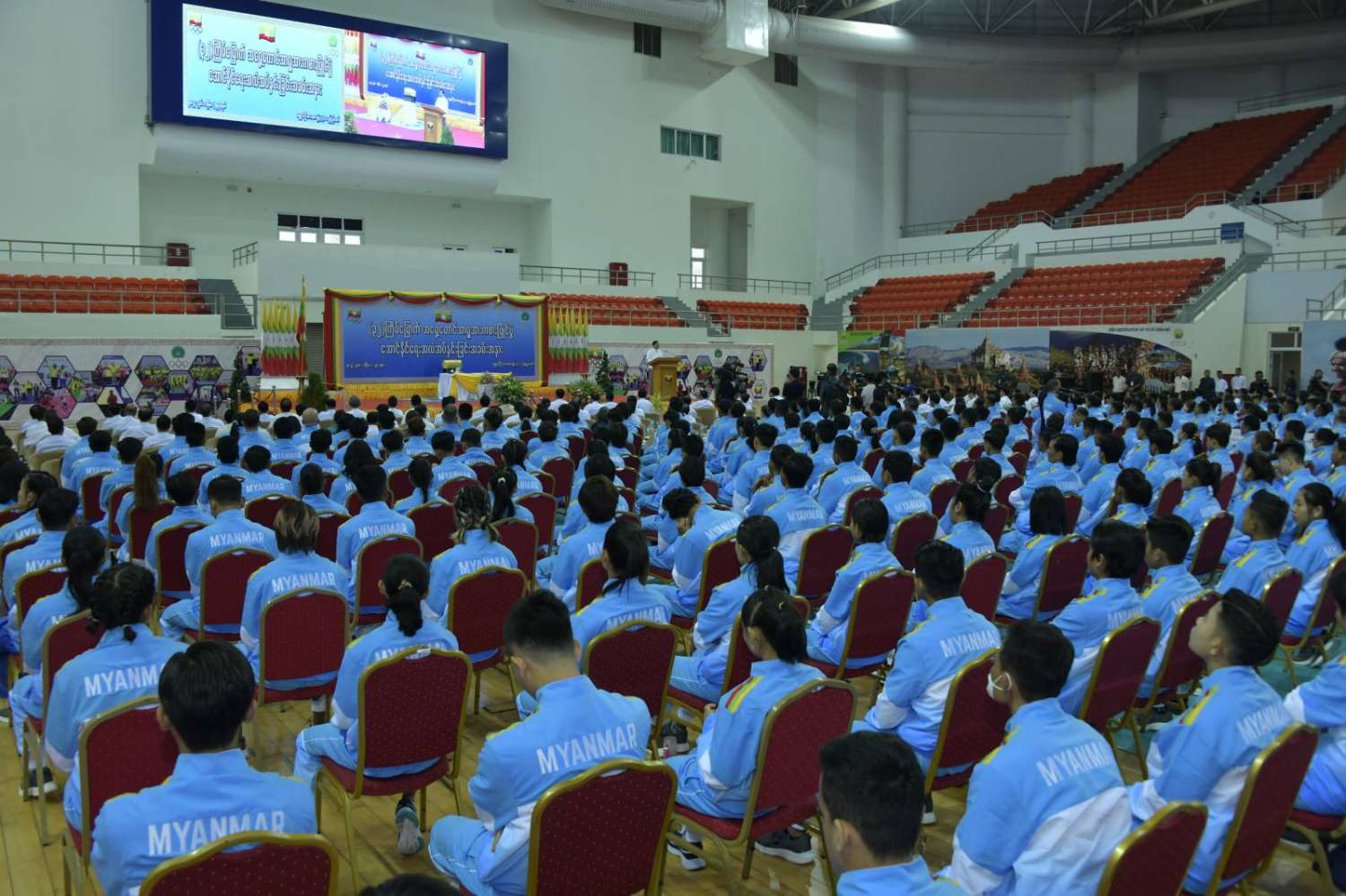 မိမိတို့ နိုင်ငံတော်စီမံအုပ်ချုပ်ရေးကောင်စီ တာဝန်ယူပြီးချမှတ်ဆောင်ရွက်နေသည့် ဦးတည်ချက်များထဲတွင် “နိုင်ငံ၏အခြေခံကျန်းမာရေးစောင့်ရှောက်မှုကို ပိုမိုခိုင်မာအောင် တည်ဆောက်၍ တစ်မျိုးသားလုံးသက်ရှည်ကျန်းမာသည့် ကျန်းမာရေးစနစ်ဖြစ်ပေါ်လာစေရေး” ဆိုသည့် လူမှုရေးဦးတည်ချက်ကိုချမှတ် ဆောင်ရွက်လျက်ရှိပါကြောင်း၊ တစ်မျိုးသားလုံး သက်ရှည်ကျန်းမာကြံ့ခိုင်ရေးအတွက် အားကစားကဏ္ဍသည် အရေးကြီးပါကြောင်း၊ “အားကစားမြှင့်တင်ခြင်းသည် နိုင်ငံတော်ကိုကာကွယ်စောင့်ရှောက်နေခြင်းဖြစ်သည်” ဆိုသည့် ဆောင်ပုဒ်အတိုင်းအားကစားစိတ်ဓာတ်သည် တိုင်းပြည်ချစ်စိတ်ကိုဖြစ်ပေါ်စေပြီး ထိုမှတစ်ဆင့်တိုင်းပြည်ကိုကာကွယ်စောင့်ရှောက်လိုသည့်စိတ် ပေါ်ပေါက်လာစေမည်ဖြစ်သည့်အတွက် အားကစားကဏ္ဍကိုအားပေးမြှင့်တင် ဆောင်ရွက်ပေးနေခြင်းဖြစ်ပါကြောင်း။
