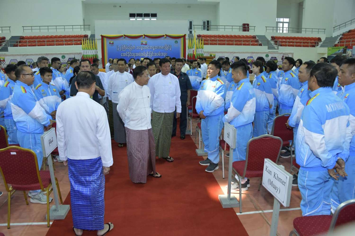 ဦးစွာနိုင်ငံတော်စီမံအုပ်ချုပ်ရေးကောင်စီဥက္ကဋ္ဌ၊ နိုင်ငံတော်ဝန်ကြီးချုပ်အား (၃၂) ကြိမ်မြောက် အရှေ့တောင်အာရှအားကစားပြိုင်ပွဲသို့ ၀င်ရောက်ယှဉ်ပြိုင်ကြမည့် မြန်မာအားကစားအဖွဲ့များက မိတ်ဆက်ဂါရဝပြုကြသည်။