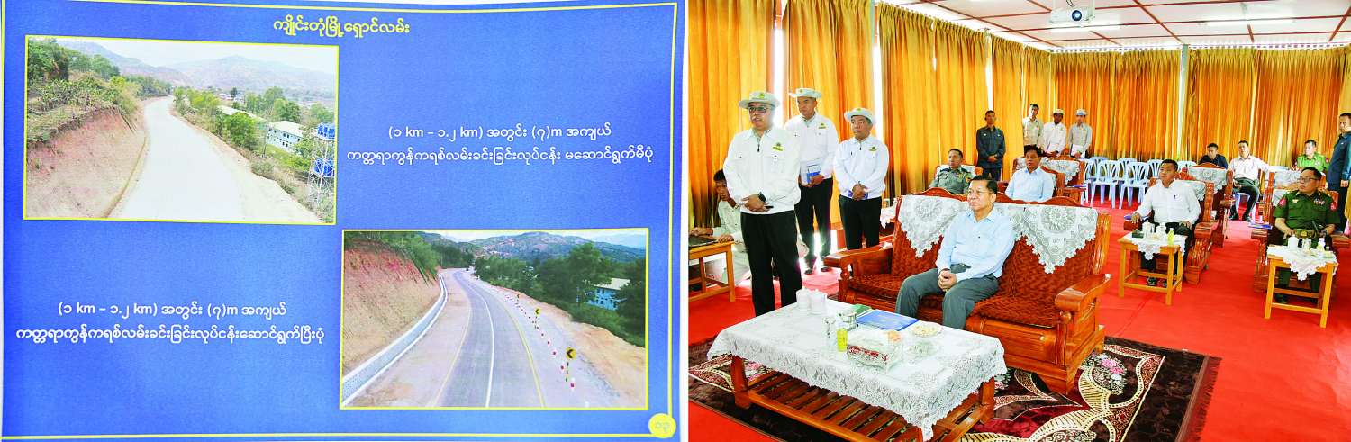 ထို့အပြင် ယနေ့နံနက်ပိုင်းတွင်လည်း နိုင်ငံတော်စီမံအုပ်ချုပ်ရေးကောင်စီဥက္ကဋ္ဌ နိုင်ငံတော်ဝန်ကြီး ချုပ်နှင့် အဖွဲ့ဝင်များသည် ကျိုင်းတုံမြို့ရှောင်လမ်း ဖောက်လုပ်ထားရှိမှုအခြေအနေများကို သွားရောက်ကြည့်ရှုစစ်ဆေးရာ ရှမ်းပြည်နယ် (အရှေ့ပိုင်း) လမ်းဦးစီးဌာန ညွှန်ကြားရေးမှူး ဦးရဲလင်းက လုပ်ငန်းဆောင်ရွက်မှုအခြေအနေများနှင့် ပတ်သက်၍ ရှင်းလင်းတင်ပြသည်။