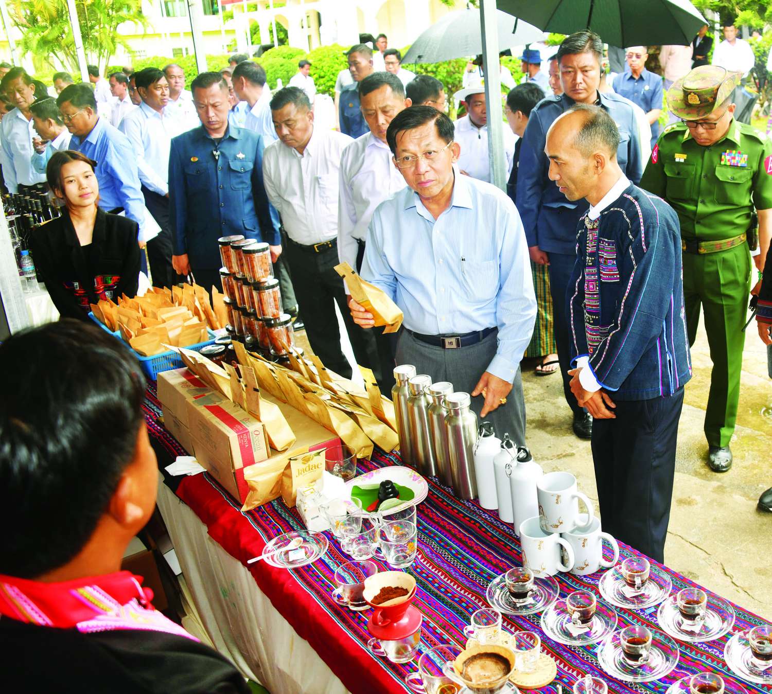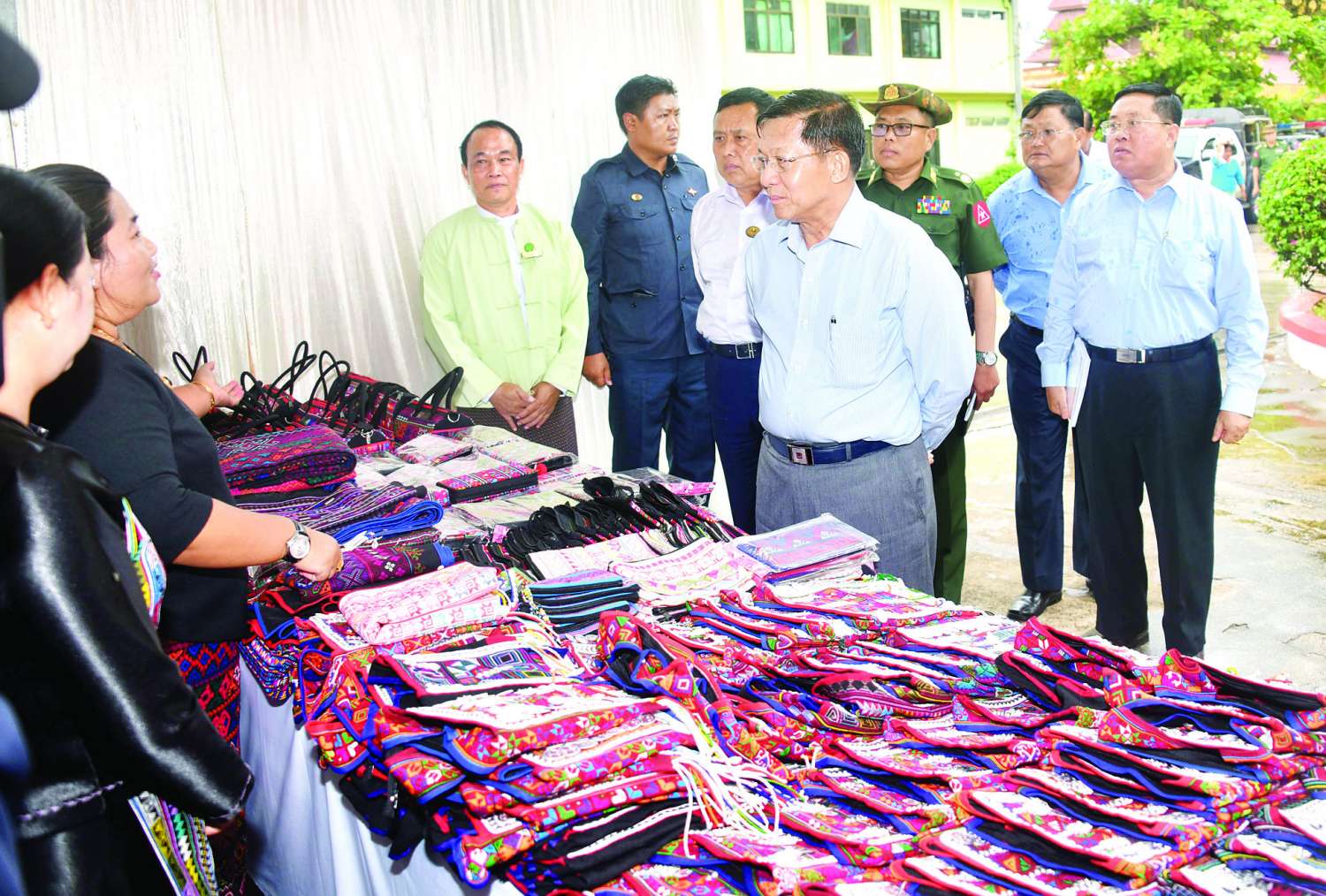 ထို့နောက် နိုင်ငံတော်စီမံအုပ်ချုပ်ရေးကောင်စီဥက္ကဋ္ဌ နိုင်ငံတော်ဝန်ကြီးချုပ်သည် ခင်းကျင်းပြသ ထားသည့် သယံဇာတတွင်းထွက်ထုတ်ကုန်များ၊ စားသောက်ကုန်၊ လူသုံးကုန်၊ စက်မှုလက်မှု ထုတ်ကုန်၊ ရိုးရာလက်မှုထုတ်ကုန်များ၊ အဝတ်အထည်များ၊ တိုင်းရင်းဆေးများ စသည့် ထုတ်ကုန်ပစ္စည်းများ ခင်းကျင်းပြသထားရှိမှုများကို ပြကွက်တစ်ခုချင်းစီအလိုက် စိတ်ဝင်တစားဖြင့် လေ့လာခဲ့ပြီး ဈေးကွက်ရရှိမှုအခြေအနေများကို မေးမြန်းဆွေးနွေးရာ လုပ်ငန်းအလိုက် စီးပွားရေး လုပ်ငန်းရှင်များက လိုက်လံ ရင်းလင်းတင်ပြခဲ့ကြသည်။