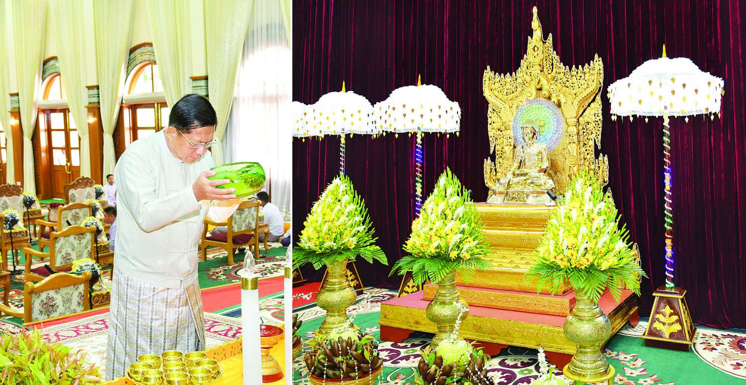 ဦးစွာ နိုင်ငံတော်စီမံအုပ်ချုပ်ရေးကောင်စီဥက္ကဋ္ဌ တပ်မတော်ကာကွယ်ရေးဦးစီးချုပ်က အနော်ရထာခန်းမအတွင်းရှိ ဗုဒ္ဓရုပ်ပွားတော်မြတ်အား ဖူးမြော်ကြည်ညို၍ မြသပိတ်ဆွမ်းတော်နှင့် ပန်း၊ ရေချမ်း၊ ဆီမီး တို့ကို ဆက်ကပ်လှူဒါန်းသည်။