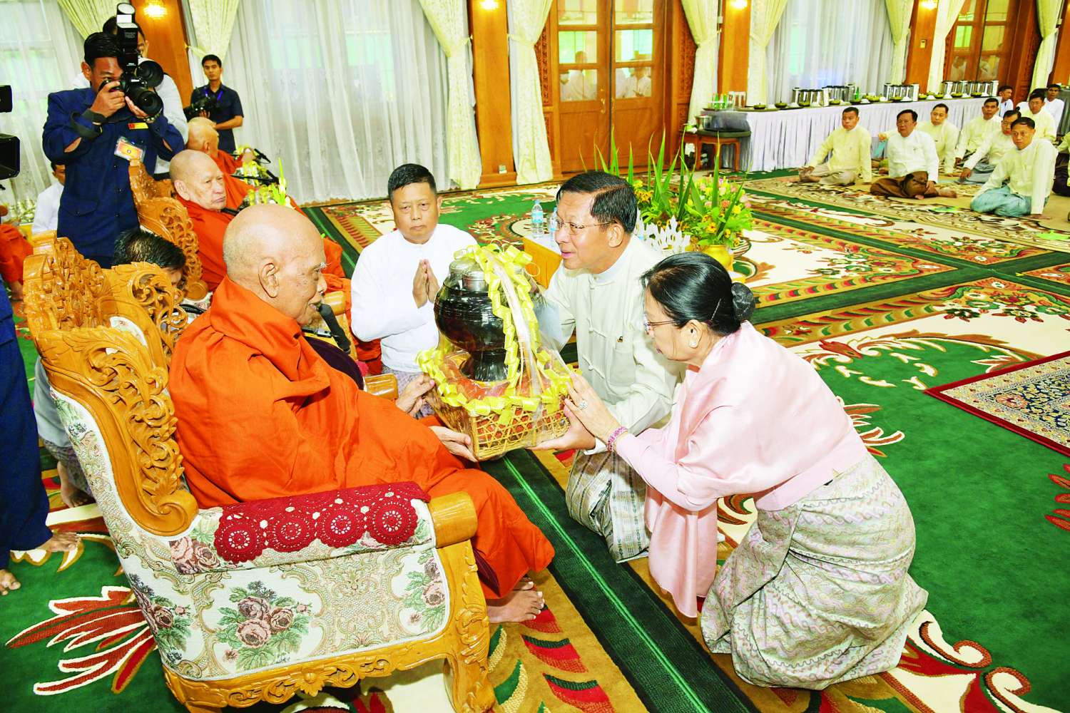 အဆိုပါ အခမ်းအနားသို့ နိုင်ငံတော်သံဃမဟာနာယကအဖွဲ့ အကျိုးတော်ဆောင် ရန်ကုန်တိုင်းဒေသကြီး သန်လျင်မြို့ မင်းကျောင်းပထမပြန် စာသင်တိုက်ပဓာနနာယက၊ အဂ္ဂမဟာပဏ္ဍိတ အဂ္ဂမဟာသဒ္ဓမ္မဇောတိကဓဇ ဒေါက်တာ ဘဒ္ဒန္တစန္ဒိမာဘိဝံသ ဆရာတော်ကြီးအမှူးပြုသော ဥပ္ပါတ သန္တိစေတီတော်ကြီး၏ ဩဝါဒါစရိယဆရာတော်ကြီးများအပါအဝင် ပင့်ဖိတ်ထားသည့် ဆရာတော်ကြီး ၂၇ ပါး ကြွရောက်ချီးမြှင့်တော်မူကြပြီး နိုင်ငံတော်စီမံအုပ်ချုပ်ရေးကောင်စီဥက္ကဋ္ဌ တပ်မတော်ကာကွယ်ရေးဦးစီးချုပ်နှင့် ဇနီးတို့နှင့်အတူ နိုင်ငံတော်စီမံအုပ်ချုပ်ရေးကောင်စီဒုတိယဥက္ကဋ္ဌ ဒုတိယတပ်မတော်ကာကွယ်ရေးဦးစီးချုပ် ကာကွယ်ရေးဦးစီးချုပ်(ကြည်း) ဒုတိယဗိုလ်ချုပ်မှူးကြီး စိုးဝင်းနှင့်ဇနီး ဒေါ်သန်းသန်းနွယ်၊ ညှိနှိုင်းကွပ်ကဲရေးမှူး(ကြည်း၊ ရေ၊ လေ) ဗိုလ်ချုပ်ကြီး မောင်မောင်အေးနှင့် ဇနီး၊ ကာကွယ်ရေးဦးစီးချုပ် (လေ)နှင့် ဇနီး၊ ပြည်ထောင်စုအဆင့်ပုဂ္ဂိုလ်များနှင့် ဇနီးများ၊ ကာကွယ်ရေးဦးစီးချုပ်ရုံးမှ အဆင့်မြင့်တပ်မတော်အရာရှိကြီးများနှင့်ဇနီးများ၊ တာဝန်ရှိသူများ တက်ရောက်ကြသည်။