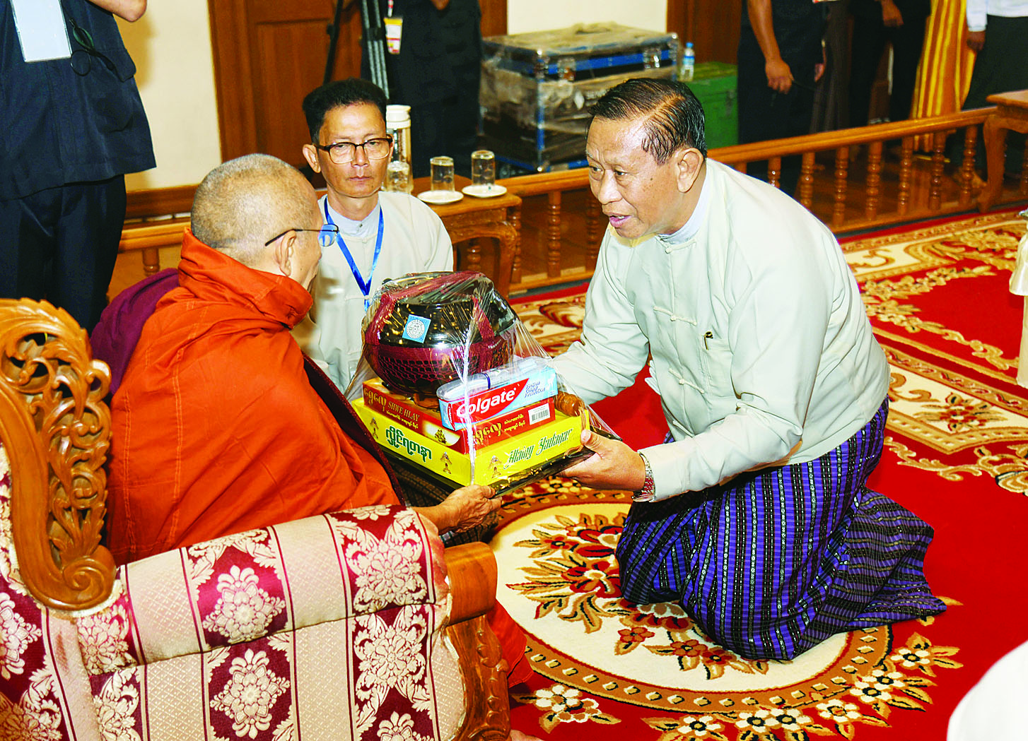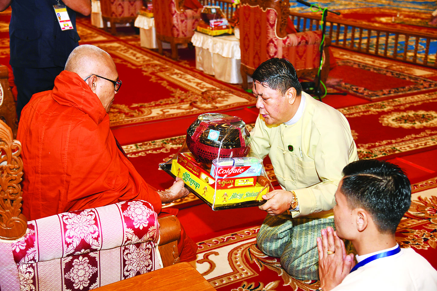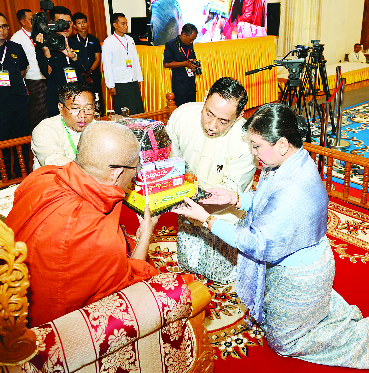 ထို့နောက် နိုင်ငံတော်စီမံအုပ်ချုပ်ရေးကောင်စီ ဒုတိယဥက္ကဋ္ဌ ဒုတိယဝန်ကြီးချုပ်နှင့်ဇနီးတို့က နိုင်ငံတော်သံဃမဟာနာယကအဖွဲ့ ဒုတိယဥက္ကဋ္ဌ၊ ရှမ်းပြည်နယ်၊ ကျောက်မဲမြို့၊ သီဟိုဠ်ပရိယတ္တိ စာသင်တိုက် ပဓာနနာယက၊ အဂ္ဂမဟာပဏ္ဍိတ ဒေါက်တာဘဒ္ဒန္တစန္ဒနသာရ ဆရာတော်ကြီးထံ ဝါဆိုသင်္ကန်းနှင့်လှူဖွယ်ပစ္စည်းများကို ဆက်ကပ်လှူဒါန်းသည်။ ဆက်လက်ပြီး ကောင်စီအတွင်းရေးမှူးနှင့်ဇနီး၊ တွဲဖက်အတွင်းရေးမှူးနှင့်ဇနီး၊ ကောင်စီဝင်များနှင့်ဇနီးများ၊ ပြည်ထောင်စုအဆင့် ပုဂ္ဂိုလ်များ၊ ပြည်ထောင်စုဝန်ကြီးများ၊ ညှိနှိုင်းကွပ်ကဲရေးမှူး(ကြည်း၊ ရေ၊လေ) နှင့် အဆင့်မြင့်တပ်မတော်အရာရှိကြီးများက ဆရာတော်၊ သံဃာတော်များထံ ဝါဆိုသင်္ကန်းနှင့်လှူဖွယ်ပစ္စည်းများကို အသီးသီးဆက်ကပ်လှူဒါန်းကြသည်။