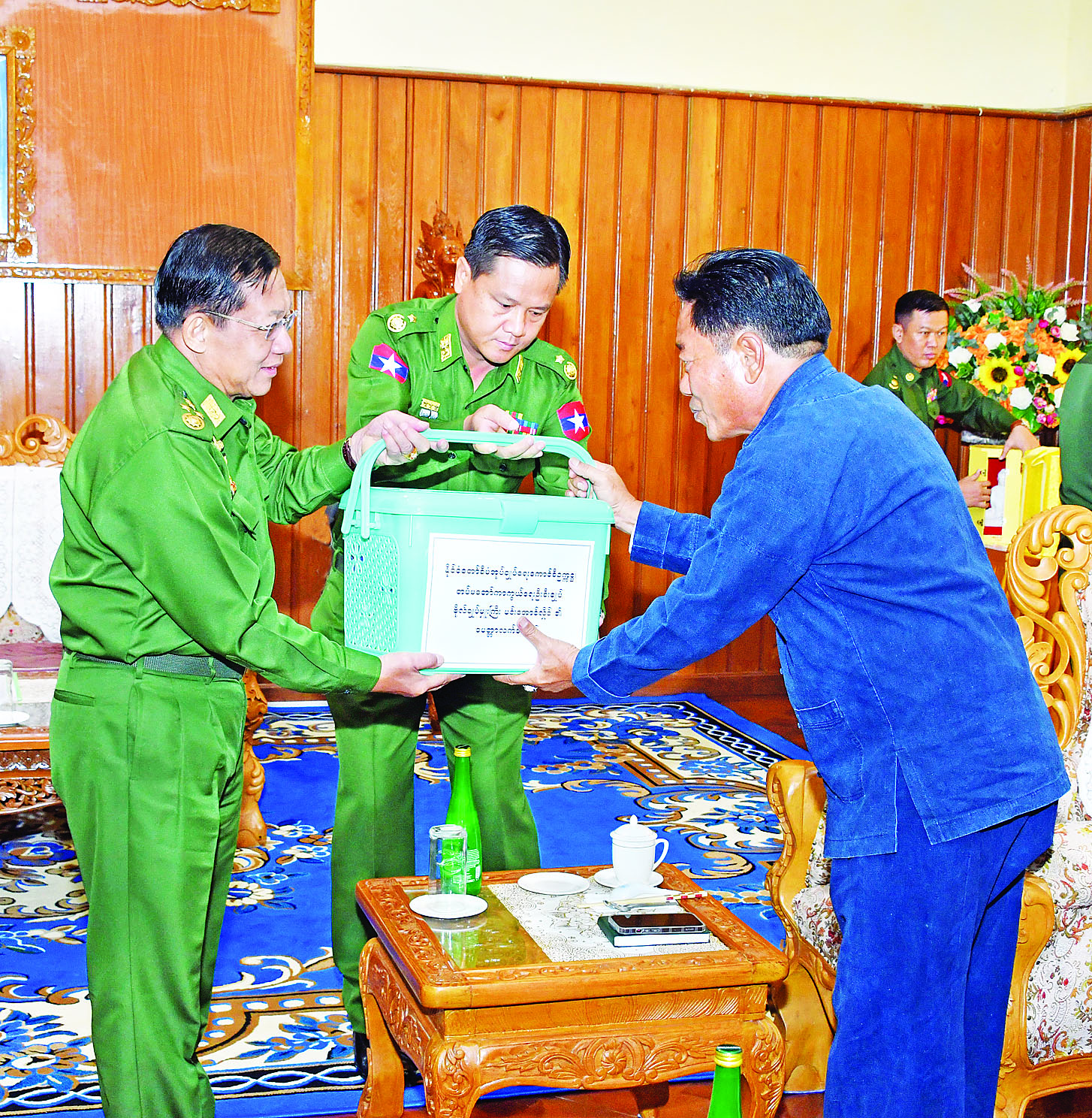 တွေ့ဆုံပွဲအပြီးတွင် နိုင်ငံတော်စီမံအုပ်ချုပ်ရေးကောင်စီဥက္ကဋ္ဌ တပ်မတော် ကာကွယ်ရေးဦးစီးချုပ်က တက်ရောက်လာကြသည့် ပြည်သူ့စစ်ဌာနေတပ်ဖွဲ့ဝင်များအား မာရဝိဇယဗုဒ္ဓရုပ်ပွားတော်မြတ်ပုံစံတူ ကျောက်ဆစ်ဗုဒ္ဓရုပ်ပွားတော်မြတ်များကို ဓမ္မလက်ဆောင်အဖြစ်နှင့် စားသောက်ဖွယ်ရာ ပစ္စည်းများကို ပေးအပ်ခဲ့ရာ အသီးသီး လက်ခံရယူခဲ့ကြပြီး ရင်းရင်းနှီးနှီး နှုတ်ဆက်ခဲ့ကြကြောင်း သတင်းရရှိသည်။