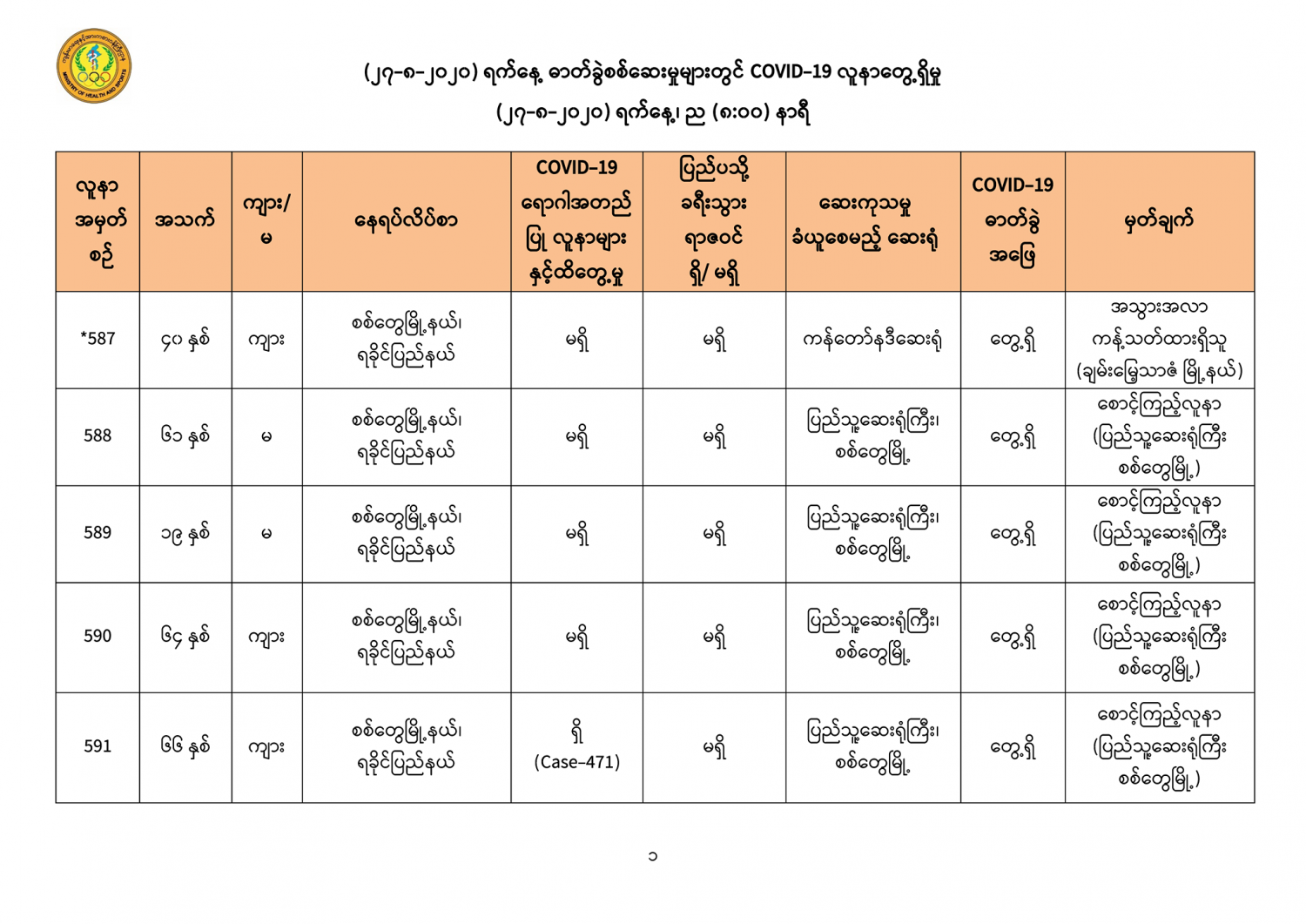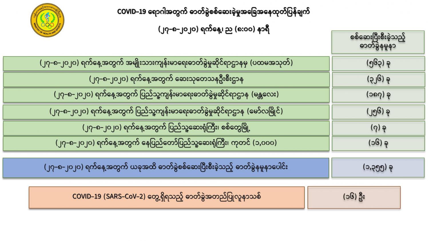 ၁။ (၂၇-၈-၂၀၂၀) ရက်နေ့အတွက် COVID-19 ရောဂါ ဓာတ်ခွဲစစ်ဆေးရာတွင် -