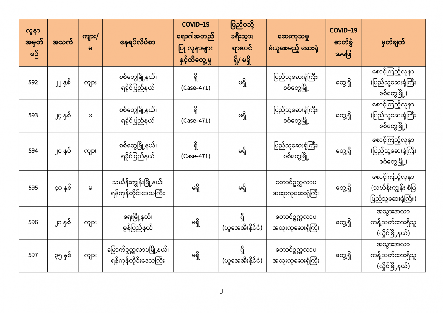 • COVID-19 ရောဂါ ဓာတ်ခွဲအတည်ပြုလူနာသစ် (၁၆) ဦး တွေ့ရှိရပါသည်။