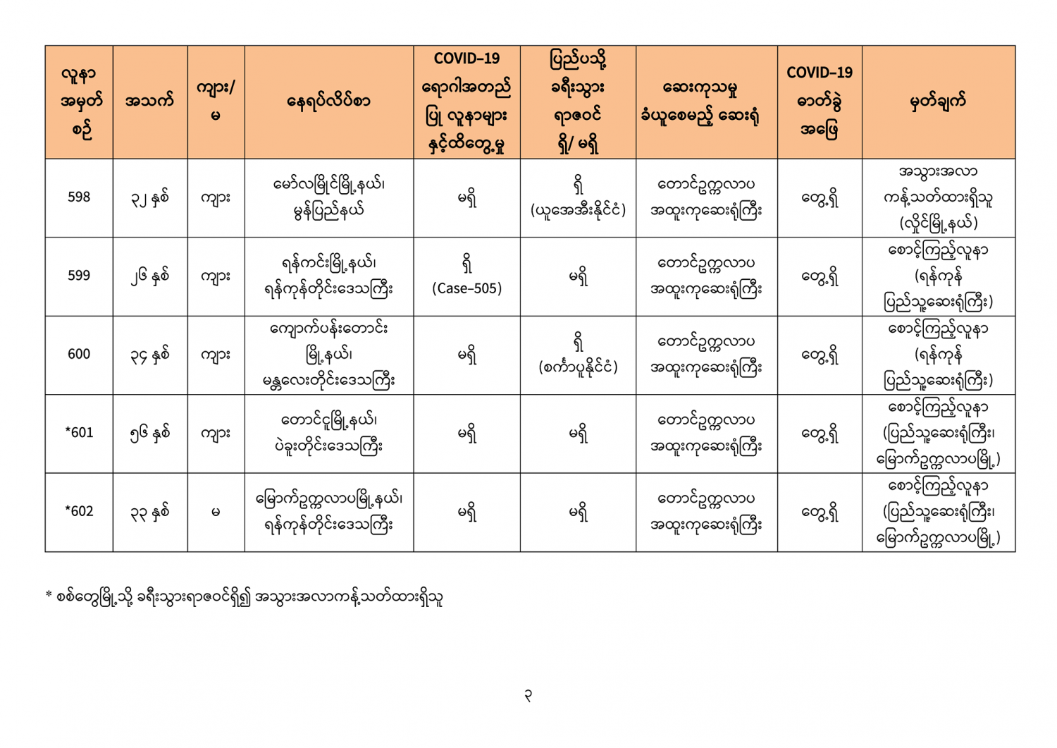 ၂။ (၂၇-၈-၂၀၂၀) ရက်နေ့၊ ည (၈:၀၀)နာရီအထိ မြန်မာနိုင်ငံတွင် COVID-19 ရောဂါဓာတ်ခွဲ အတည်ပြုလူနာ (၆၀၂) ဦးရှိပြီပါသည်။