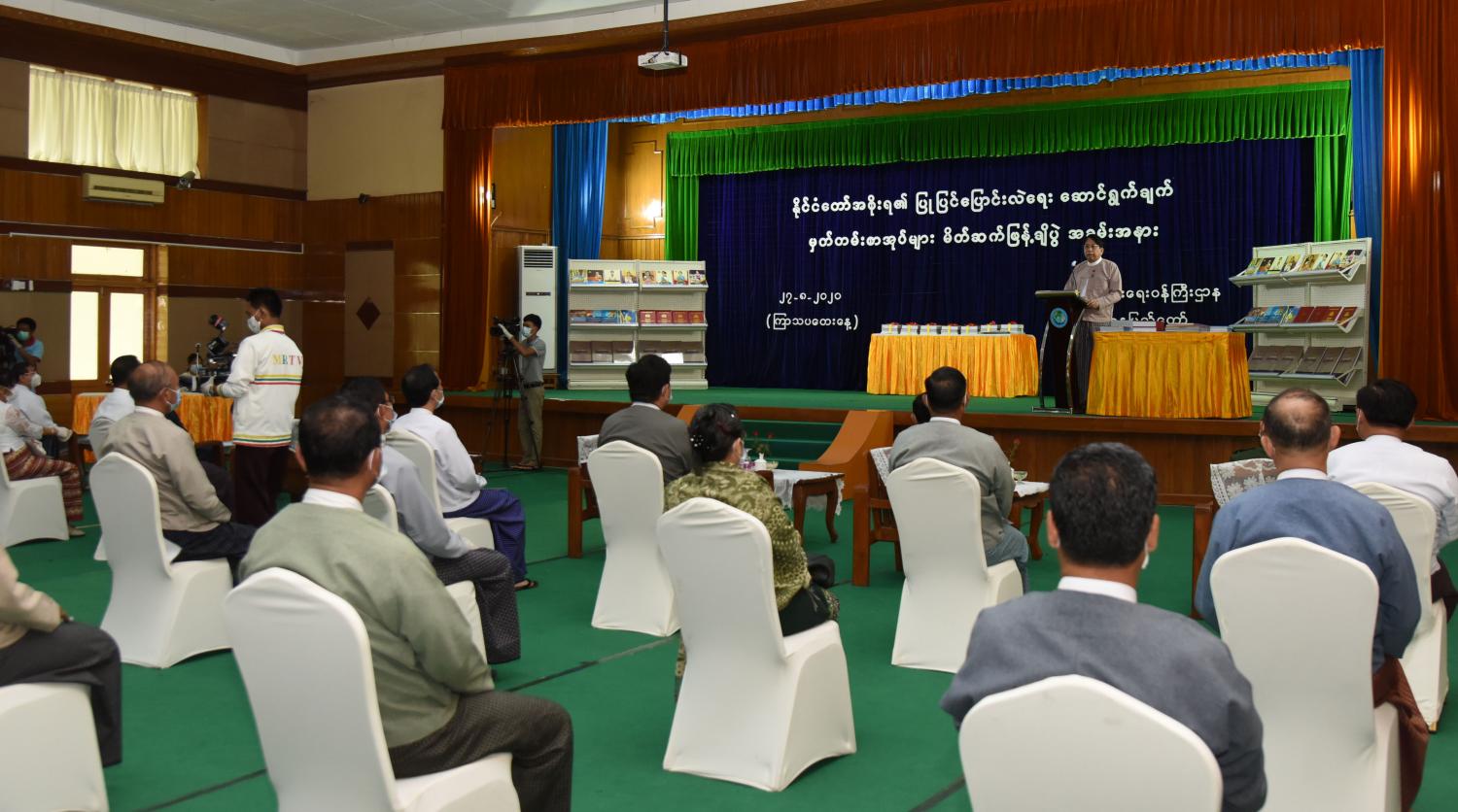ယနေ့မိတ်ဆက်ဖြန့်ချိသည့် နိုင်ငံတော်အစိုးရ၏ ပြုပြင်ပြောင်းလဲရေး ဆောင်ရွက်ချက် မှတ်တမ်း စာအုပ်များမှာ နိုင်ငံတော်သမ္မတ ဦးဝင်းမြင့် (၂၀၁၈) ခုနှစ်အတွင်း ပြောကြားခဲ့သည့် မိန့်ခွန်း၊ အမှာစကားနှင့် သဝဏ်လွှာများ၊ (၂၀၁၉) ခုနှစ်အတွင်း ပြောကြားခဲ့သည့် မိန့်ခွန်း၊ အမှာစကားနှင့် သဝဏ်လွှာများ၊ နိုင်ငံတော်သမ္မတ(ငြိမ်း) ဦးထင်ကျော် (၂၀၁၆၊ ၂၀၁၇၊ ၂၀၁၈) ခုနှစ်အတွင်း ပြောကြားခဲ့သည့် မိန့်ခွန်း၊ အမှာစကားနှင့် သဝဏ်လွှာများ၊ နိုင်ငံတော်၏ အတိုင်ပင်ခံပုဂ္ဂိုလ် ဒေါ်အောင်ဆန်းစုကြည် (၂၀၁၆) ခုနှစ်အတွင်း ပြောကြားခဲ့သည့် မိန့်ခွန်း၊ အမှာစကားနှင့် သဝဏ်လွှာများ၊ (၂၀၁၇) ခုနှစ်အတွင်း ပြောကြားခဲ့သည့် မိန့်ခွန်း၊ အမှာစကားနှင့် သဝဏ်လွှာ များ၊ (၂၀၁၈) ခုနှစ် အတွင်း ပြောကြားခဲ့သည့် မိန့်ခွန်း၊ အမှာစကားနှင့် သဝဏ်လွှာများ၊ (၂၀၁၉) ခုနှစ်အတွင်း ပြောကြားခဲ့သည့် မိန့်ခွန်း၊ အမှာစကားနှင့် သဝဏ်လွှာများ၊ နိုင်ငံတော်၏ အတိုင်ပင်ခံပုဂ္ဂိုလ် ဒေါ်အောင်ဆန်းစုကြည် လျှောက်လှမ်းခဲ့သော ပြည်ထောင်စုခရီးလမ်း (၂၀၁၆ - ၂၀၂၀)၊ ပြည်သူ့အတွက် ပထမရက် (၁၀၀)၊ ပထမ တစ်နှစ်တာ၊ ဒုတိယတစ်နှစ်တာ၊ တတိယ တစ်နှစ်တာ၊ စတုတ္ထ တစ်နှစ်တာ၊ နိုင်ငံတော်အစိုးရ၏ လေးနှစ်တာကာလ ပြည်သူ့အတွက် ပြုပြင် ပြောင်းလဲတိုးတက်ရေး ဆောင်ရွက်ချက်များ (၂၀၁၆ - ၂၀၂၀) (ပထမတွဲ) (ဒုတိယတွဲ)၊ ပြည်ထောင်စု ငြိမ်းချမ်းရေးညီလာခံ - (၂၁) ရာစု ပင်လုံ(ပထမအကြိမ်) အစည်းအဝေး၊ (ဒုတိယ အကြိမ်) အစည်းအဝေးနှင့် (တတိယအကြိမ်) အစည်းအဝေး မှတ်တမ်းစာအုပ်များ ဖြစ်သည်။