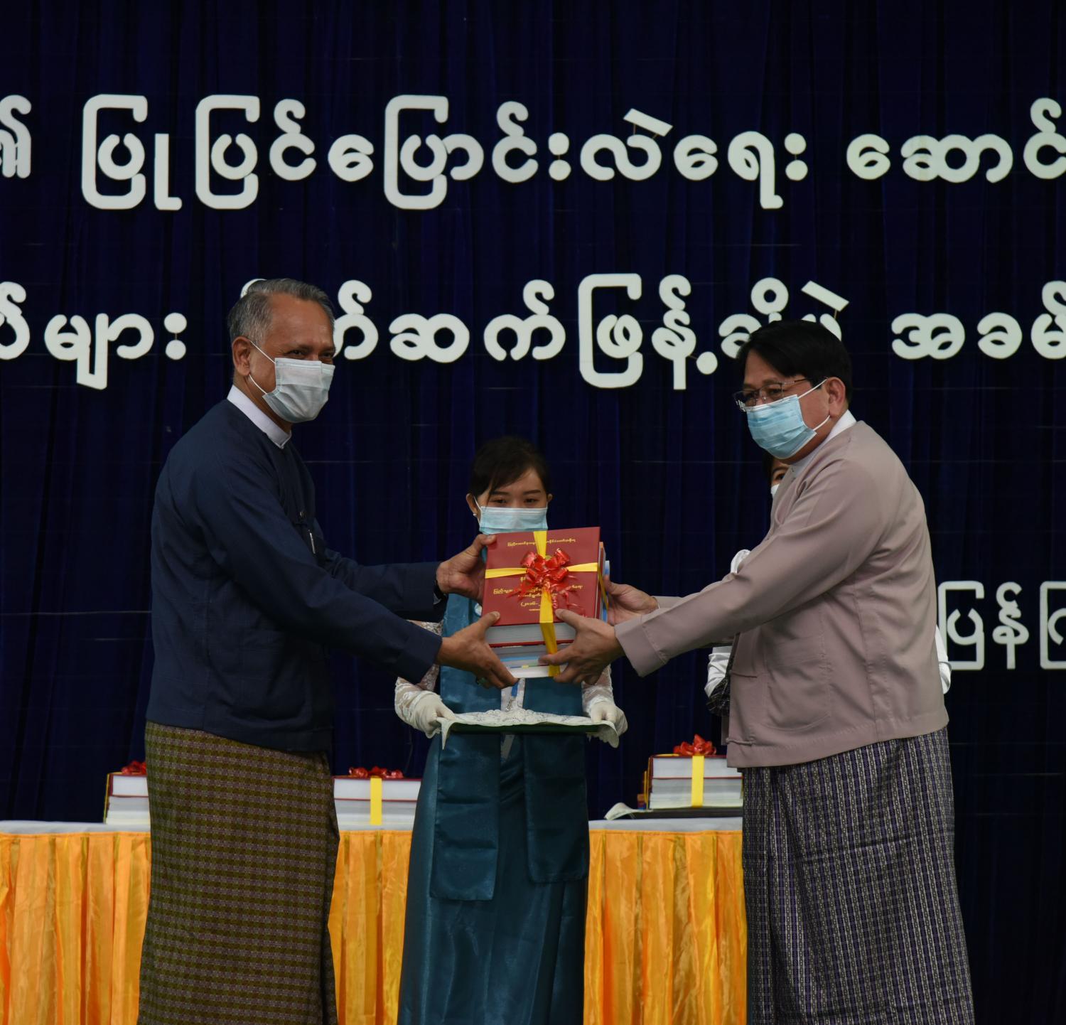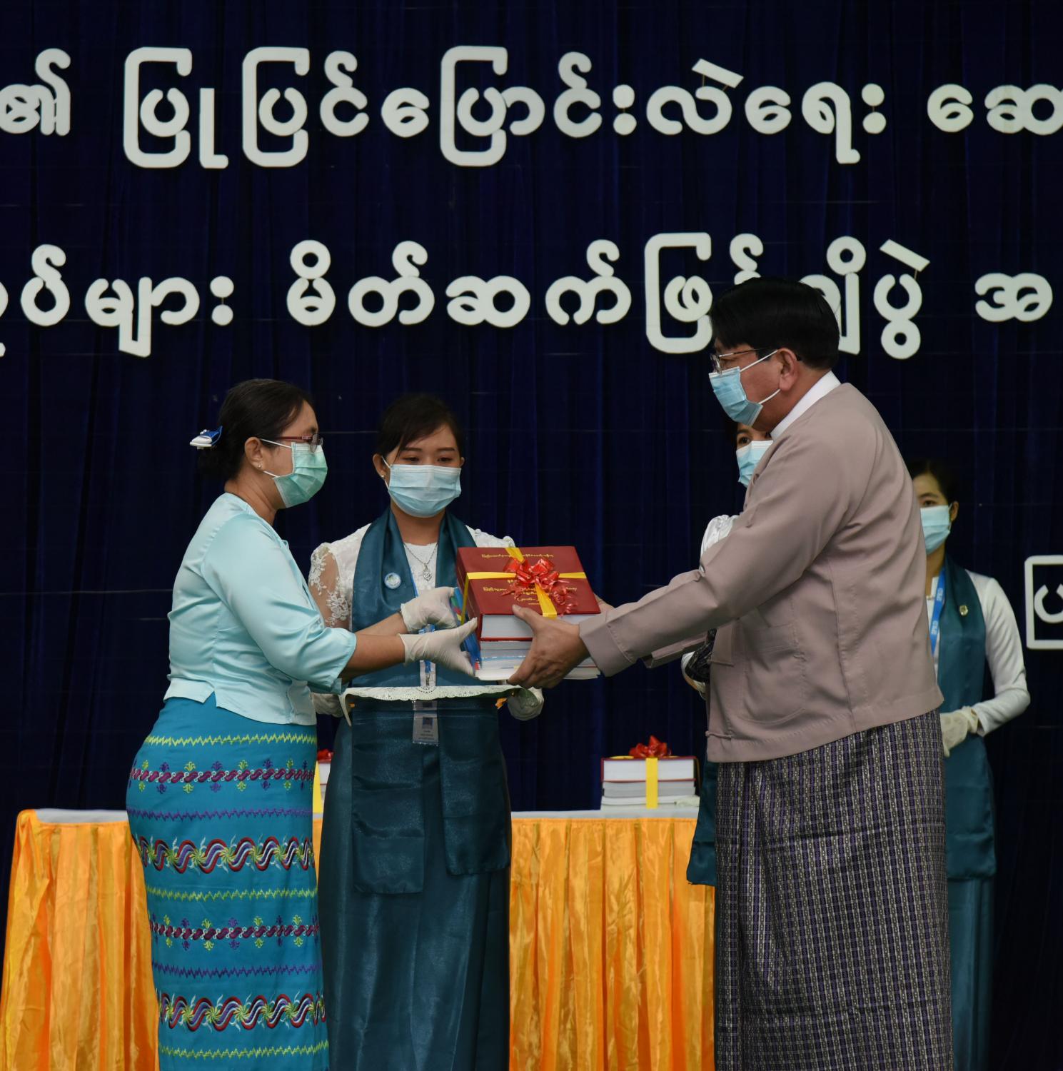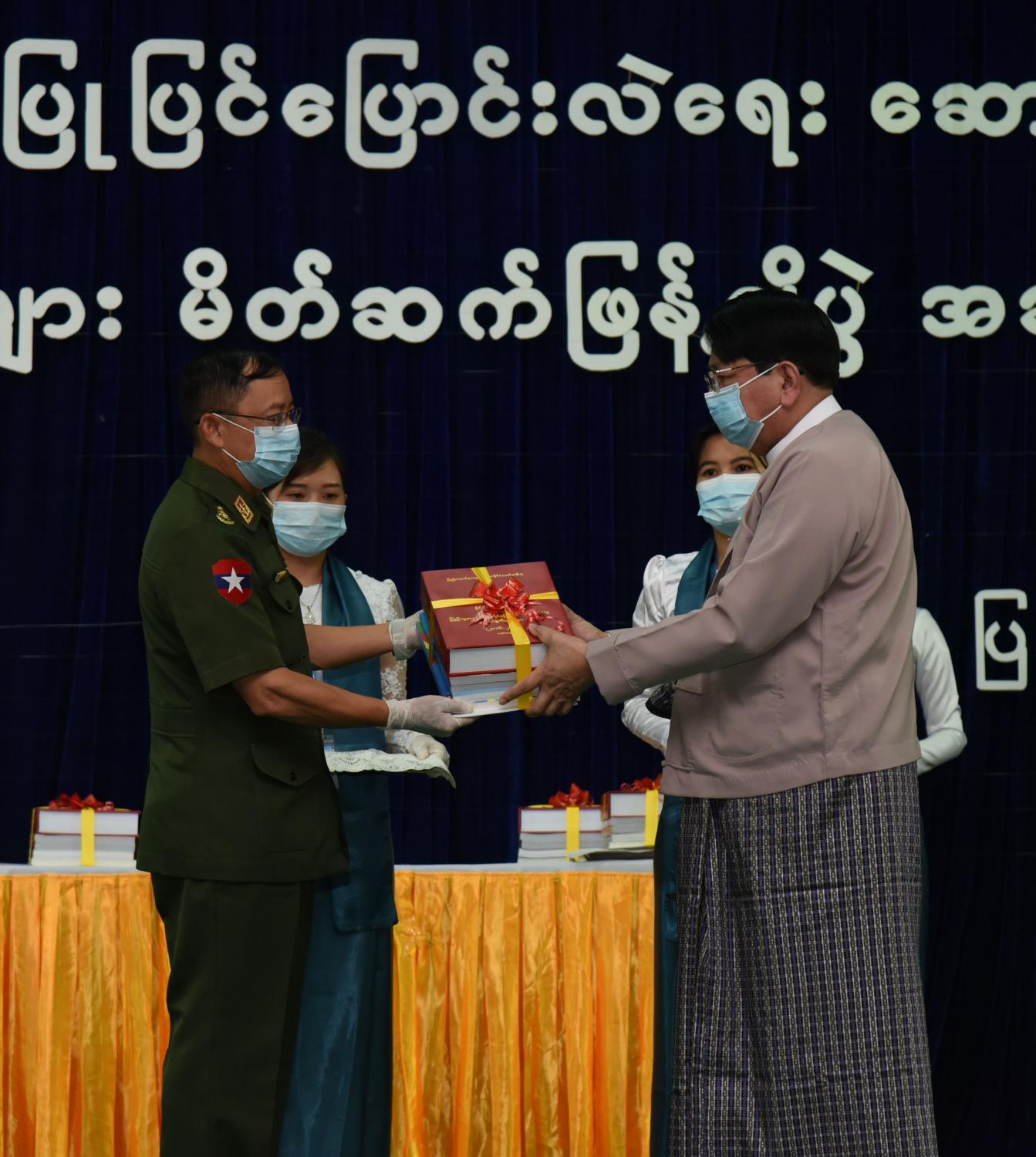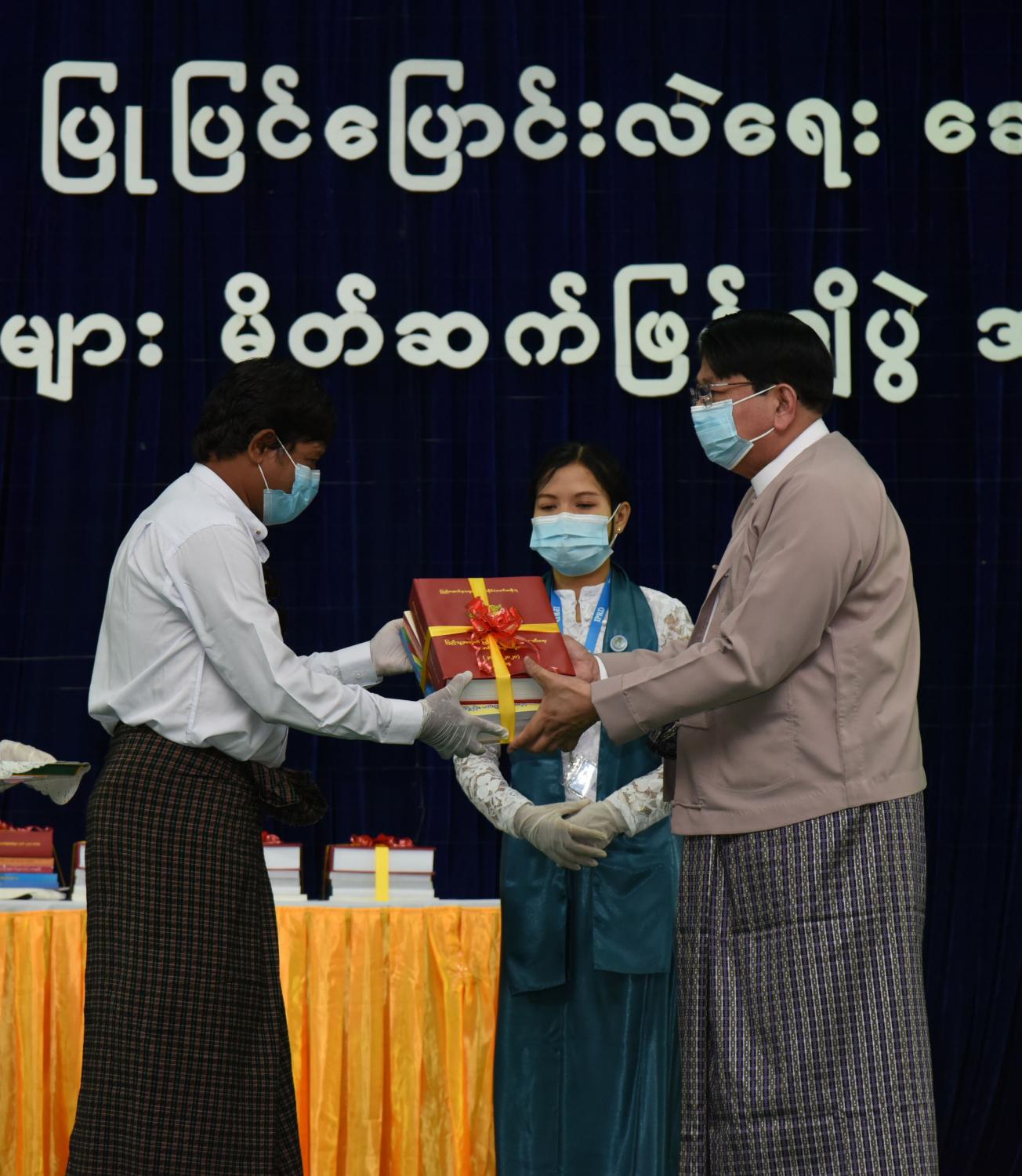 ထို့နောက် မှတ်တမ်းစာအုပ်များကို ပြည်ထောင်စုဝန်ကြီး ဒေါက်တာဖေမြင့်က ဥပဒေပြုရေးမဏ္ဍိုင် ကိုယ်စား ပြည်ထောင်စုလွှတ်တော်ရုံး အမြဲတမ်းအတွင်းဝန် ဦးကျော်စိုးအား လည်းကောင်း၊ အုပ်ချုပ်ရေးမဏ္ဍိုင်ကိုယ်စား ရင်းနှီးမြှုပ်နှံမှုနှင့် နိုင်ငံခြားစီးပွား ဆက်သွယ်ရေးဝန်ကြီးဌာန အမြဲတမ်းအတွင်းဝန် ဦးအောင်နိုင်ဦး အားလည်းကောင်း၊ တရားစီရင်ရေးမဏ္ဍိုင် ကိုယ်စား ပြည်ထောင်စုရှေ့နေချုပ်ရုံး ဒုတိယအမြဲတမ်း အတွင်းဝန် ဦးသန့်စင်အား လည်းကောင်း၊ တပ်မတော်သတင်းမှန် ပြန်ကြားရေးအဖွဲ့ကိုယ်စား တပ်မတော်ကာကွယ်ရေး ဦးစီးချုပ်ရုံးမှ ဗိုလ်မှူးကြီး စိုးသန်းအားလည်းကောင်း၊ အမျိုးသား မှတ်တမ်းများ မော်ကွန်းတိုက်ဦးစီးဌာနမှ ဒုတိယညွှန်ကြားရေးမှူးချုပ် ဒေါက်တာ မျိုးမင်းကြည်ဝင်း အားလည်းကောင်း၊ အမျိုးသား စာကြည့်တိုက်မှ ညွှန်ကြားရေးမှူး ဒေါ်မြဦး အားလည်းကောင်း၊ သတင်းမီဒီယာများ ကိုယ်စား လျှပ်တပြက်ဂျာနယ်မှ နေပြည်တော် တာဝန်ခံ ရဲရဲ (ပျဉ်းမနား) အားလည်းကောင်း ပေးအပ်သည်။