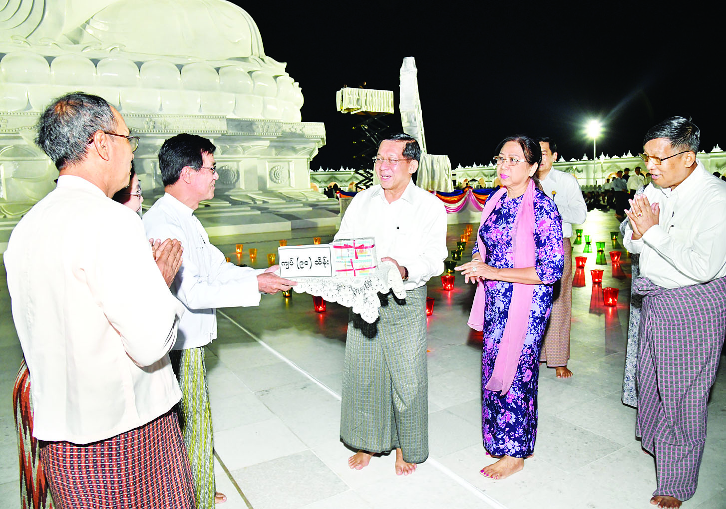 ယင်းနောက် နိုင်ငံတော်စီမံအုပ်ချုပ်ရေးကောင်စီဥက္ကဋ္ဌ နိုင်ငံတော်ဝန်ကြီးချုပ်နှင့် ဇနီးတို့သည် မာရဝိဇယဗုဒ္ဓရုပ်ပွားတော်မြတ်ကြီးအား ဖူးမြော်ကြည်ညိုပြီး ပန်း၊ ရေချမ်းနှင့် ဆီမီးများကပ်လှူပူဇော်ကာ ရင်ပြင်တော်ကြီးပေါ်၌ လှည့်လည်ဖူးမြော်ကြည်ညို၍ တက်ရောက်လာကြသူများနှင့်အတူ ဆီမီး ၉၀၀၀ ကို အတူတကွထွန်းညှိပူဇော်ပြီး မာရဝိဇယဗုဒ္ဓရုပ်ပွားတော်မြတ်ကြီး တန်ဆောင်တိုင်ပွဲတော်သို့ လာရောက်ကြသူများနှင့် ဘုရားဖူးလာရဟန်းရှင်လူပြည်သူများအား ခင်မင်ရင်းနှီးစွာဖြင့်နှုတ်ဆက်ကြသည်။