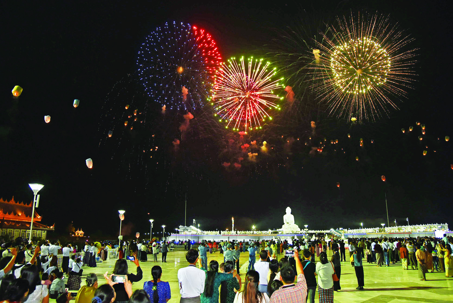 ဦးစွာ နိုင်ငံတော်စီမံအုပ်ချုပ်ရေးကောင်စီဥက္ကဋ္ဌ နိုင်ငံတော်ဝန်ကြီးချုပ်နှင့် ဇနီး၊ အခမ်းအနားတက်ရောက်လာကြသူများသည် မာရဝိဇယဗုဒ္ဓရုပ်ပွားတော်မြတ်ကြီးအား မီးရှူးမီးပန်းများဖြင့် ပစ်ဖောက်ပူဇော်မှုများနှင့် မီးပုံးပျံများ လွှတ်တင်မှုကိုကြည့်ရှုကြသည်။ မီးရှူးမီးပန်းများ ပစ်ဖောက်ပူဇော်ချိန်နှင့် မီးပုံးပျံများလွှတ်တင်ချိန်၌ မီးပုံးပျံငယ်များကိုလည်း တစ်ချိန်တည်းလွှတ်တင်ကြသည်။