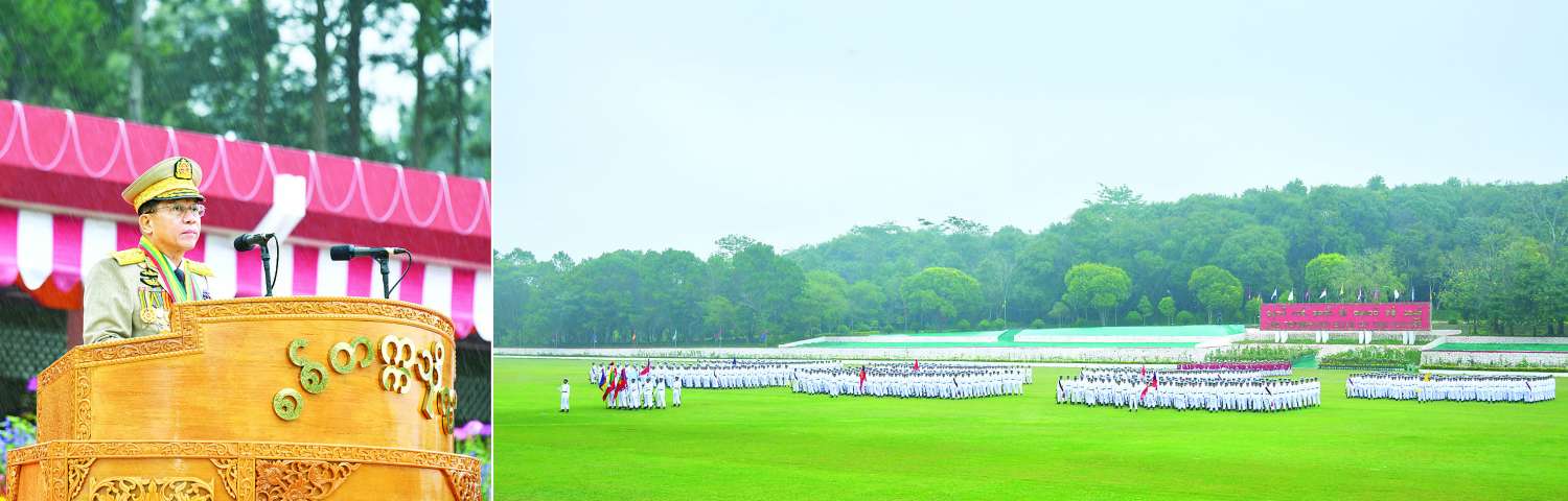 စစ်တက္ကသိုလ် ဗိုလ်လောင်းသင်တန်းအမှတ်စဉ် (၆၅) သင်တန်းဆင်းဂုဏ်ပြု စစ်ရေးပြအခမ်းအနားကို ယနေ့နံနက်ပိုင်းတွင် ပြင်ဦးလွင်မြို့ စစ်တက္ကသိုလ် စစ်ရေးပြကွင်း၌ ကျင်းပပြုလုပ်ရာ နိုင်ငံတော်စီမံအုပ်ချုပ်ရေးကောင်စီဥက္ကဋ္ဌ တပ်မတော်ကာကွယ်ရေးဦးစီးချုပ် ဗိုလ်ချုပ်မှူးကြီး သတိုးမဟာသရေစည်သူ သတိုးသီရိသုဓမ္မ မင်းအောင်လှိုင် တက်ရောက်မိန့်ခွန်းပြောကြားသည်။