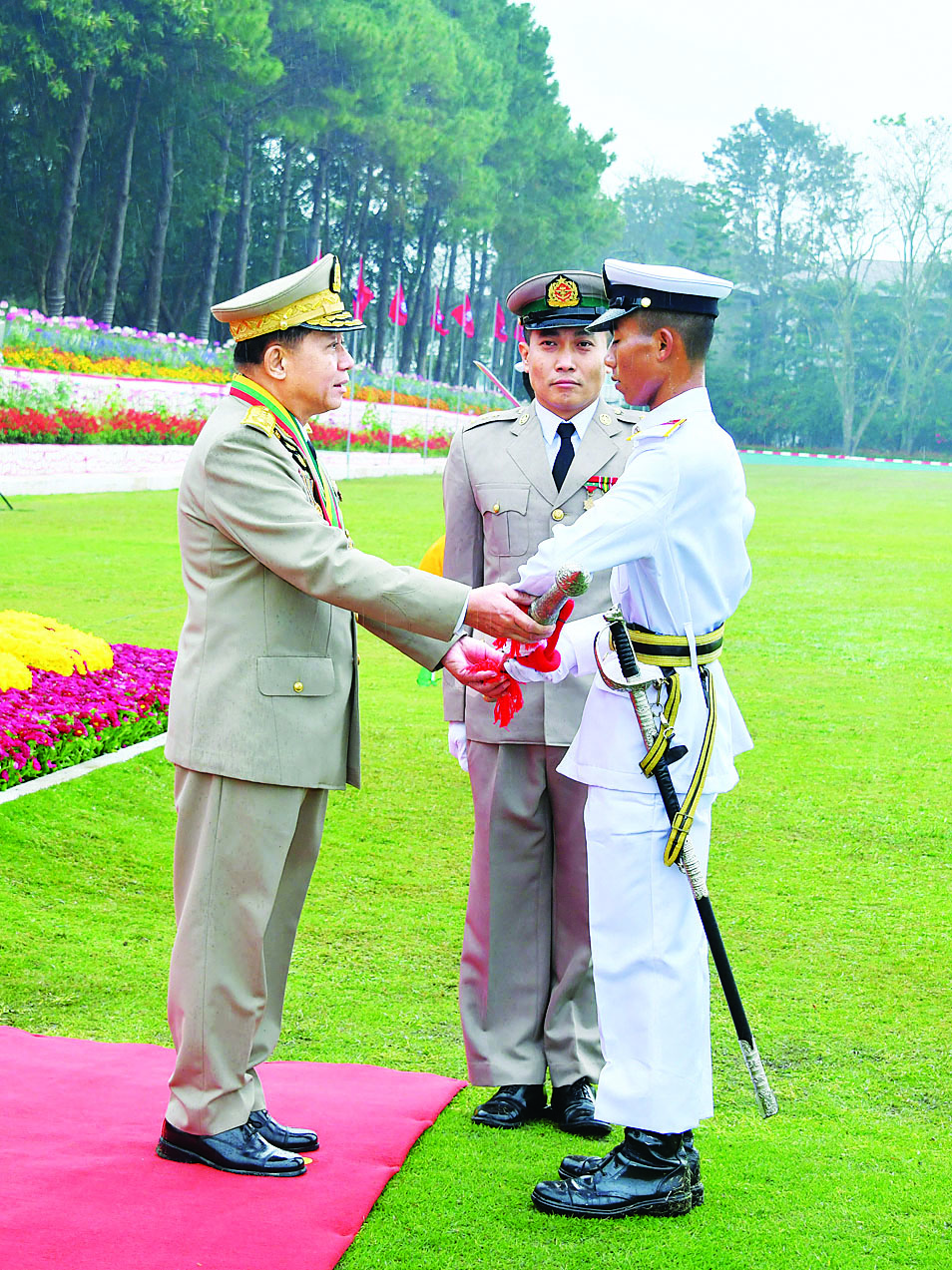 ဦးစွာ နိုင်ငံတော်စီမံအုပ်ချုပ်ရေးကောင်စီဥက္ကဋ္ဌ တပ်မတော်ကာကွယ်ရေးဦးစီးချုပ် ဗိုလ်ချုပ်မှူးကြီး သတိုးမဟာသရေစည်သူ သတိုးသီရိသုဓမ္မ မင်းအောင်လှိုင်သည် ဗိုလ်လောင်းတပ်ခွဲများ၏ အလေးပြုခြင်းကိုခံယူပြီး ကျောင်းဆင်းဗိုလ်လောင်းတပ်ခွဲများကို စစ်ဆေးသည်။