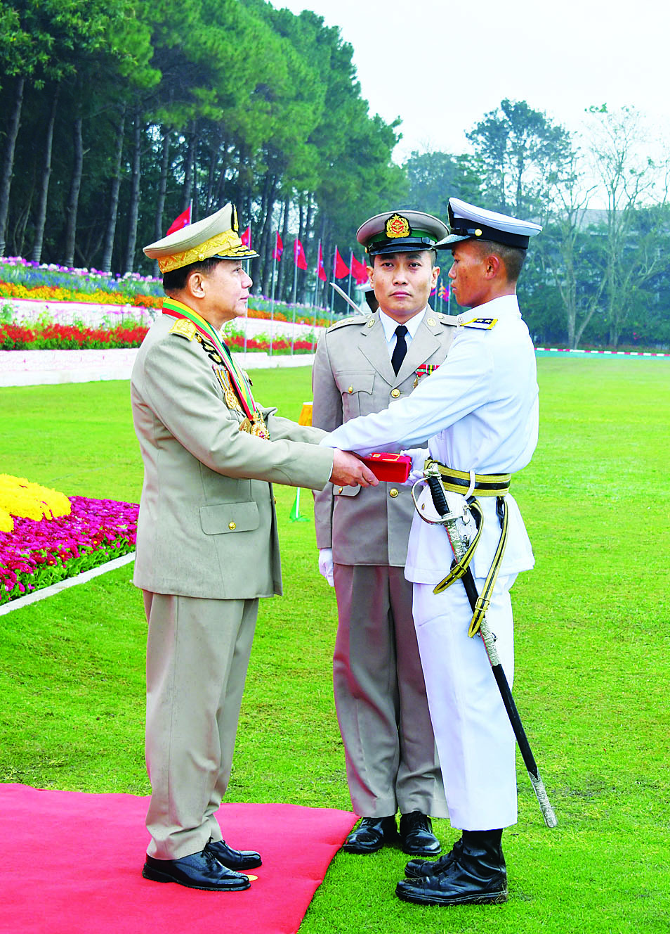 ယင်းနောက် နိုင်ငံတော်စီမံအုပ်ချုပ်ရေးကောင်စီဥက္ကဋ္ဌ တပ်မတော်ကာကွယ်ရေးဦးစီးချုပ် ဗိုလ်ချုပ်မှူးကြီး သတိုးမဟာသရေစည်သူ သတိုးသီရိသုဓမ္မ မင်းအောင်လှိုင်သည် ဗိုလ်လောင်းတပ်ခွဲများ၏ အလေးပြုခြင်းကိုခံယူပြီး စစ်ရေးပြအခမ်းအနားမှ ပြန်လည်ထွက်ခွာသည်။