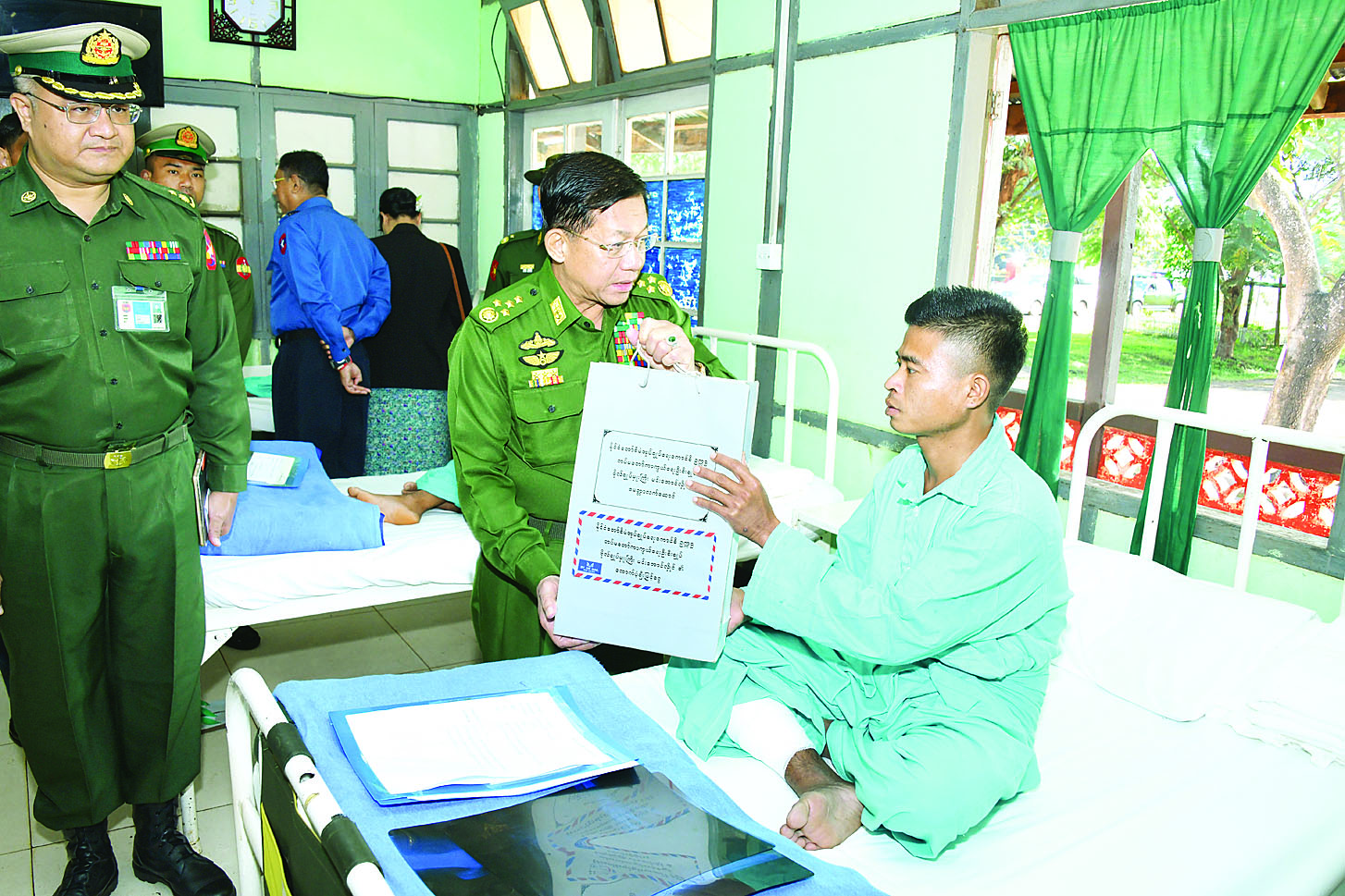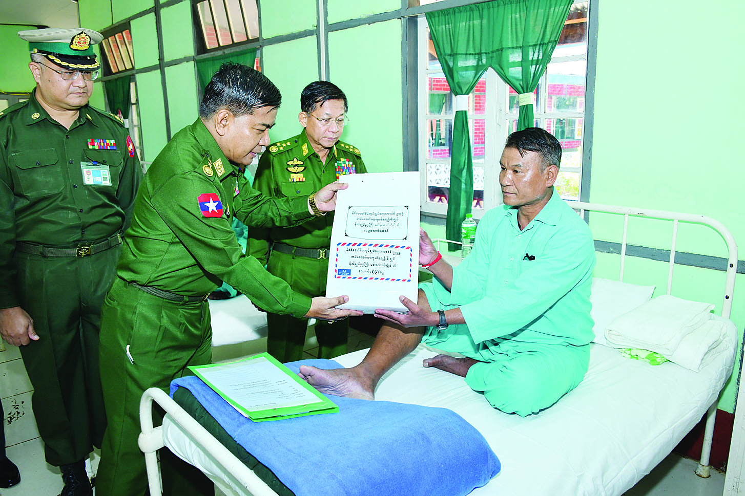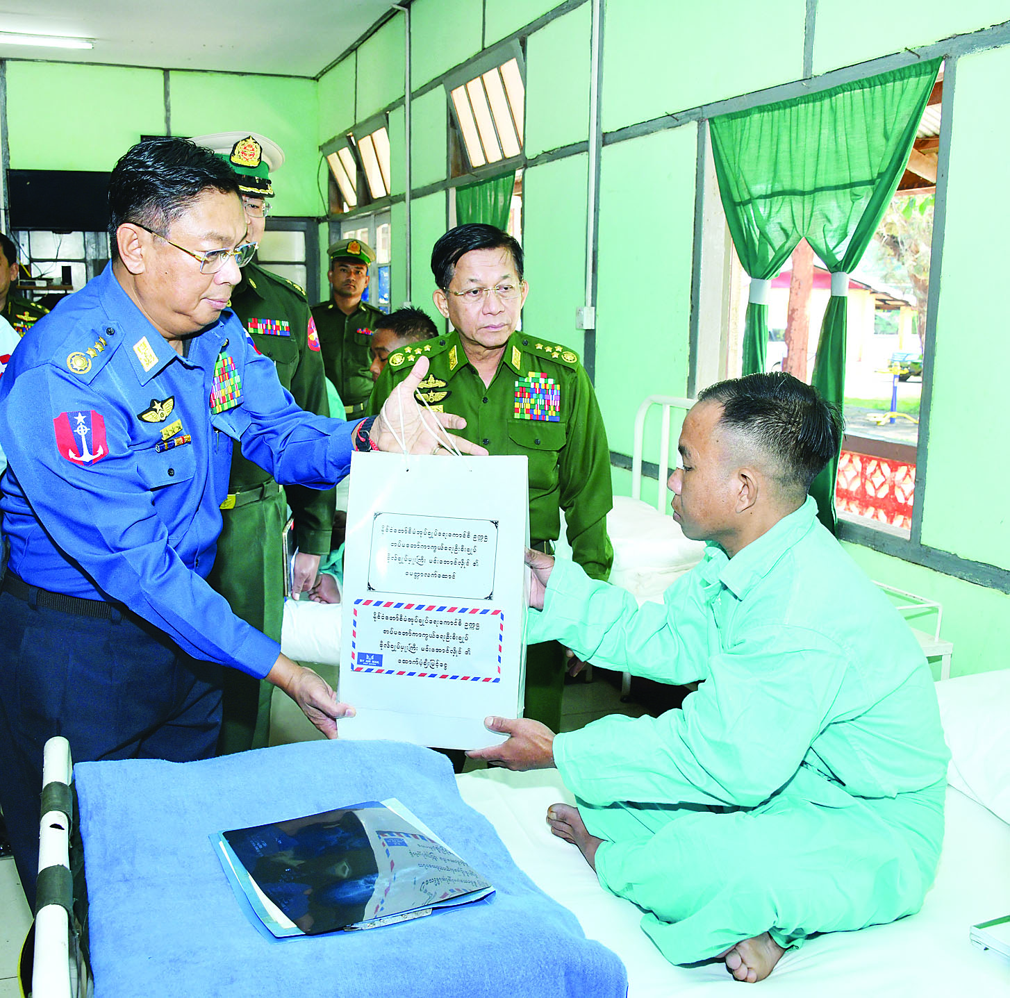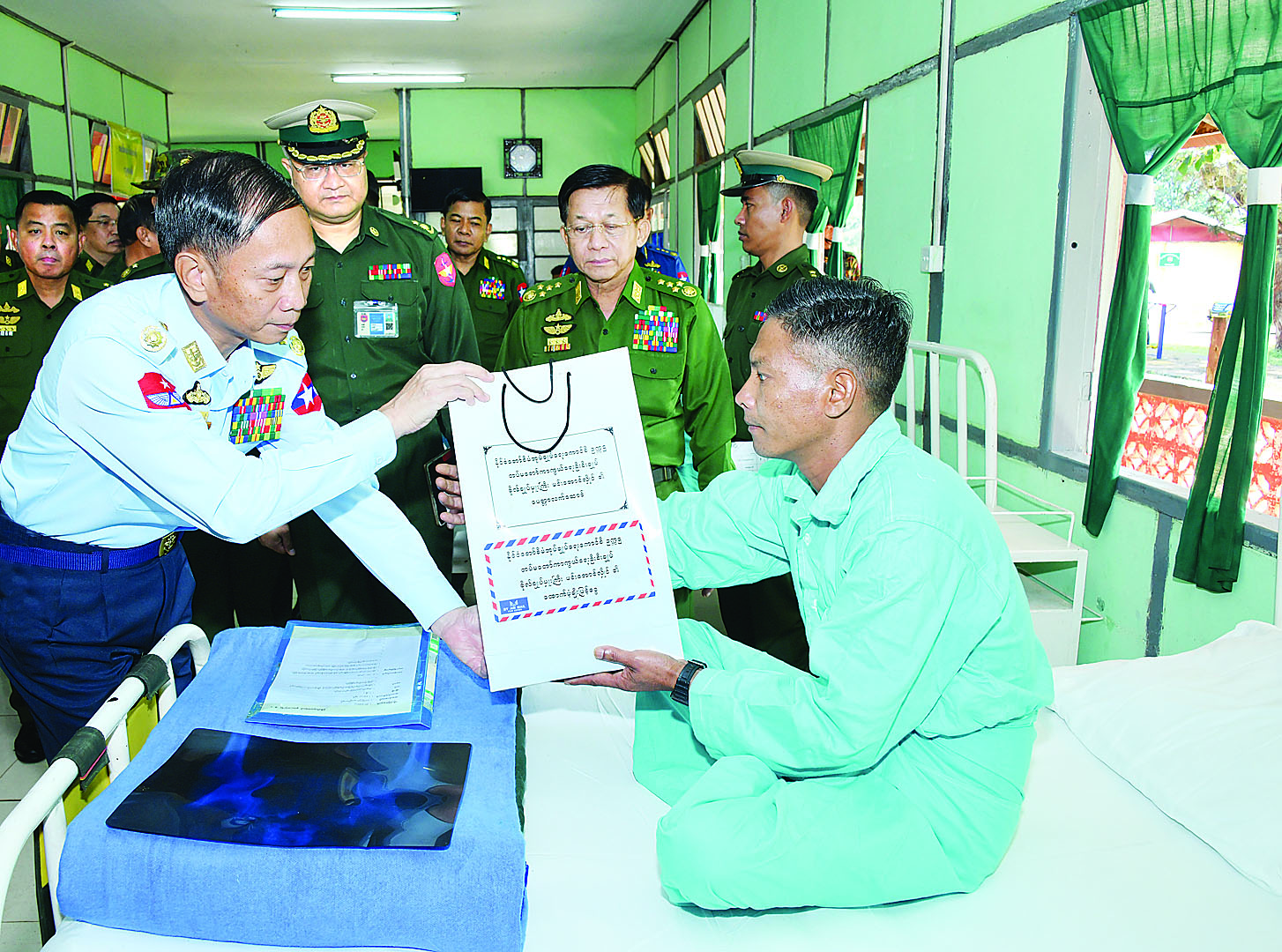 ယင်းနောက် နိုင်ငံတော်စီမံအုပ်ချုပ်ရေးကောင်စီဥက္ကဋ္ဌ တပ်မတော်ကာကွယ်ရေးဦးစီးချုပ်နှင့် ဇနီး၊ အဖွဲ့ဝင်များသည် ဆေးရုံတက်ရောက်ကုသမှုခံယူလျက်ရှိသည့် အရာရှိ၊ စစ်သည်များ၊ မြန်မာနိုင်ငံရဲတပ်ဖွဲ့ဝင်များ၊ မိသားစုဝင်များအား ဂုဏ်ပြုချီးမြှင့်ငွေနှင့် လက်ဆောင်ပစ္စည်းများ ပေးအပ်သည်။